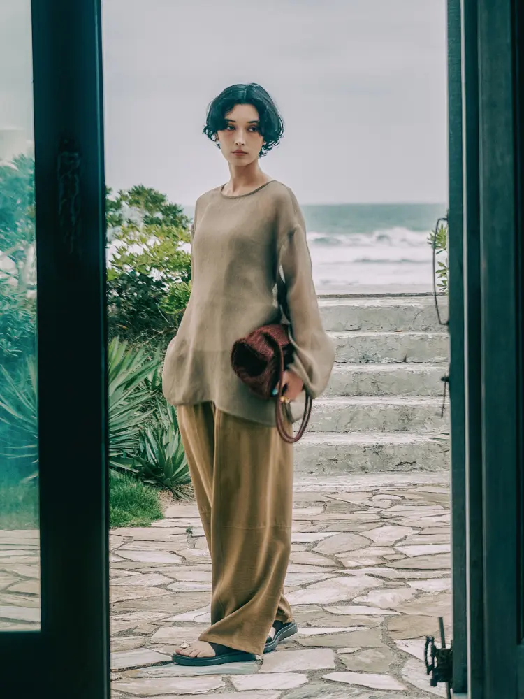 シアーな質感で魅せるニュアンスカラー。絶妙なトーンのアースカラーでまとめた奥行きのあるワントーンコーデ。