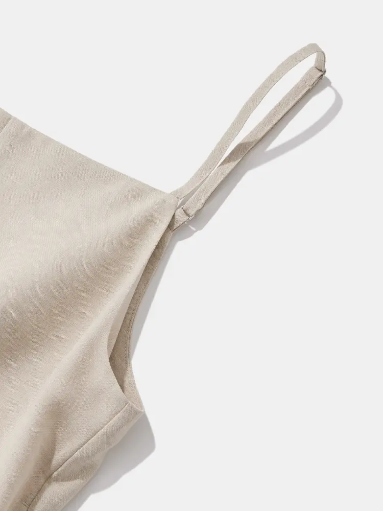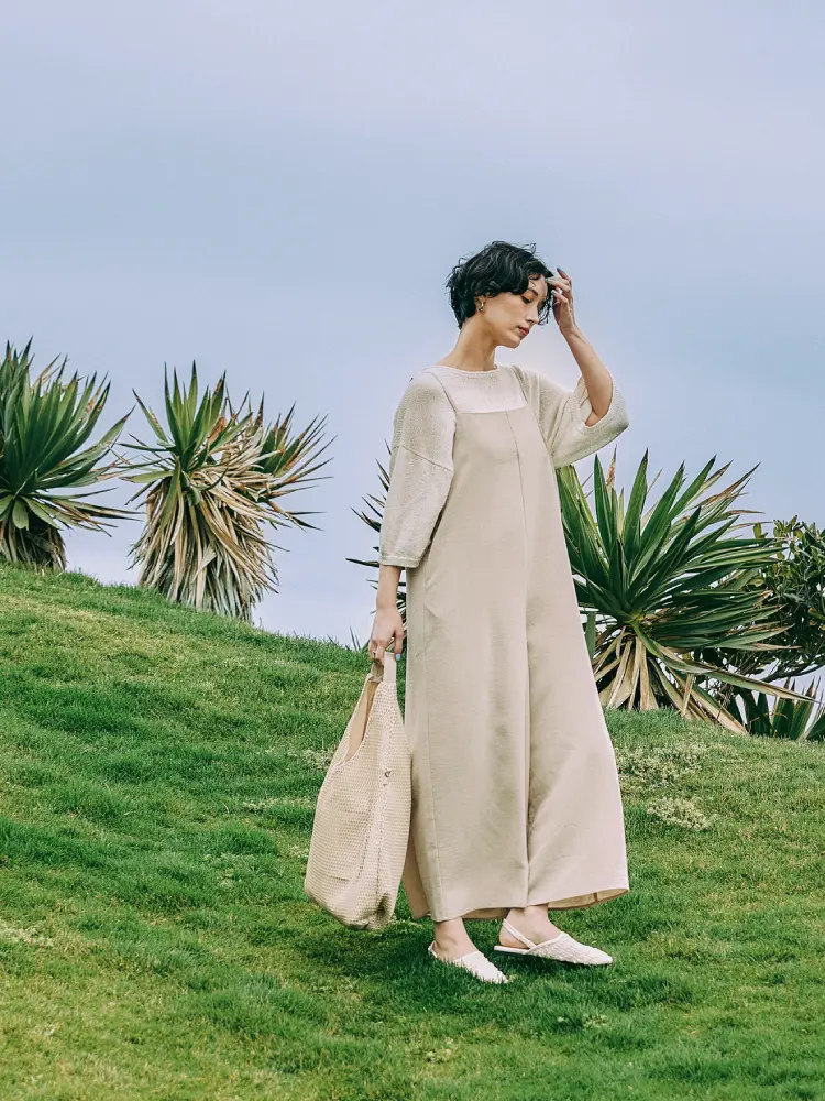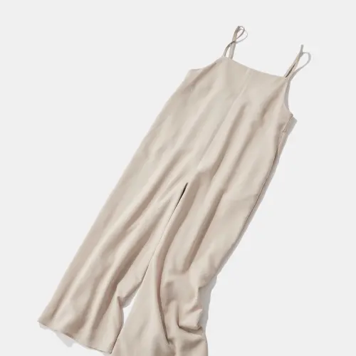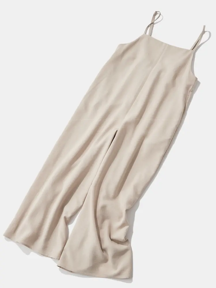 「ラクして、品よく」を叶える大人のキャミサロペット。リネンライク特有の「重たすぎない落ち感」があり、歩くたびに美しく揺れる贅沢なワイドシルエット。