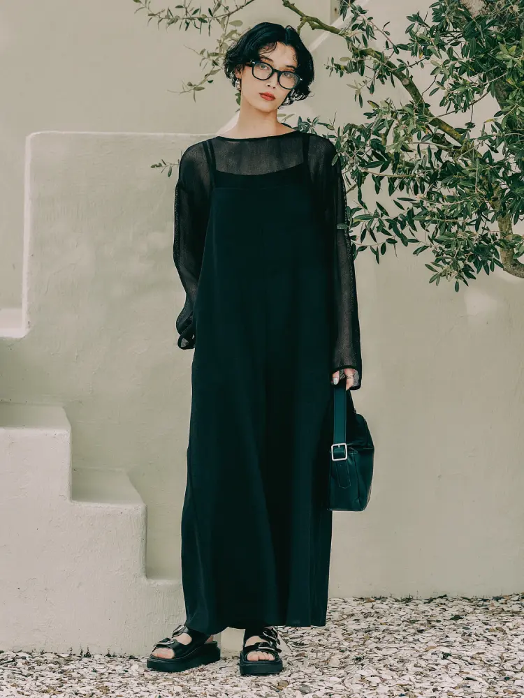 シアーなトップスにキャミサロペットを重ね、モードで女性らしい奥行きを演出。