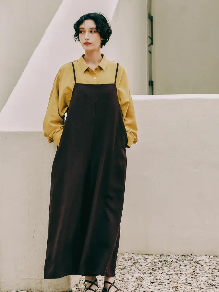 マスタードイエローのシャツにダークブラウンのサロペットを合わせ、落ち着いた華やかさのある配色に。