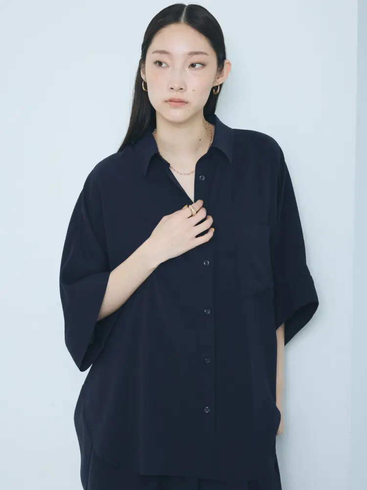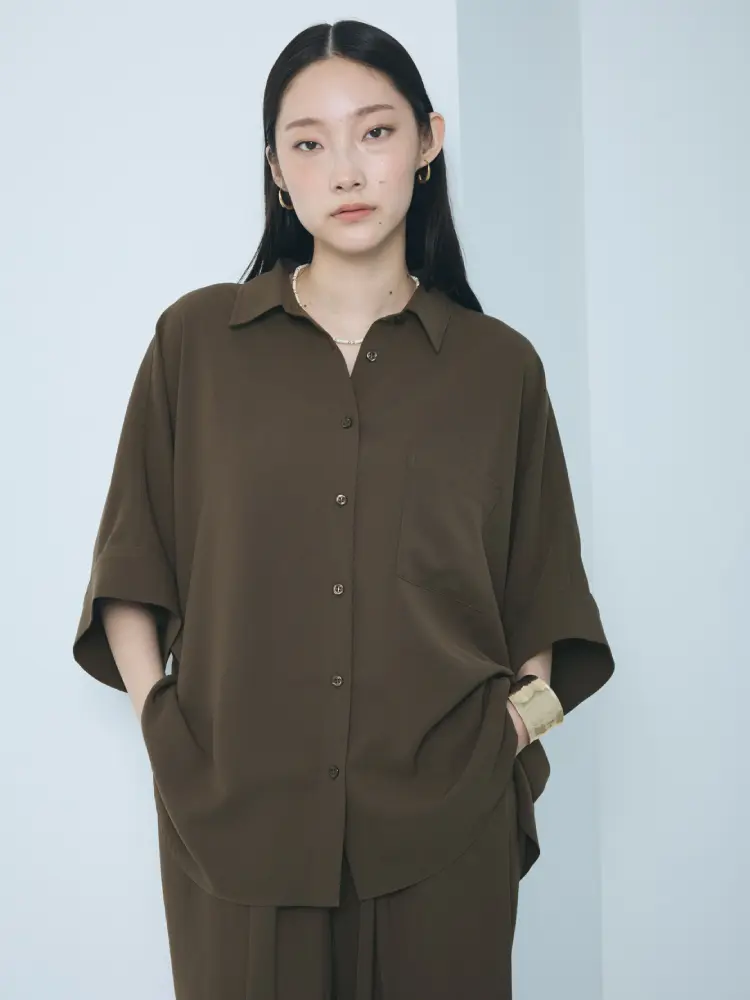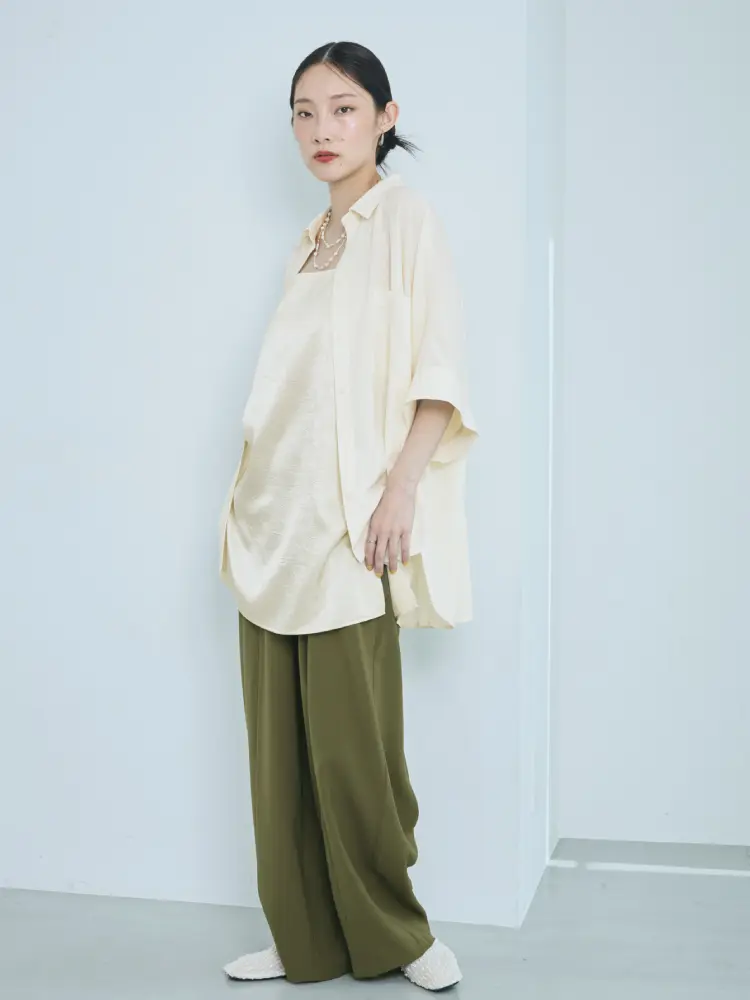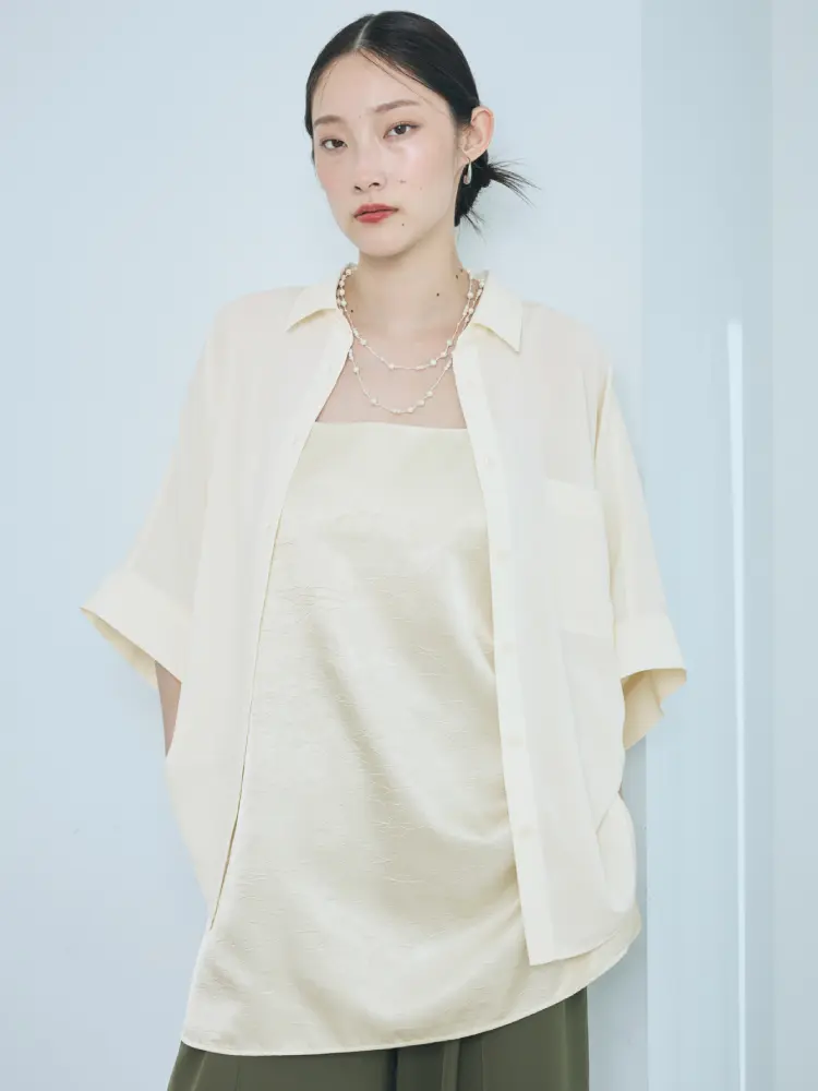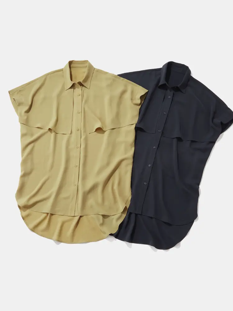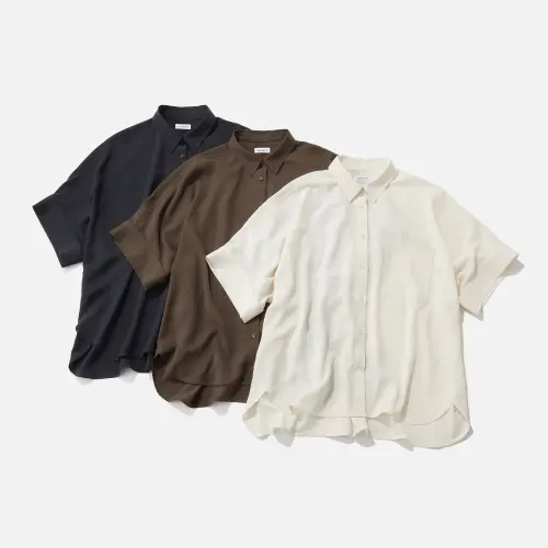 Tシャツ感覚で着られて、ブラウスより涼しい大人のタイパシャツ。前を閉じてクリーンに、開けて羽織としてカジュアルにと、着こなしの幅が広がる一枚。体のラインを拾わずに、風が通り抜けるような心地よいシルエット。