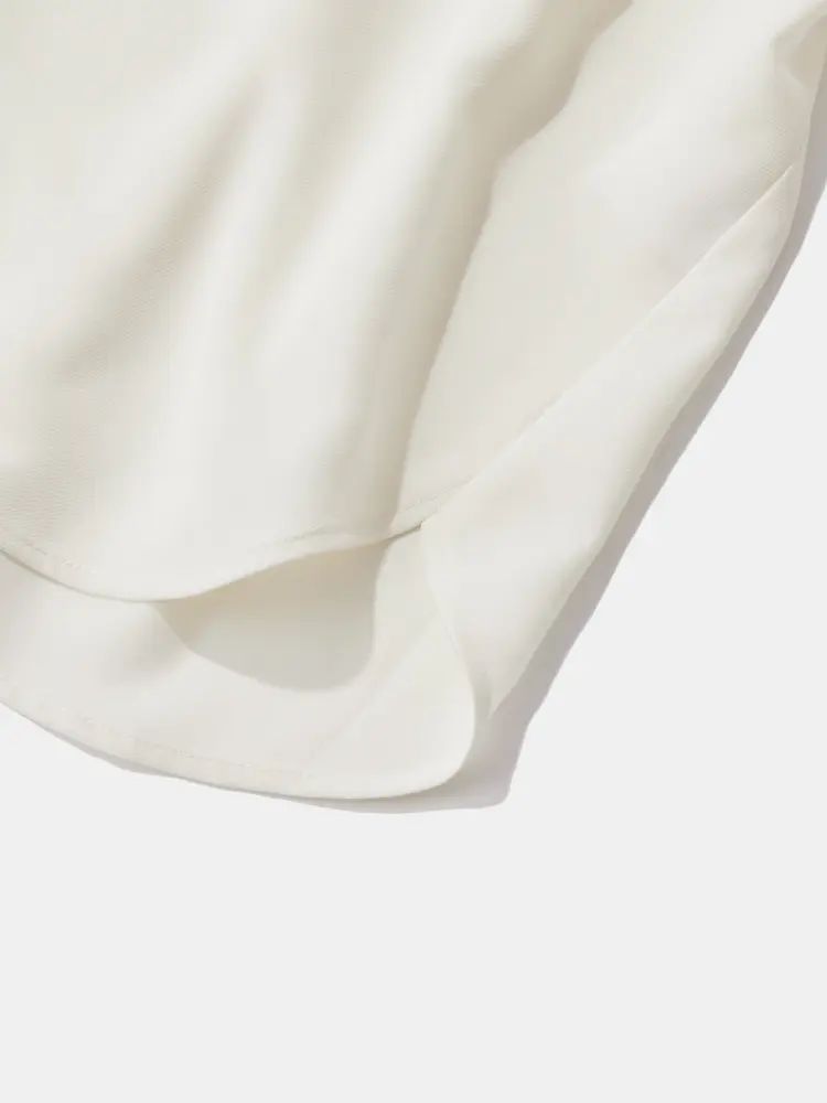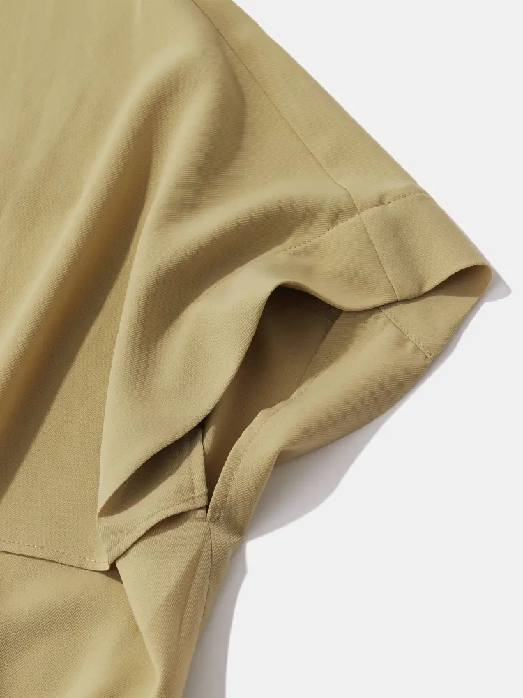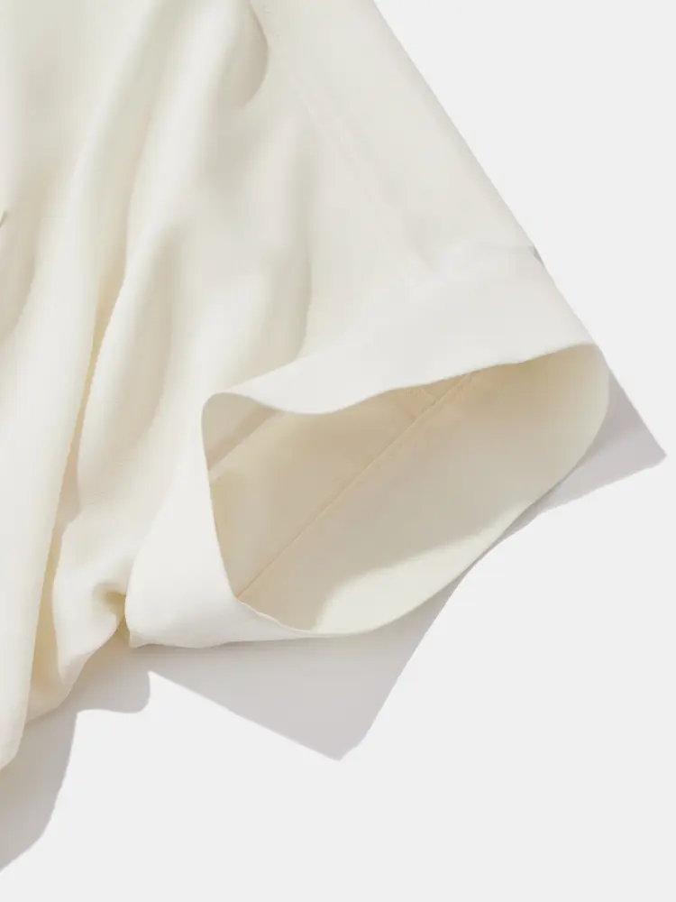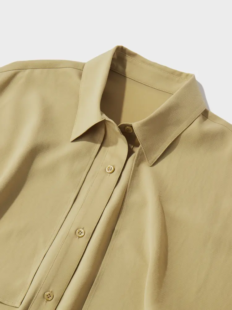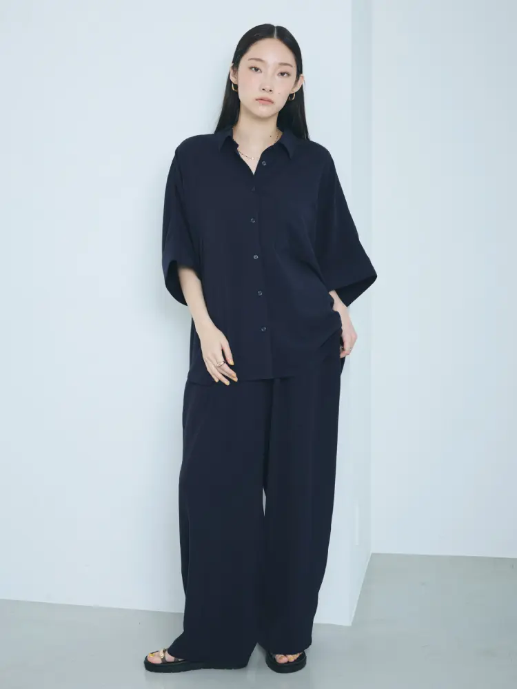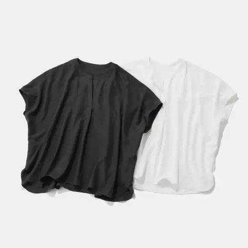 Tシャツ感覚で着られて、ブラウスより涼しい大人のタイパシャツ。前を閉じてクリーンに、開けて羽織としてカジュアルにと、着こなしの幅が広がる一枚。体のラインを拾わずに、風が通り抜けるような心地よいシルエット。