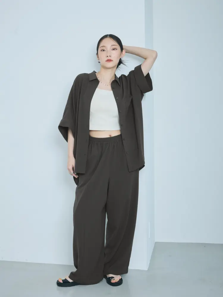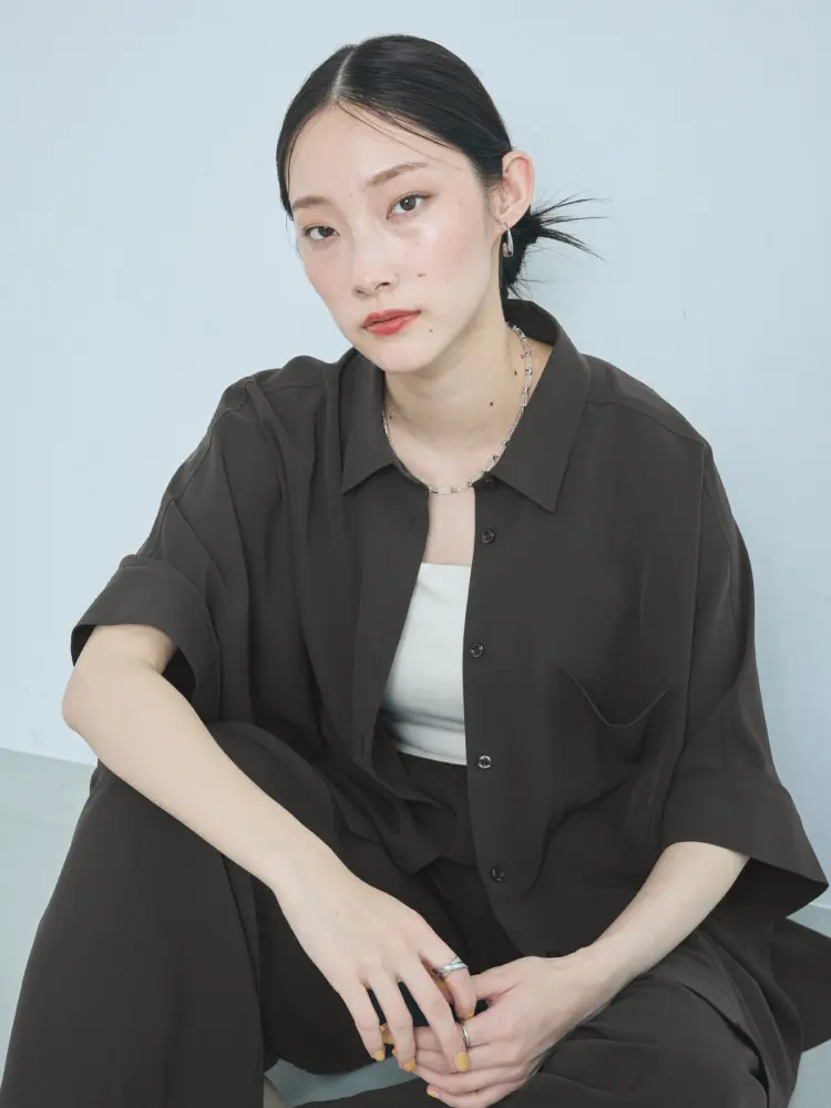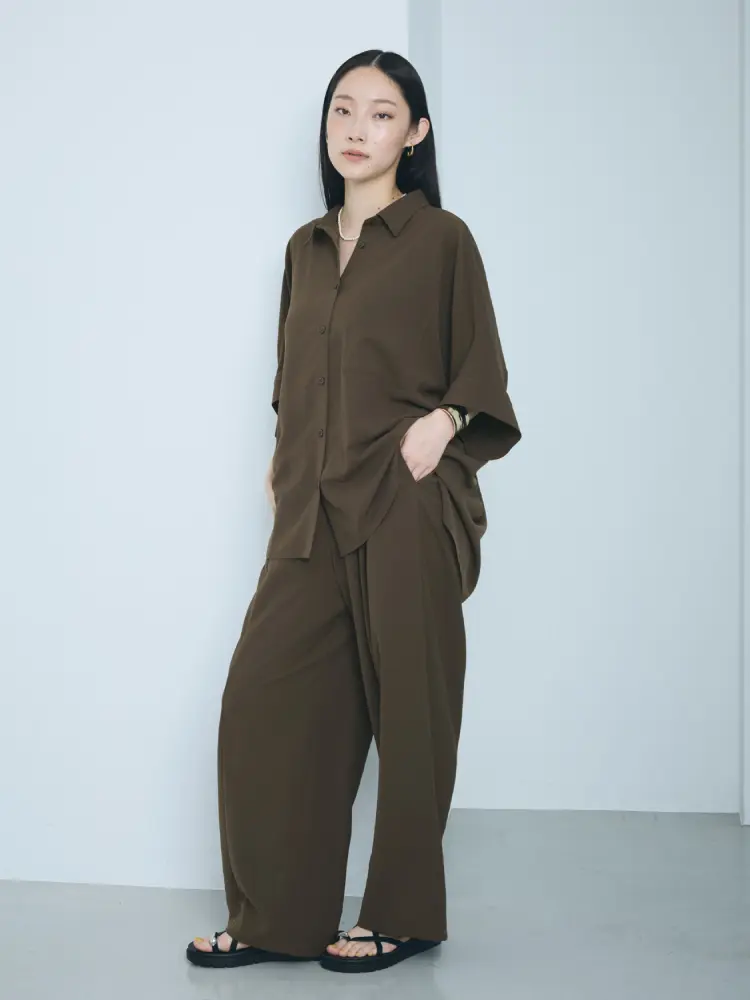 セットアップで叶えるハンサムな表情。落ち感のあるシャツとパンツをセットで着こなし、凛とした佇まいに。