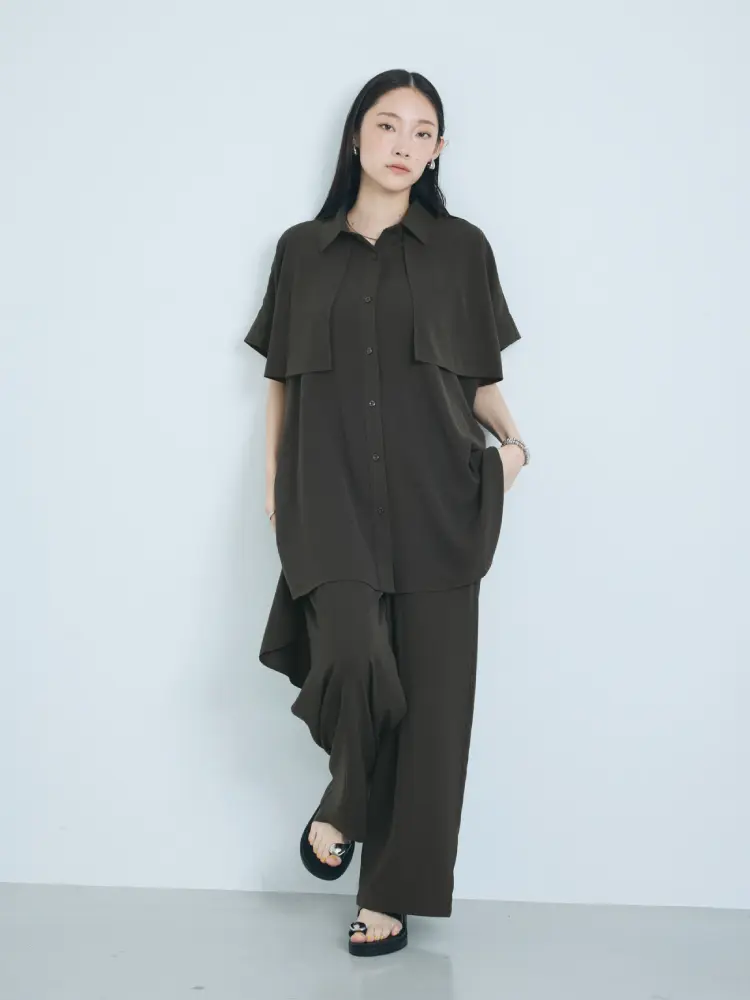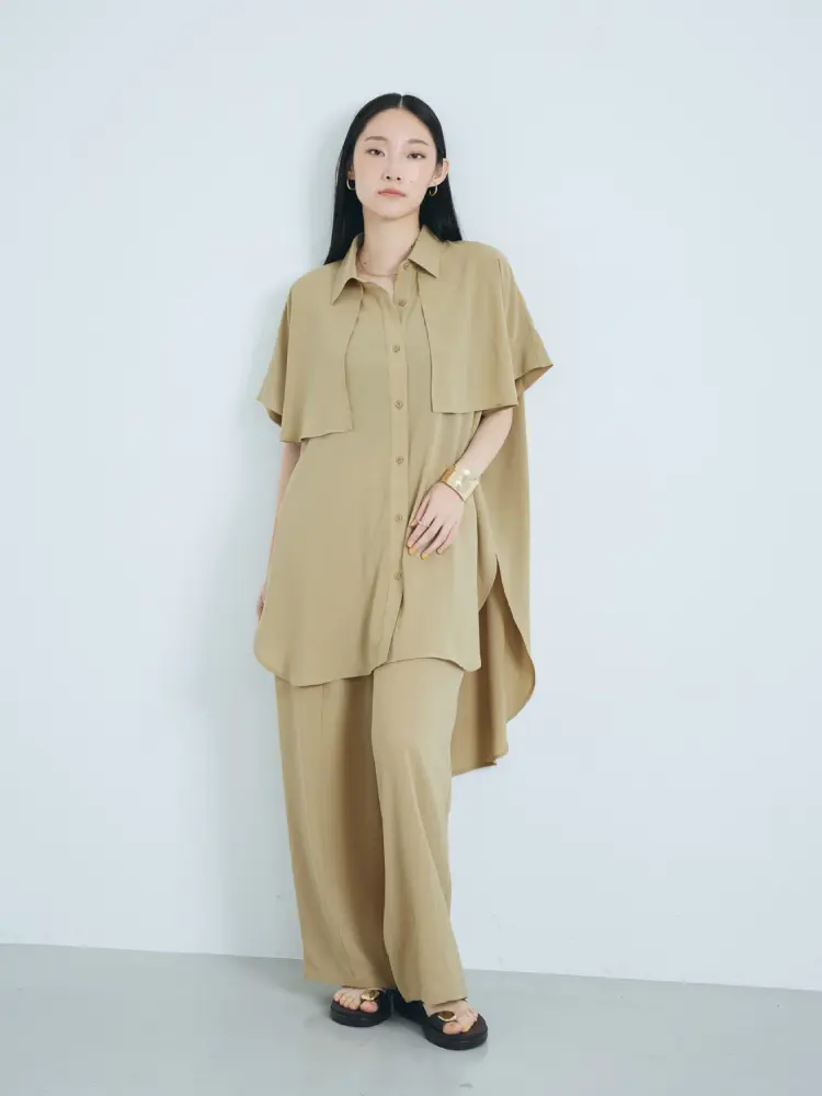 洗練を極める、ワントーンスタイリング。シャツの襟元とケープのような重なりが、大人の女性らしさを演出。