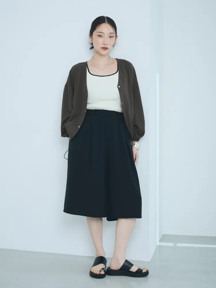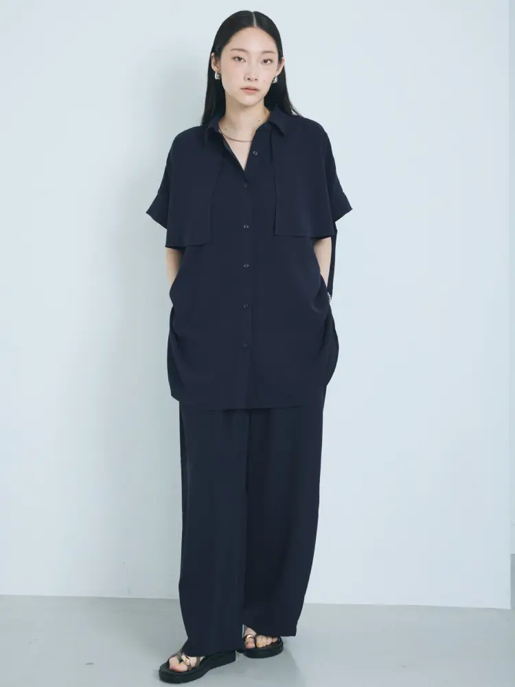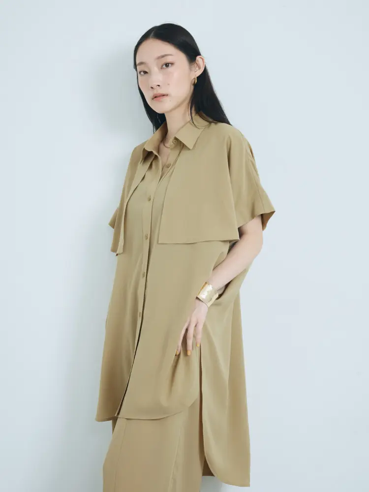 涼しさも、着映えも、これ一枚で完結。胸元の二重になったケープデザインが、こなれ感のある都会的なシルエットを作ります。フロントはスッキリ、後ろはヒップの隠れる長めの着丈。体型カバーをしつつ、細見えする計算されたバランスです。