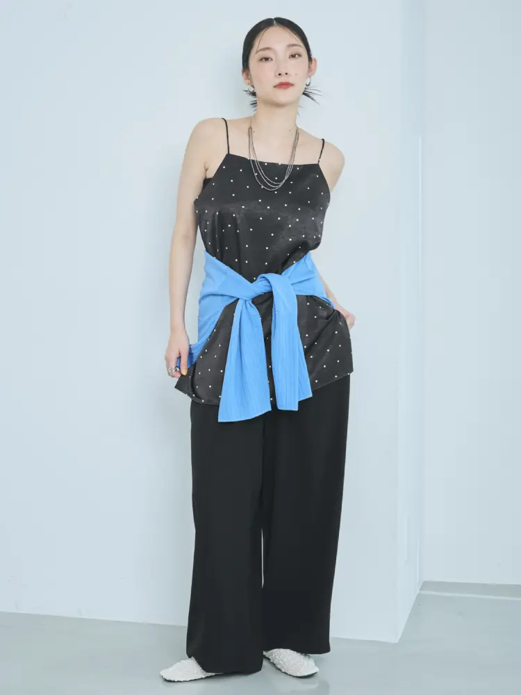 光沢感のある黒サテンと、マットな黒ワイドパンツ。同じ「黒」でも素材感を変えることで、単調にならず奥行きのある装いに。
