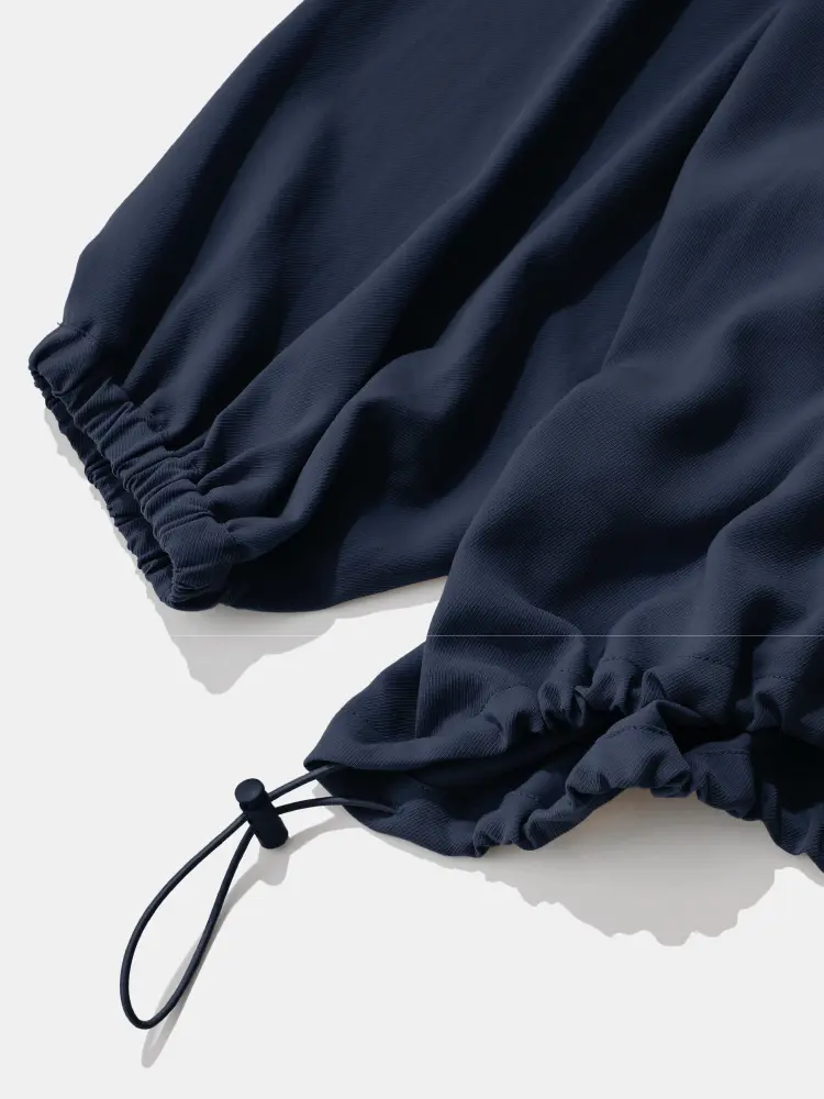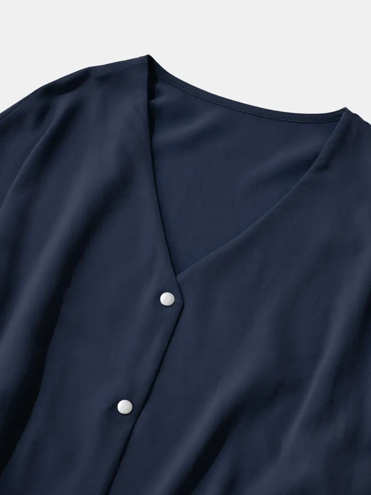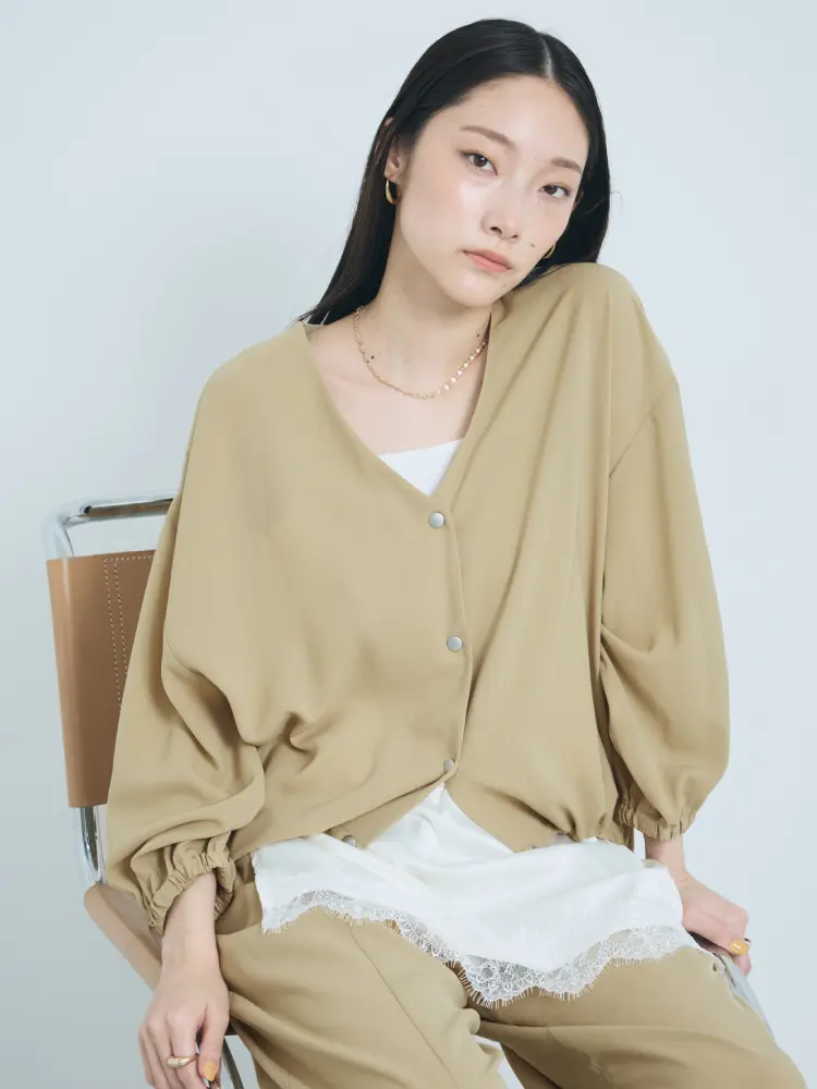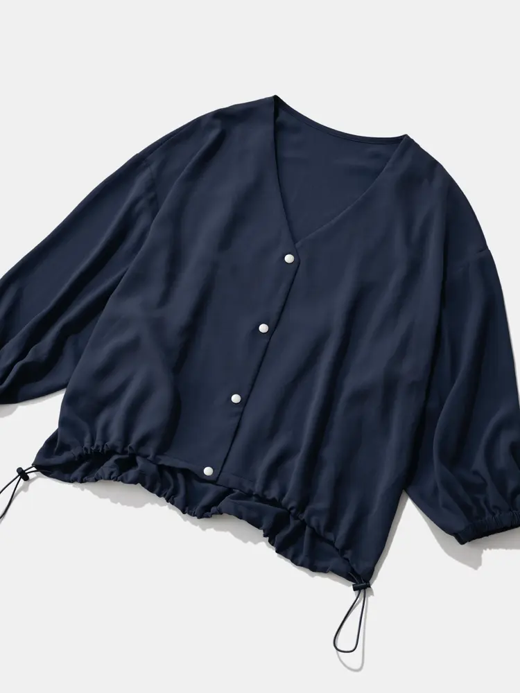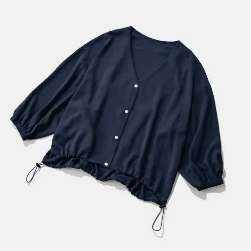 絶妙なカッティングのVネックとシルバーのスナップボタンで抜け感と利便性を両立。「裾ドロスト」でシルエットを自由に調整でき、「袖口のゴム仕様」も腕まくりもしやすく、デスクワークにもアクティブにも使える一着。