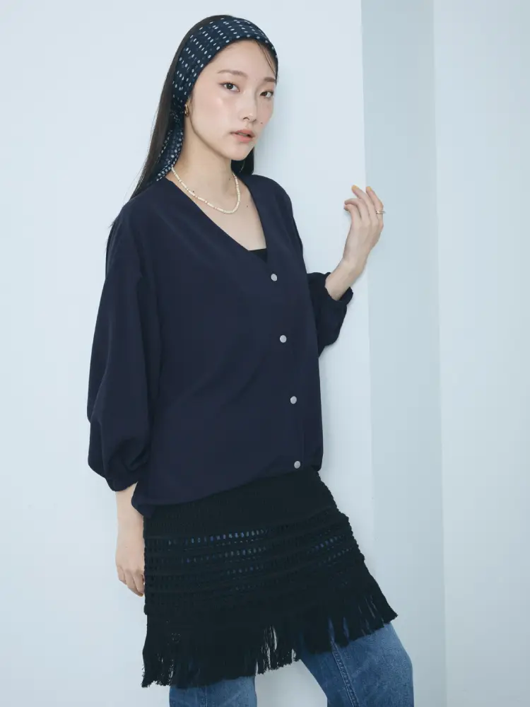 フリンジで、大人のカジュアルさを。スカートのフリンジが着こなしに動きを出し、程よいラフさをプラス。