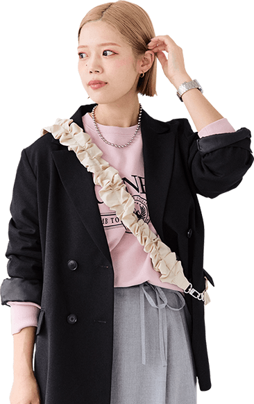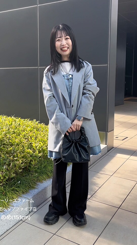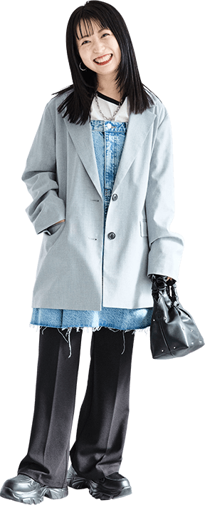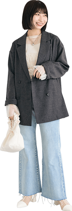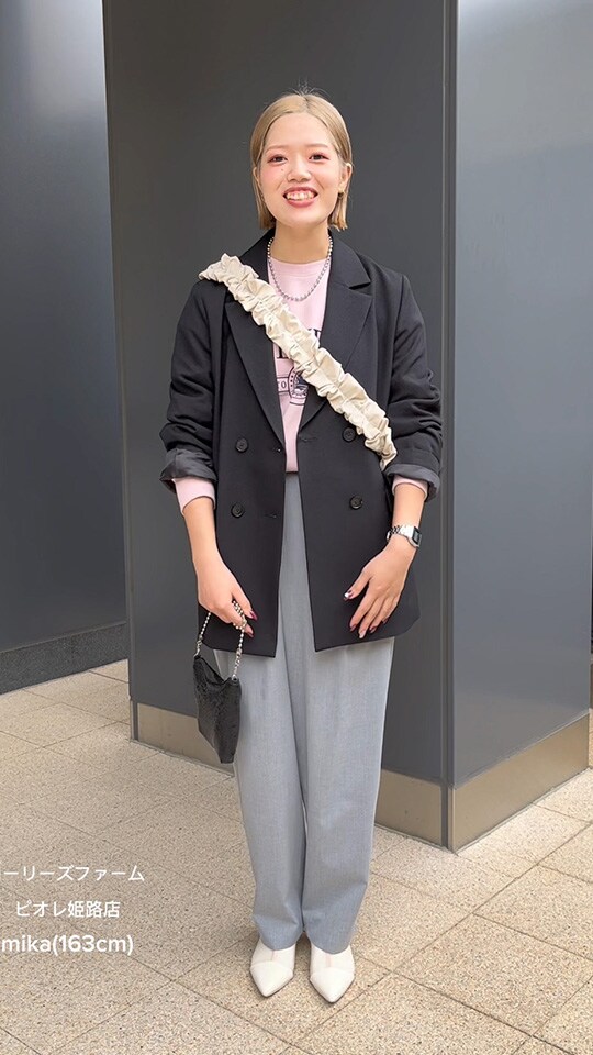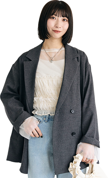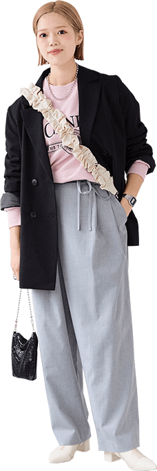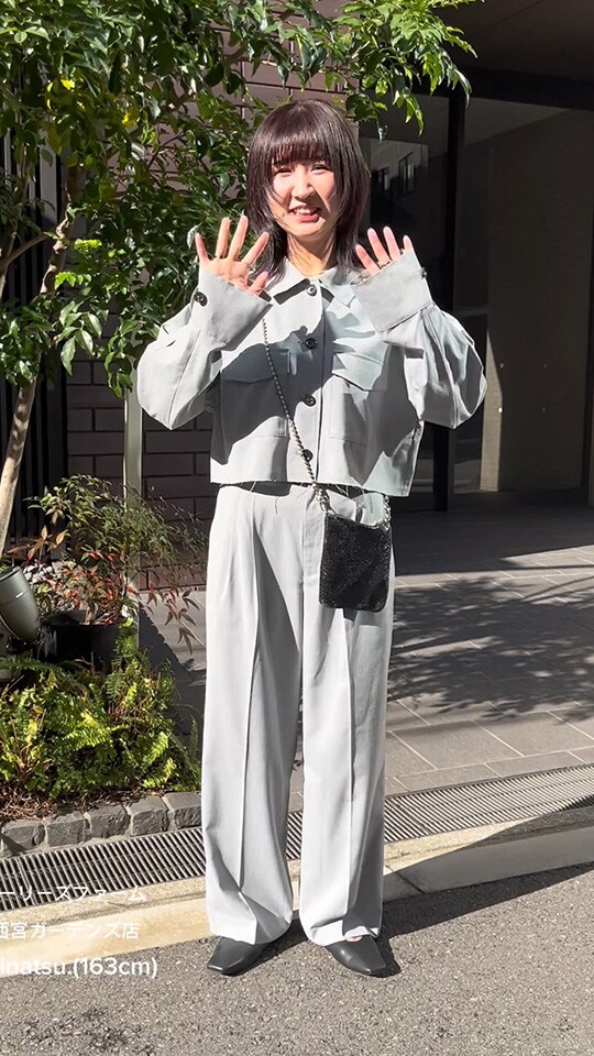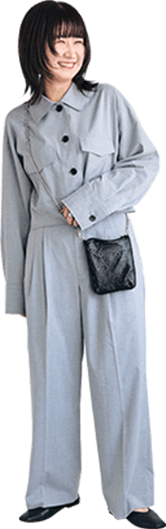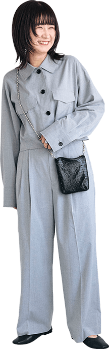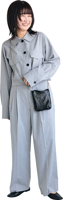 大人っぽいグレーのセットアップは身に纏うだけで洒落感アップ。ヘアスタイルに合わせてきれいめな雰囲気にまとめました!