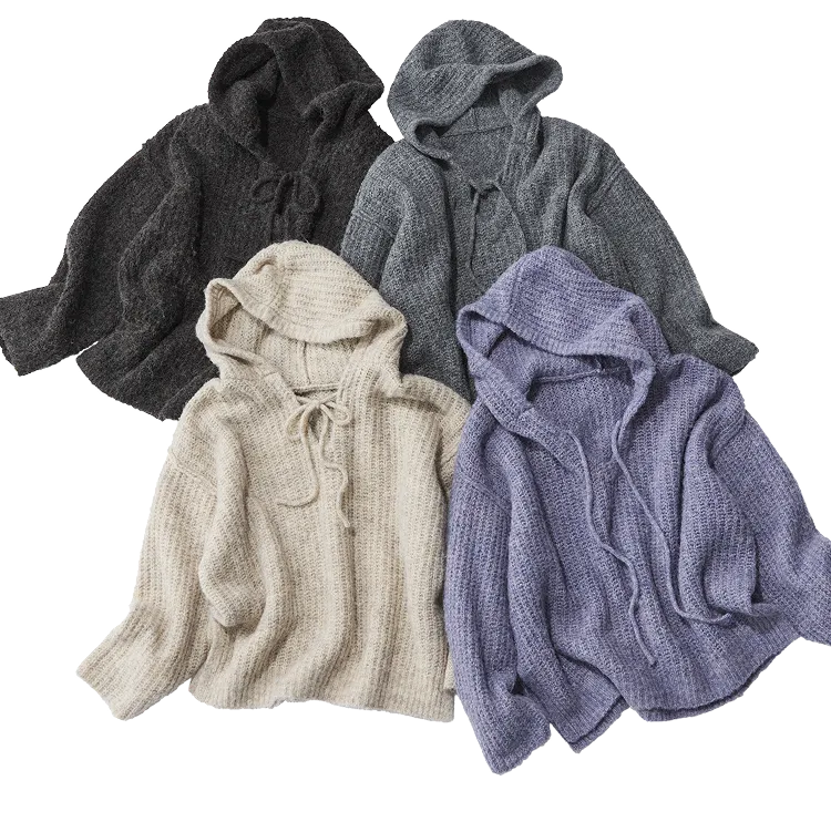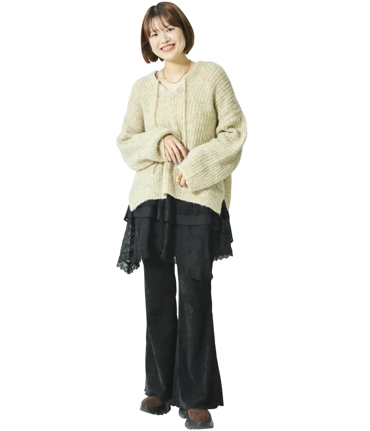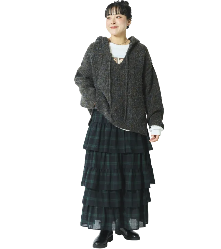 今年トレンドのフードがアクセントになった、ざっくり編みで抜け感のあるニットプルオーバー。着丈が長くゆったりとしたリラクシーなシルエットでボトムスを選ばずコーディネートできます。