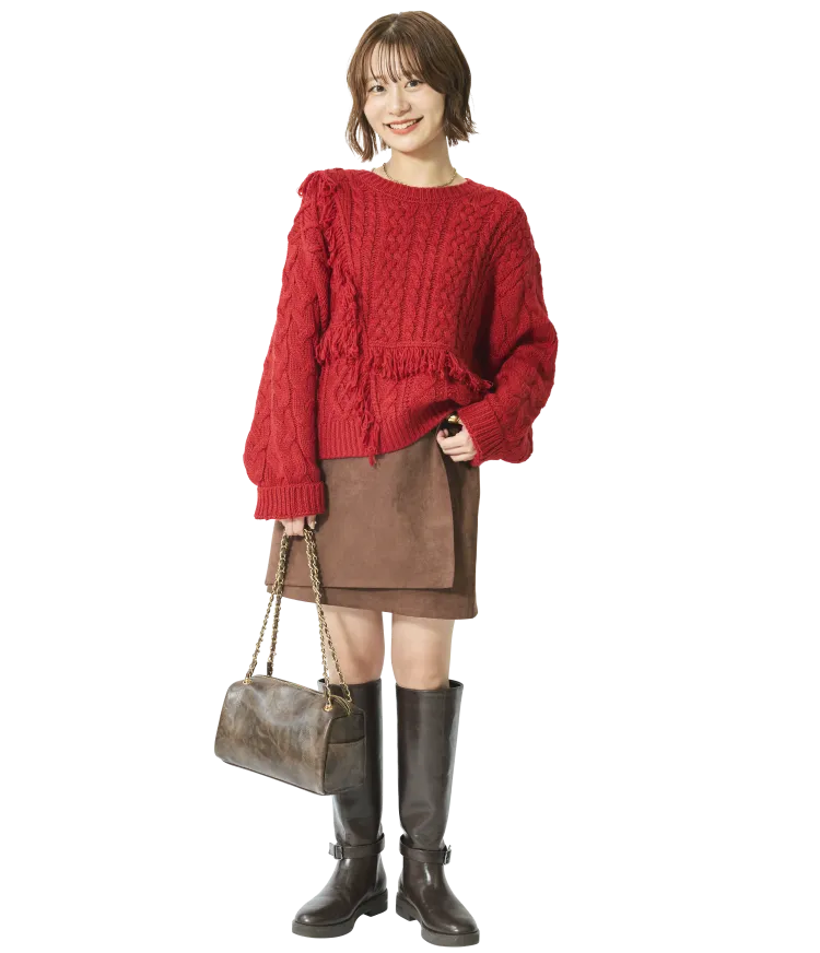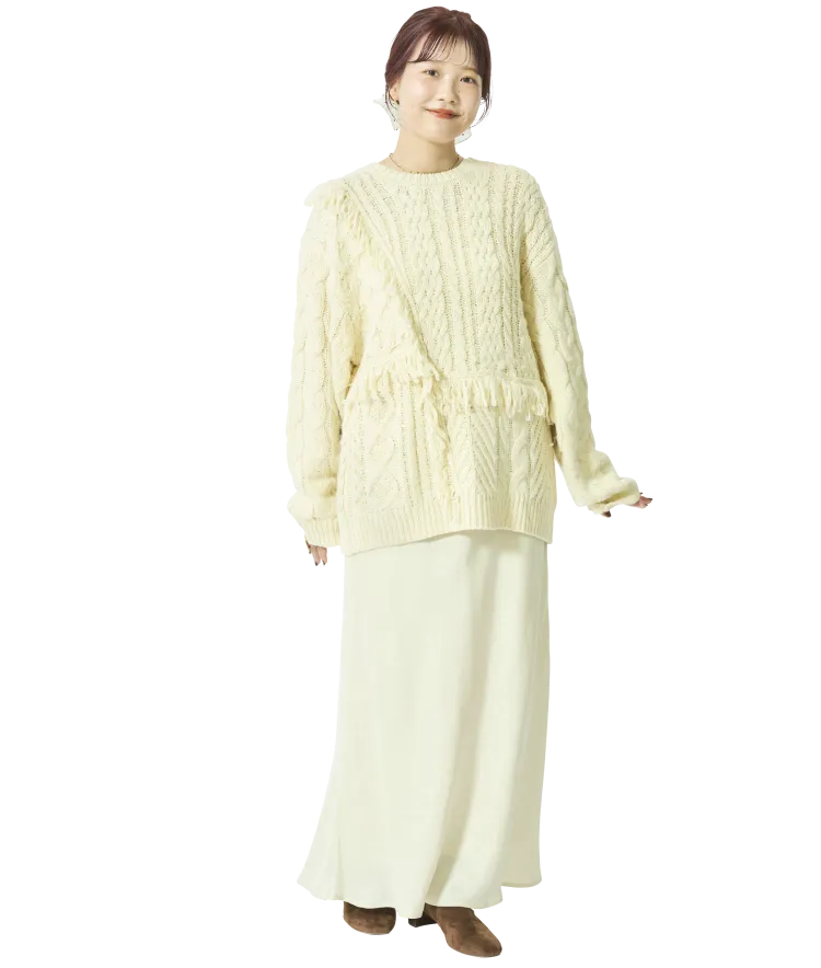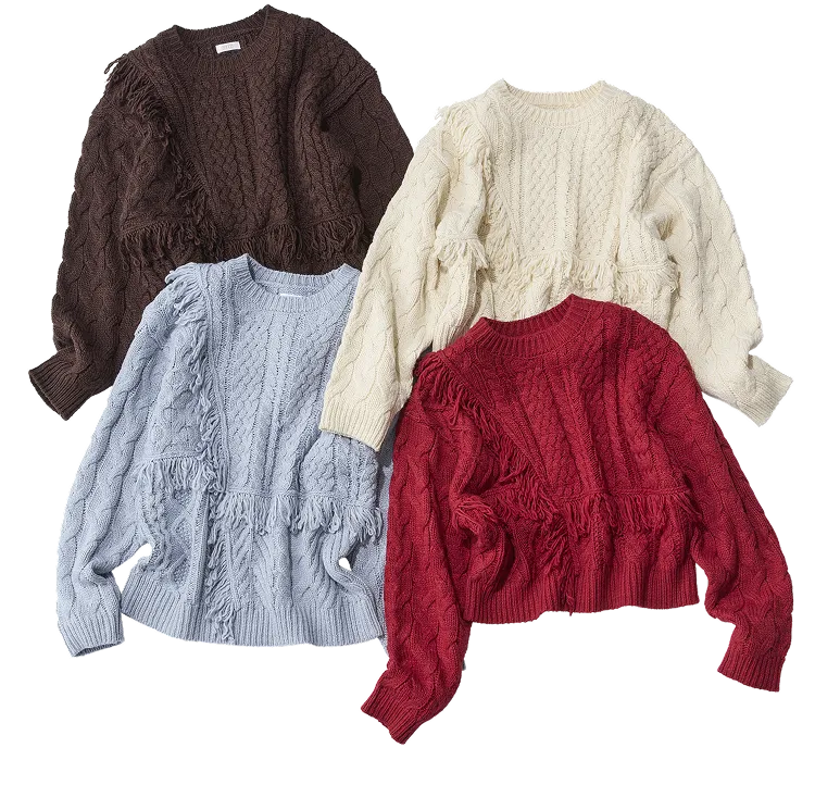 オリジナルケーブル柄とフリンジが華やかで存在感のある主役ニット。ボトムスとバランスの取りやすいショート丈とリラックス感のあるロング丈、2つの着丈から選べるのもうれしいポイント。
