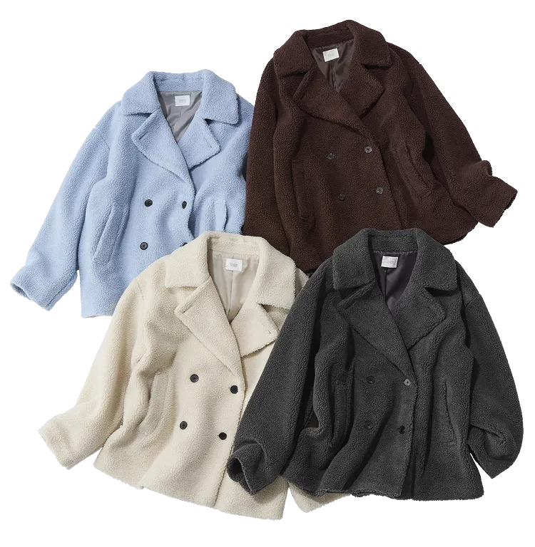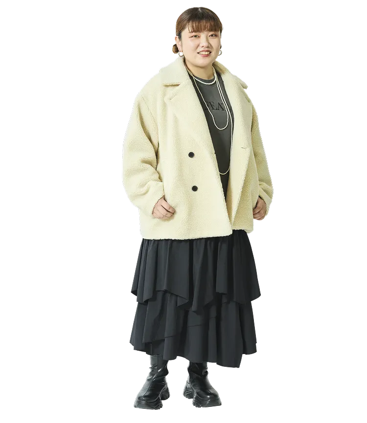 もこもこした素材感が可愛いコートは、ゆったり羽織れるサイズ感がうれしい一着。顔まわりを華やかに見せつつ小顔効果も狙えるワイドカラーのデザインで、毎日のコーデに大活躍間違いなし。