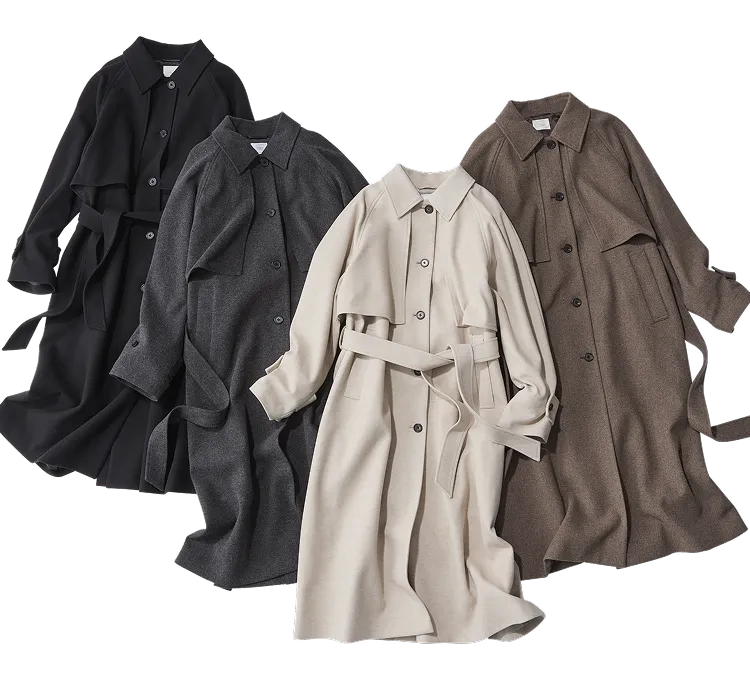 綺麗なAラインが魅力のコートは、ヨークデザインがいいアクセントに。シンプルになりすぎず、さっと羽織っても決まります。共地ベルトでウエストマークして違った表情を楽しむのもおすすめ。