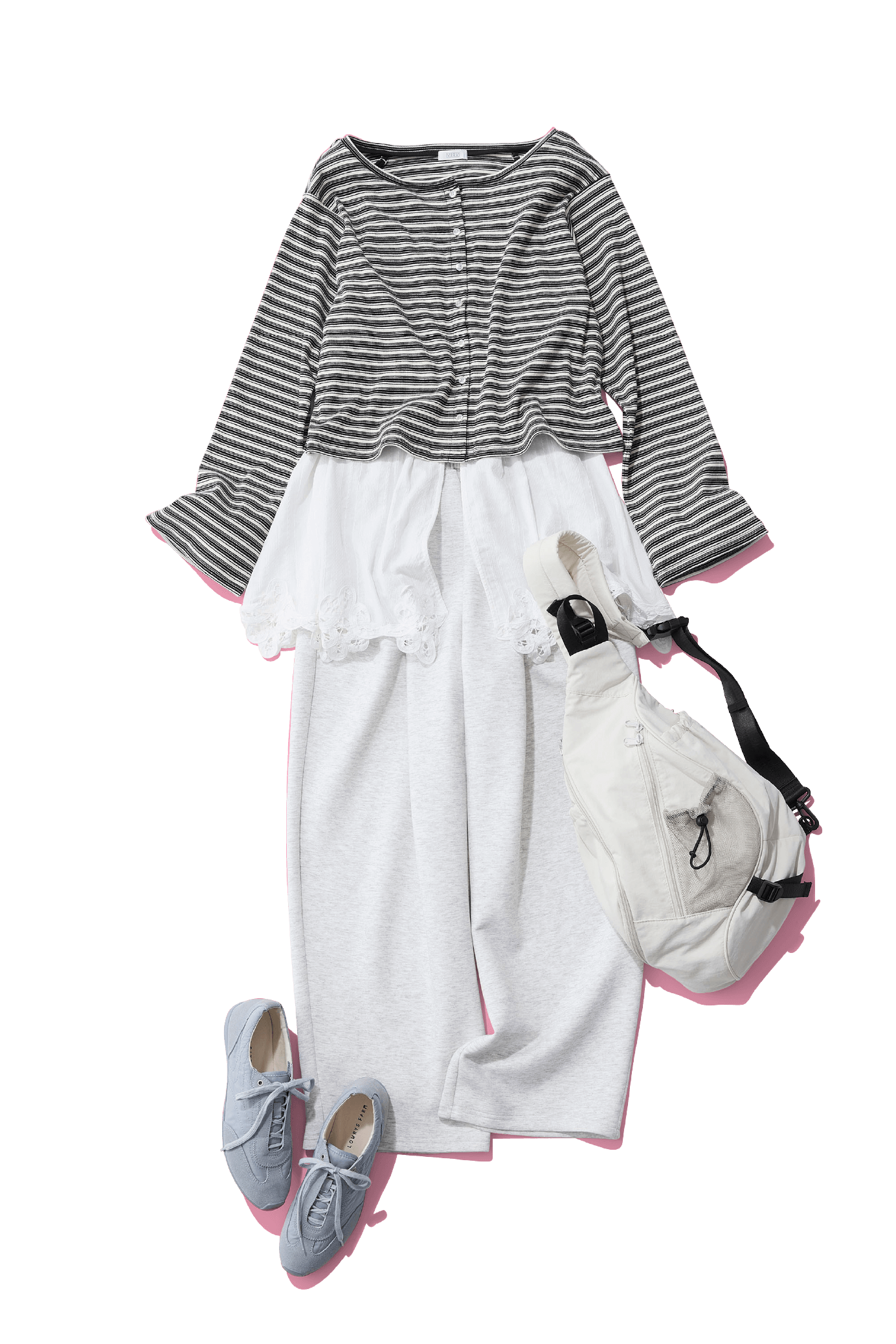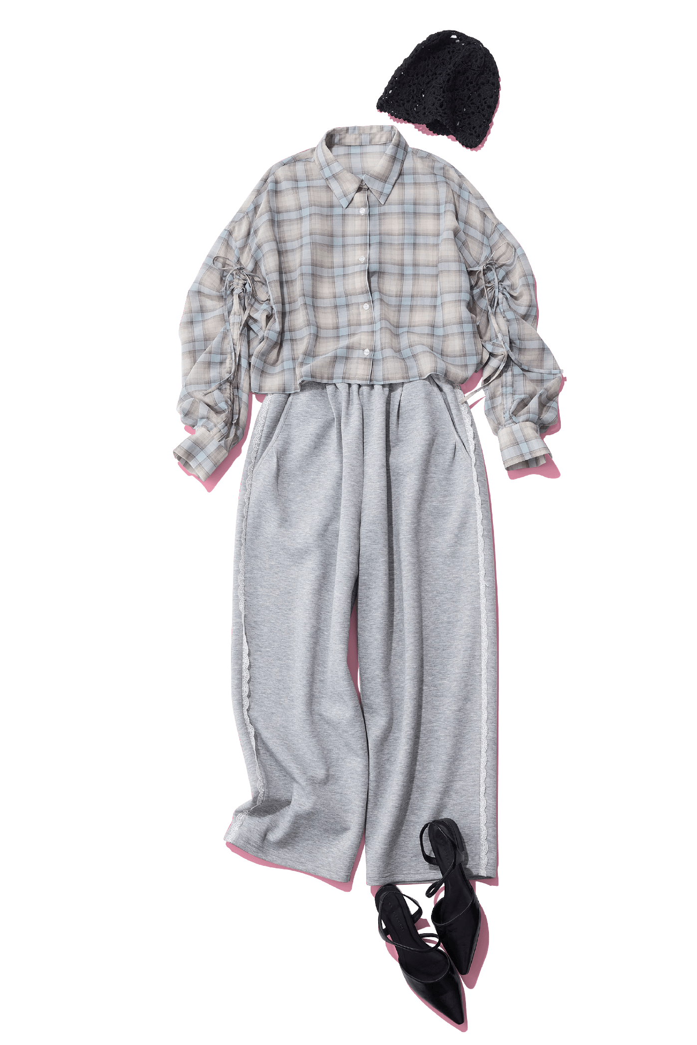 注目のスウェットパンツ合わせもシアーな質感なら大人っぽく。