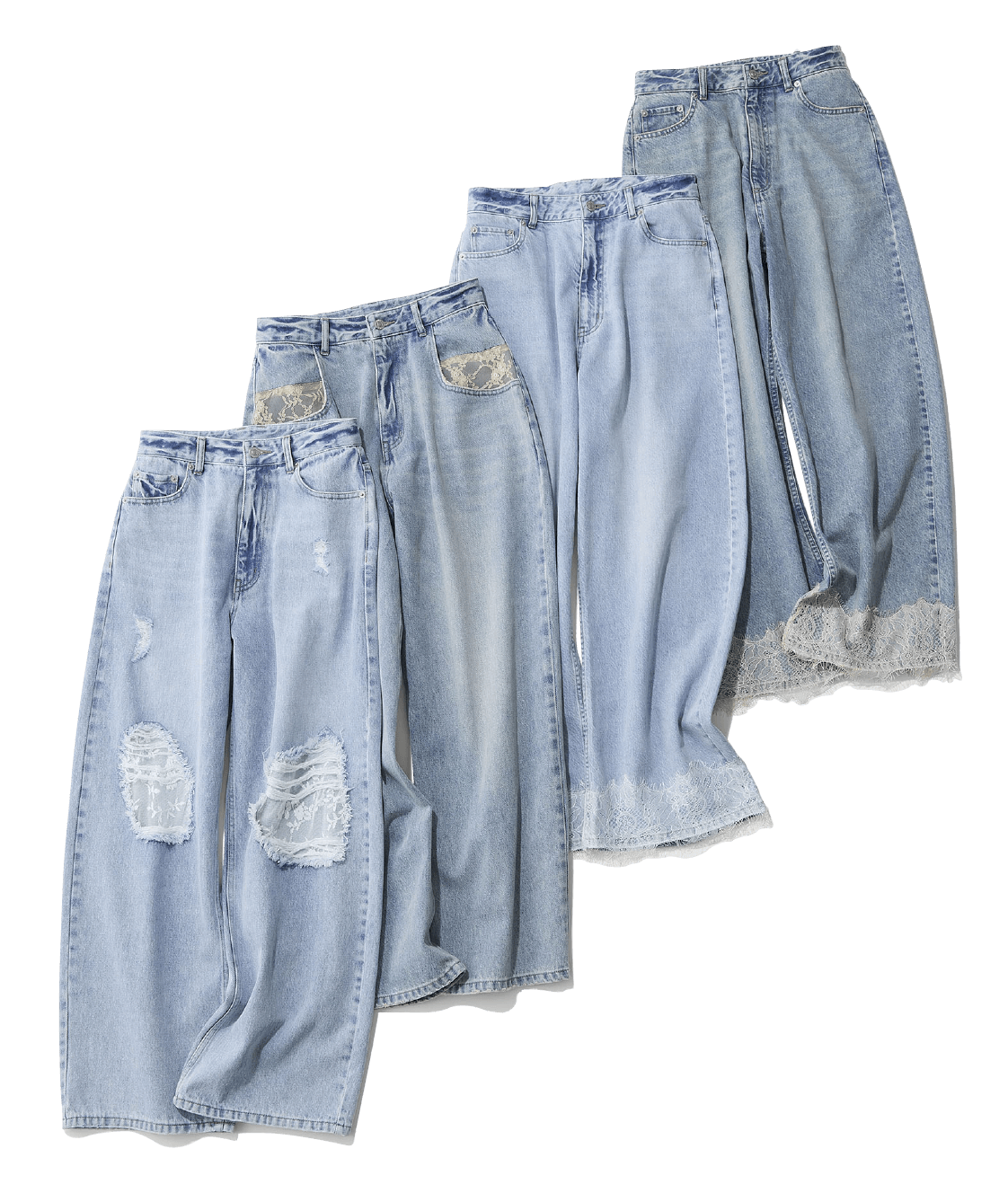 レースを組み合わせたワイドストレートデニムは好評につきデザインにバリエーションが追加! 裾やひざのダメージ部分、ポケットなど、ドッキングにパターンがあるのでお好きなものを選んで。