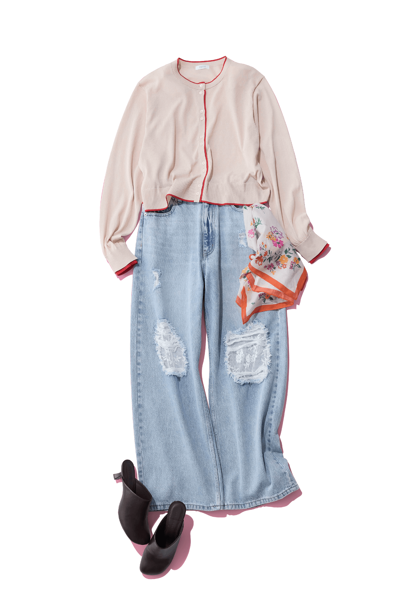 ひざのダメージ×レースでカジュアル感を演出。