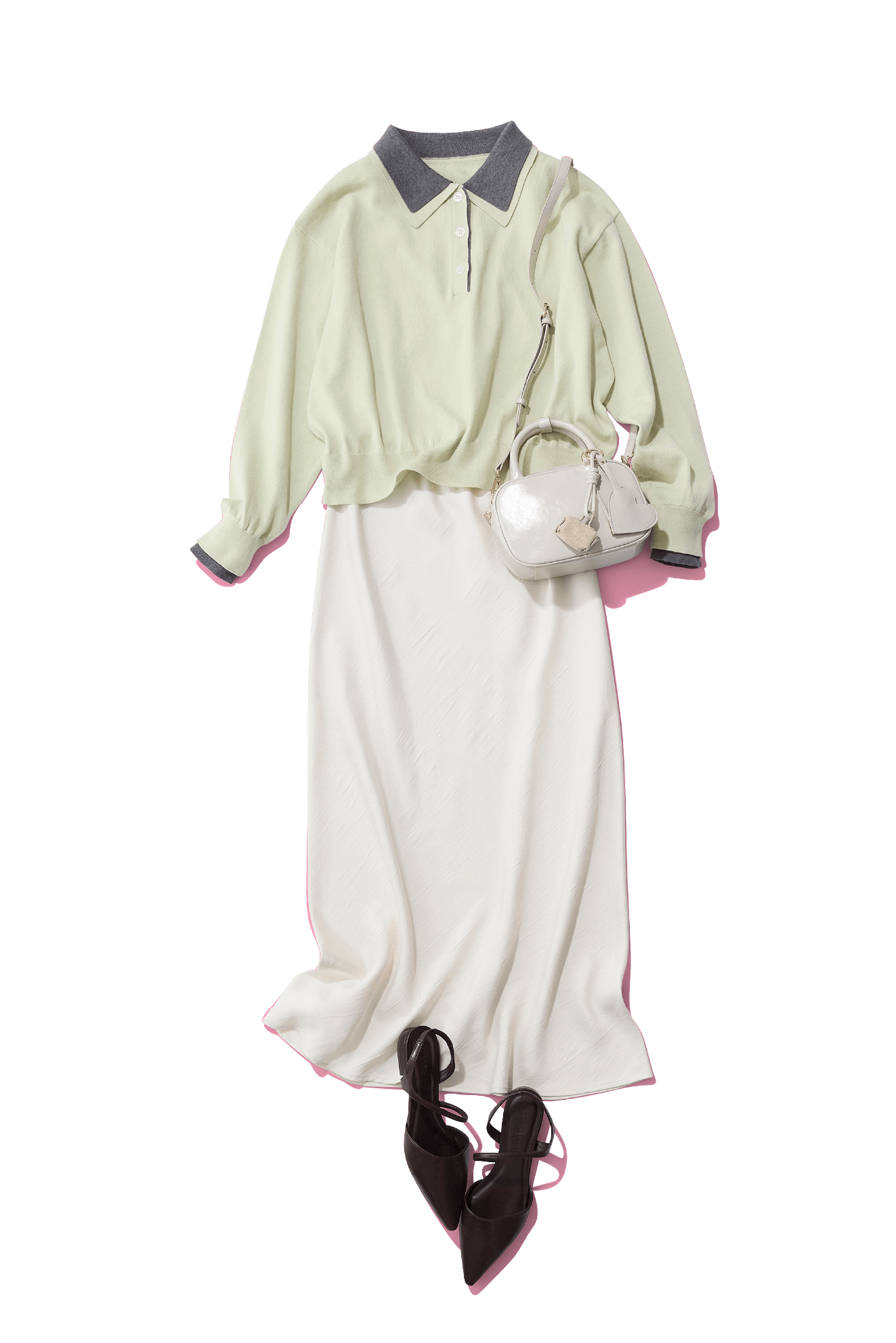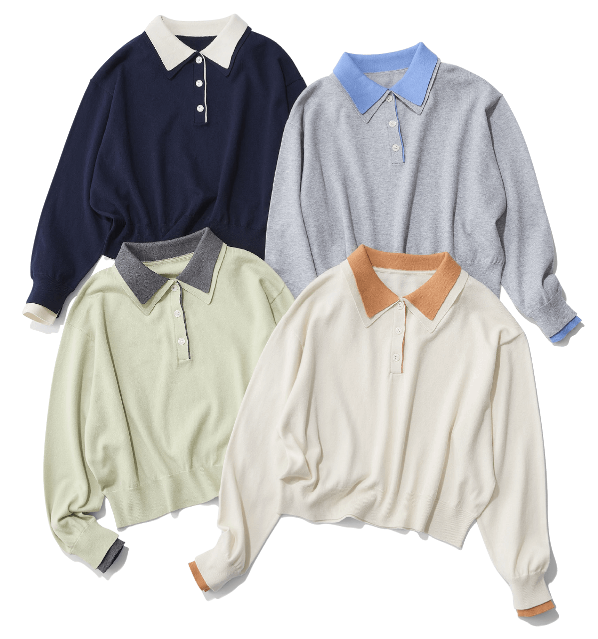 バイカラーのポロニットは襟だけじゃなく袖口も配色になっているので、軽アウターを羽織ったときもポイントになります。やわらかな着心地と薄すぎず厚すぎない生地で春のスタメン間違いなし。