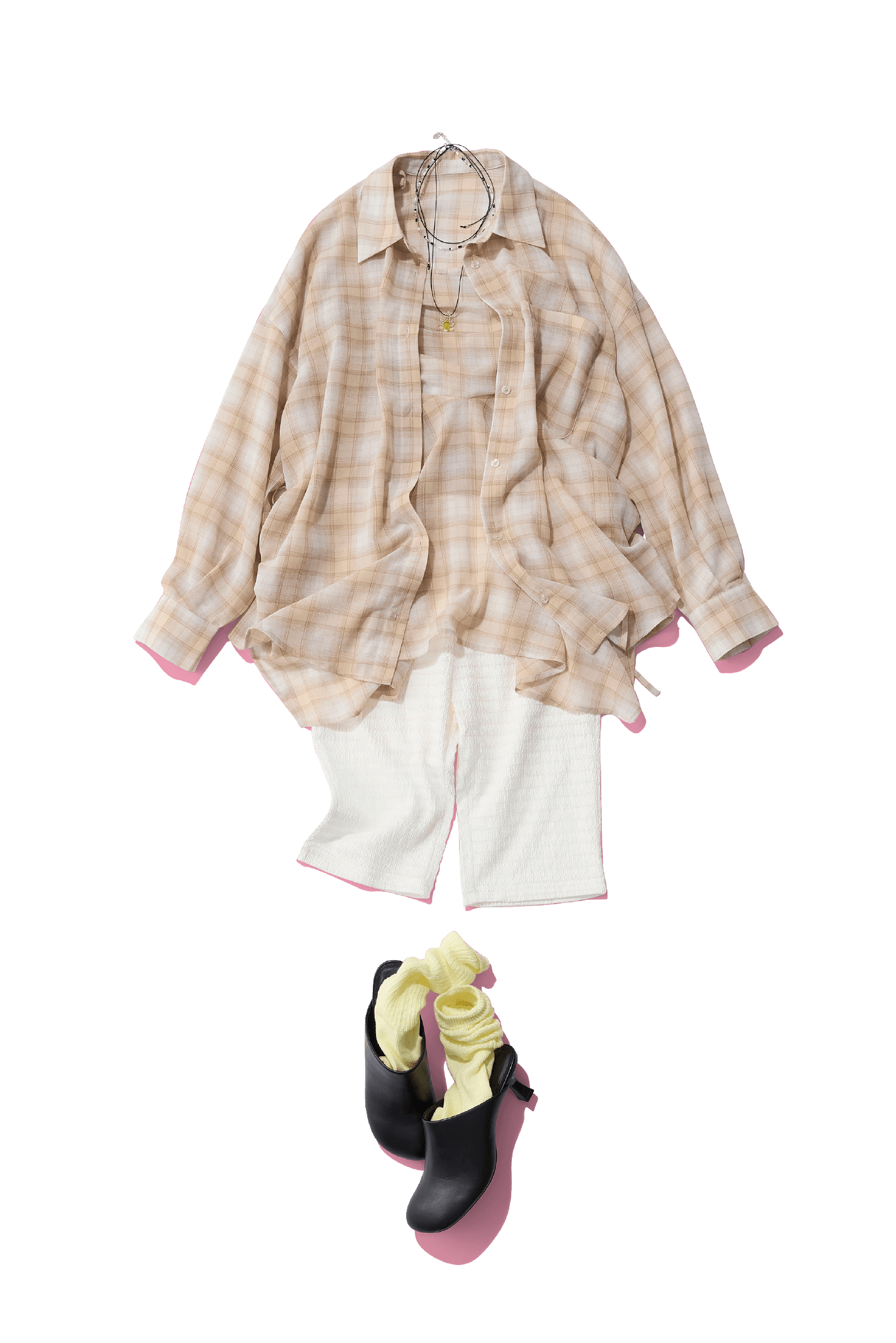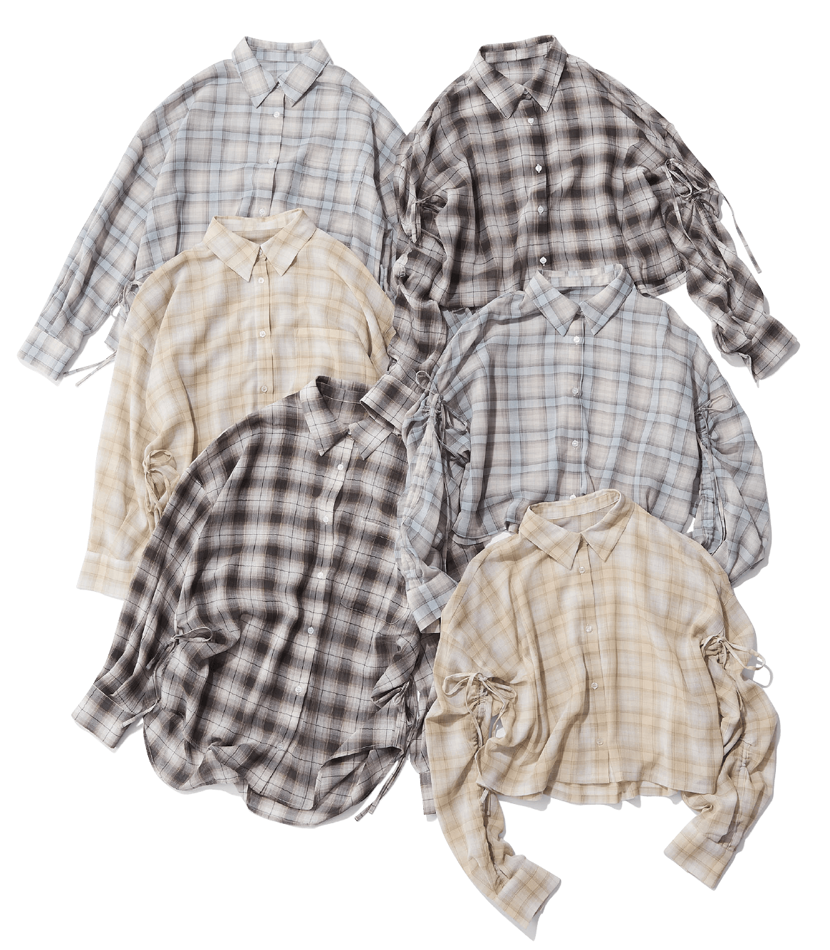 シアーな生地感にシャリ味を加えた新感覚のチェックシャツは2種類の展開。ショートver.は袖に、ロングver.は裾の脇にリボンを加えており、結ぶと立体感のあるシルエットが楽しめます。