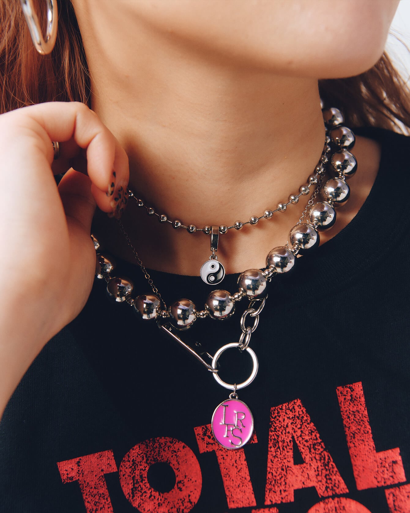 短丈の白T×パンツのスタイル。ゆったりとしたシルエットのワイドパンツを選ぶことで、全体のシルエットにメリハリが生まれ、体型カバーも叶う万能コーデが完成です。全身は控えめなカラーで抑えているので、アクセサリーで色味を取り入れるのを忘れずに。それぞれ長さが異なる三連のネックレスは、まが玉ハートが主役となり、スタイリングにアクセントを効かせてくれます。