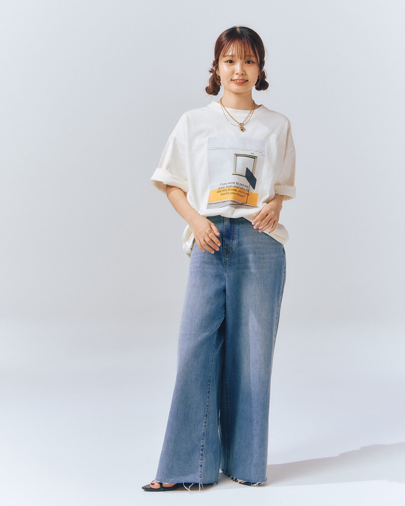 ユニセックスでゆったりとしたフォルムのフォトTは、ワイドパンツにフロントインして着こなすのが定番。アクセサリーは女性らしいゴールドで統一することで、程よい華やかさをプラスしています。二連のリングは、ステンレス製かつ指がしっかり広がる設計になっているため、日常使いにも最適です。