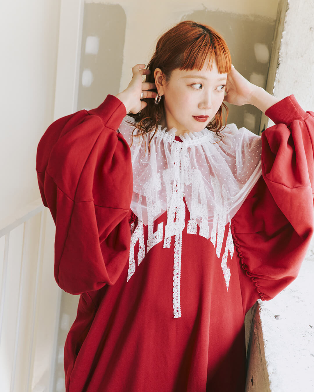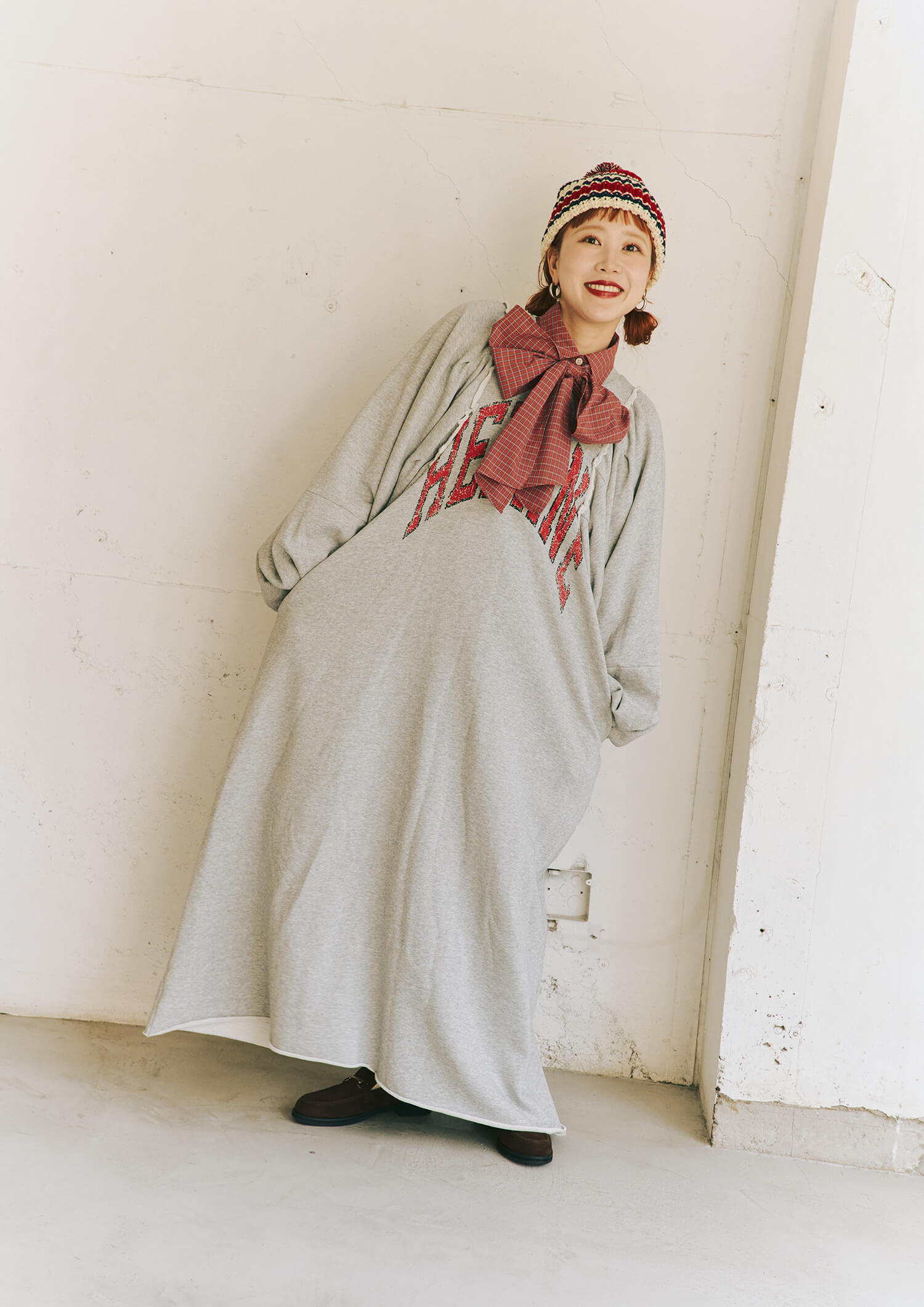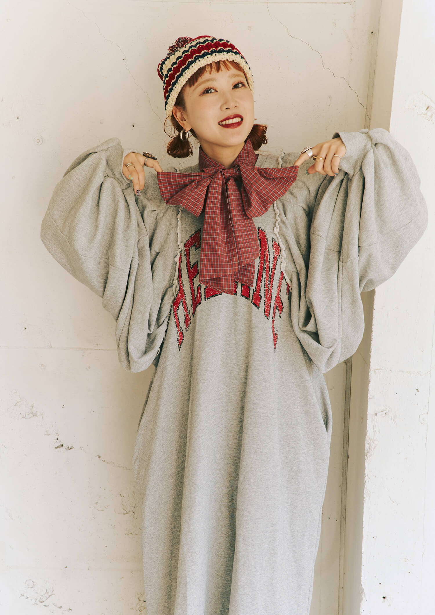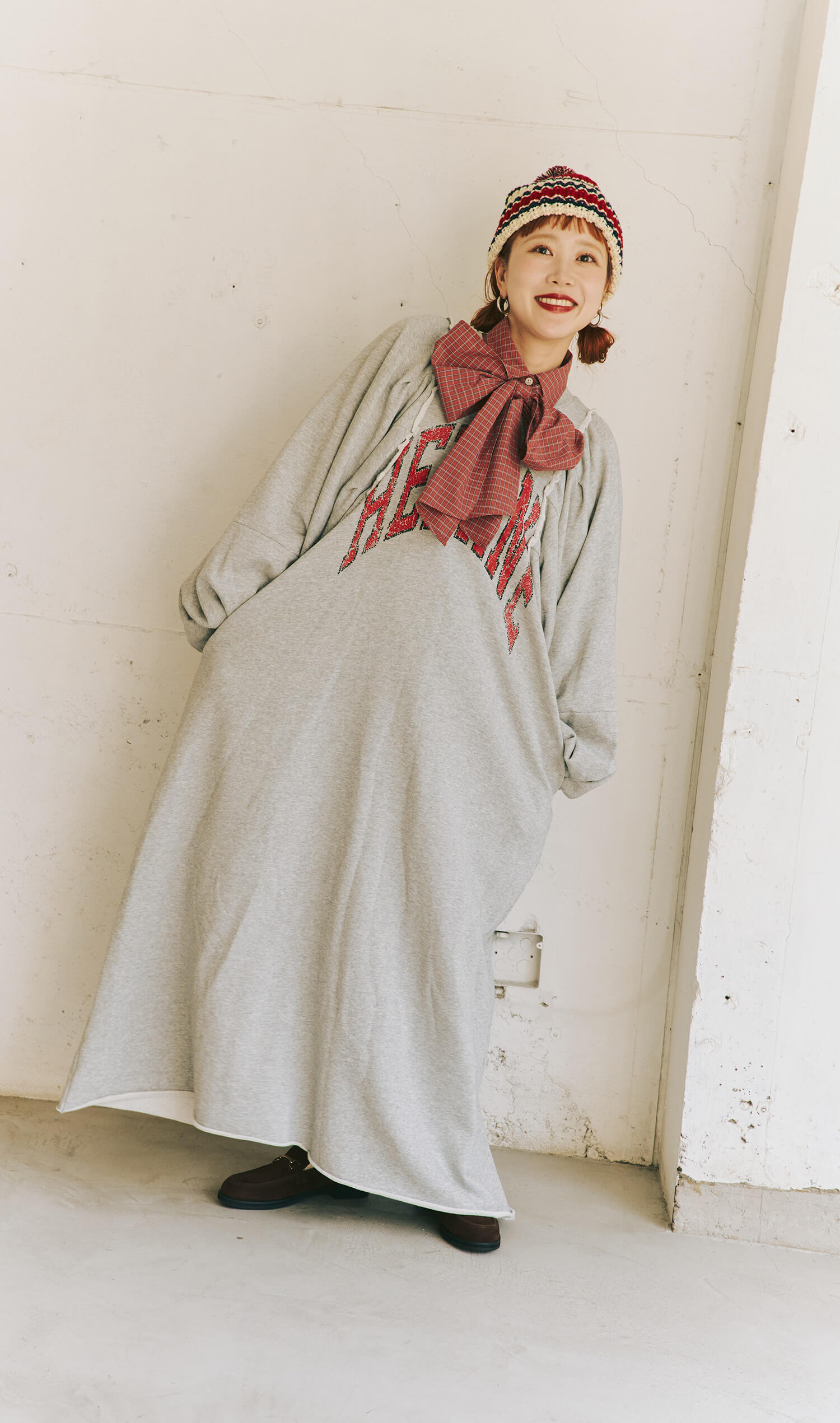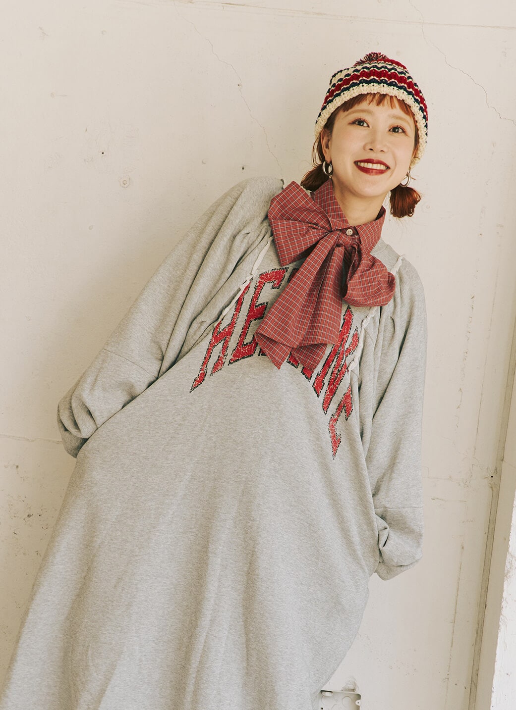 オーバーサイズのスウェットワンピースからチェック柄の大きなリボンタイを覗かせた個性派スタイル。差し色で赤を効かせたり、足元にローファーを合わせることで、カジュアルの中にちょっぴりレトロなムードを漂わせました。