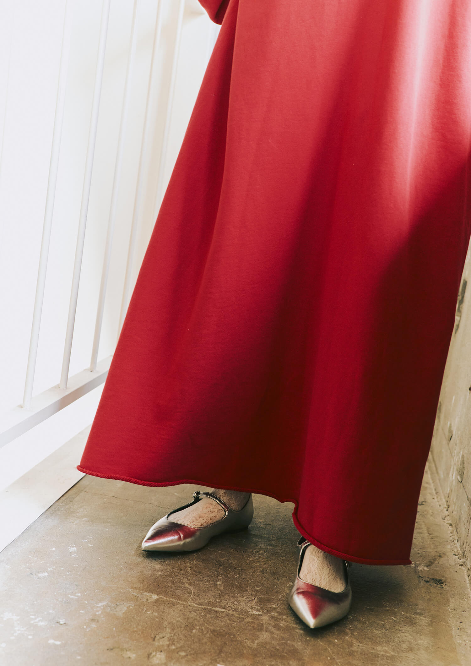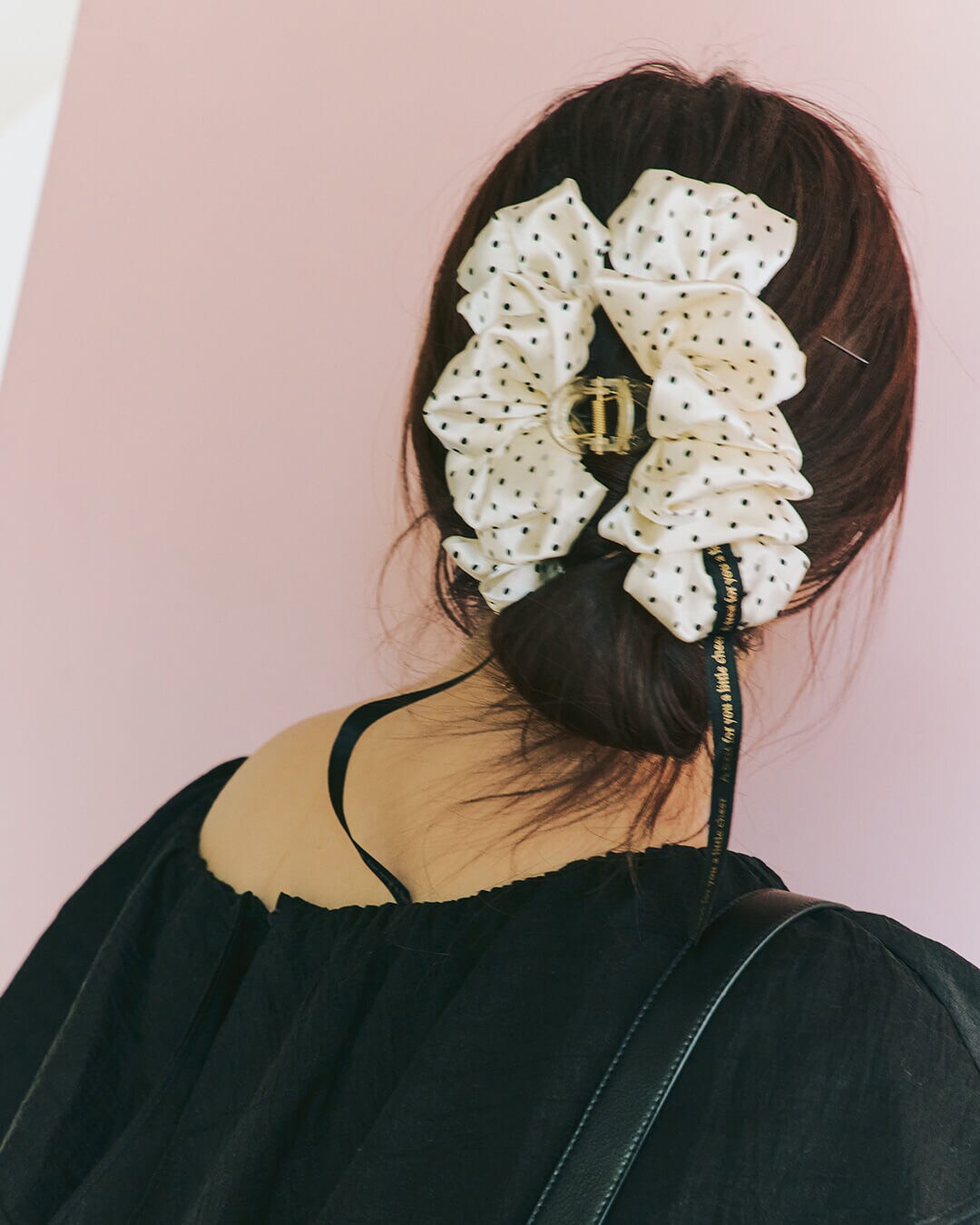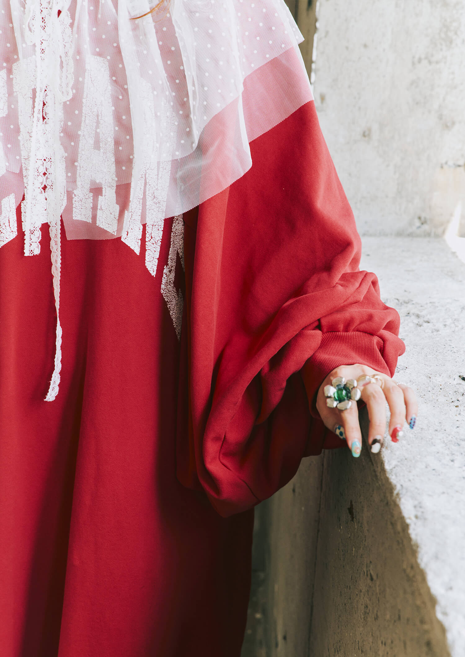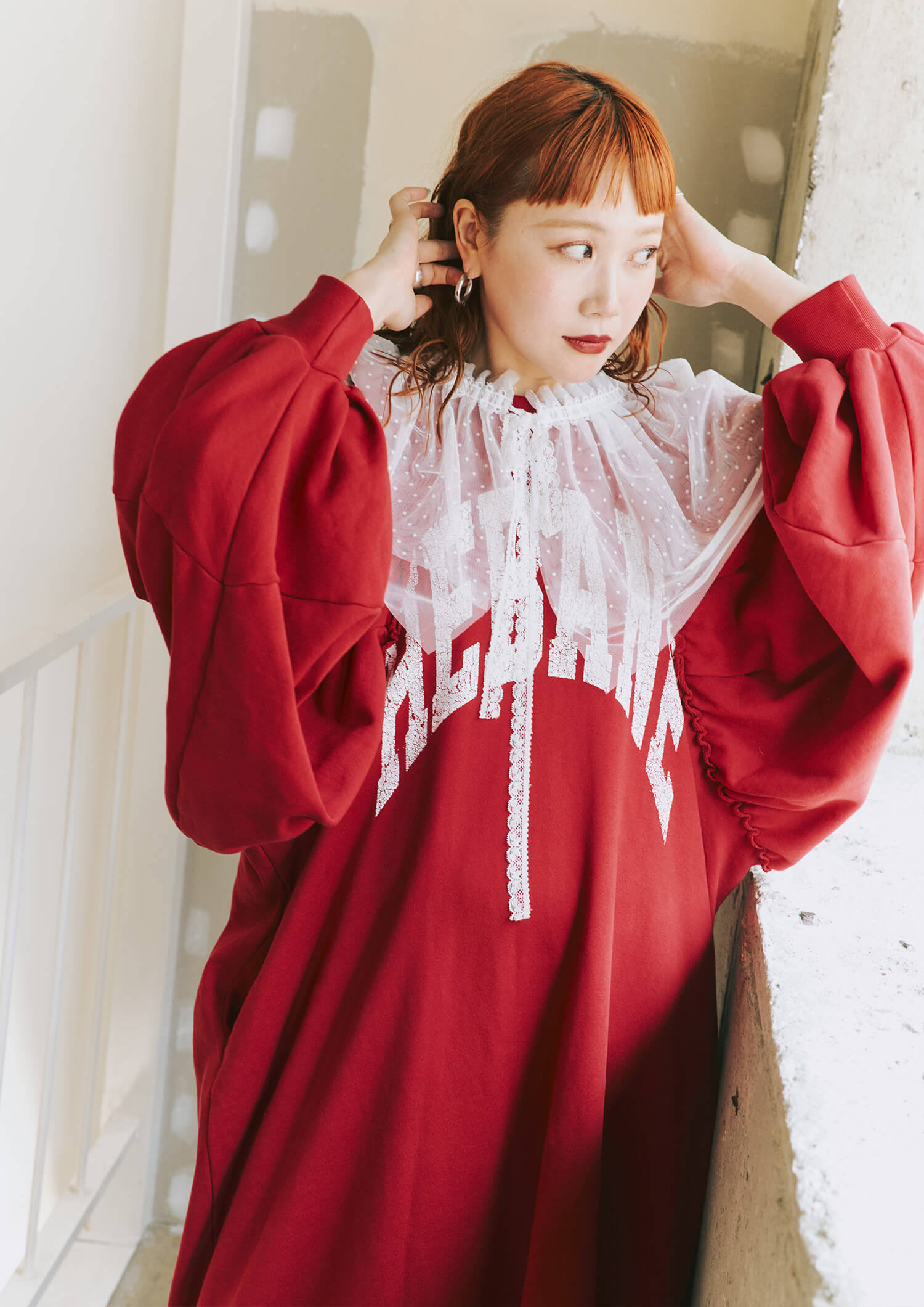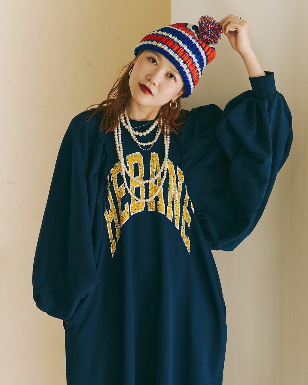 オーバーサイズのスウェットワンピースからチェック柄の大きなリボンタイを覗かせた個性派スタイル。差し色で赤を効かせたり、足元にローファーを合わせることで、カジュアルの中にちょっぴりレトロなムードを漂わせました。