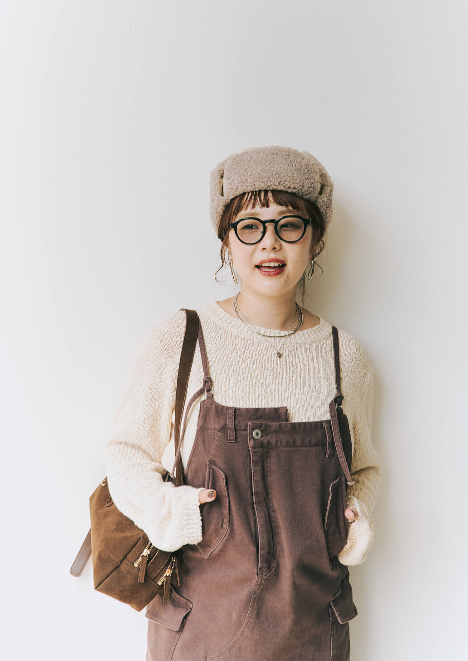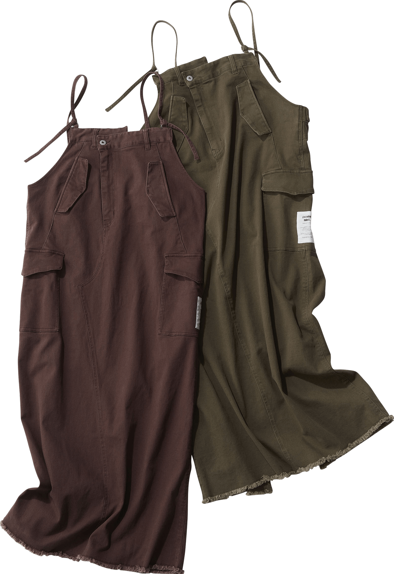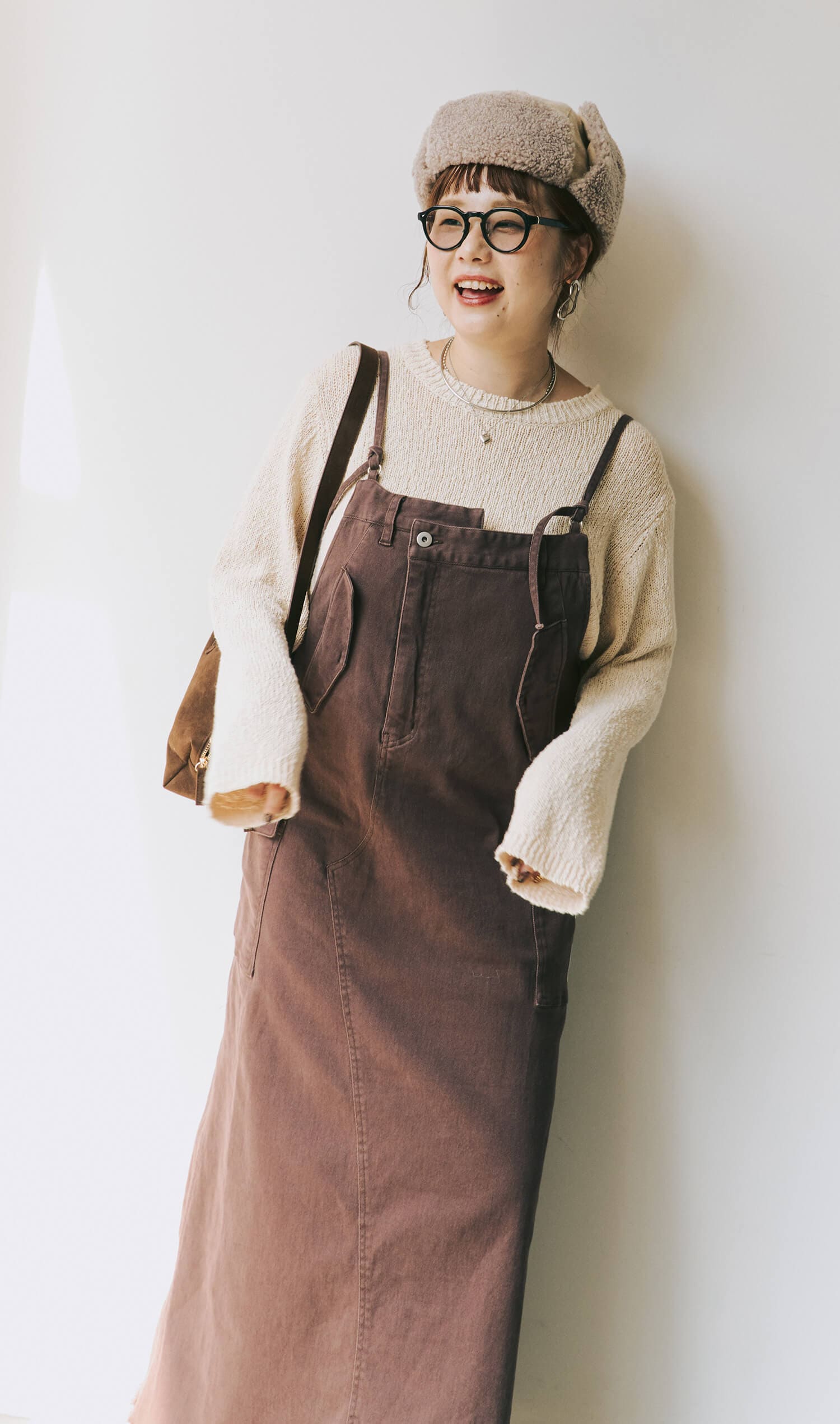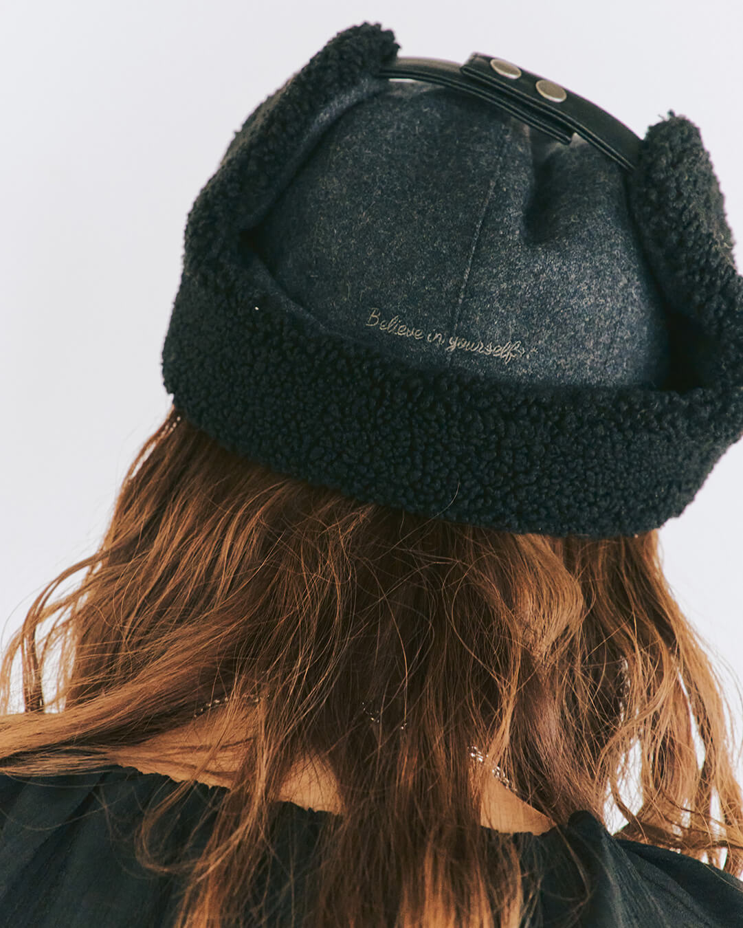 ヴィンテージ感漂うミリタリーデザインのジャンパースカートと、ボリュームのあるmamiらしいボアキャップの2アイテム。タグや刺繍でさりげなくポジティブメッセージを忍ばせているのがこだわりです!大人女子の日常コーデを、遊び心たっぷりに彩ってくれます。
