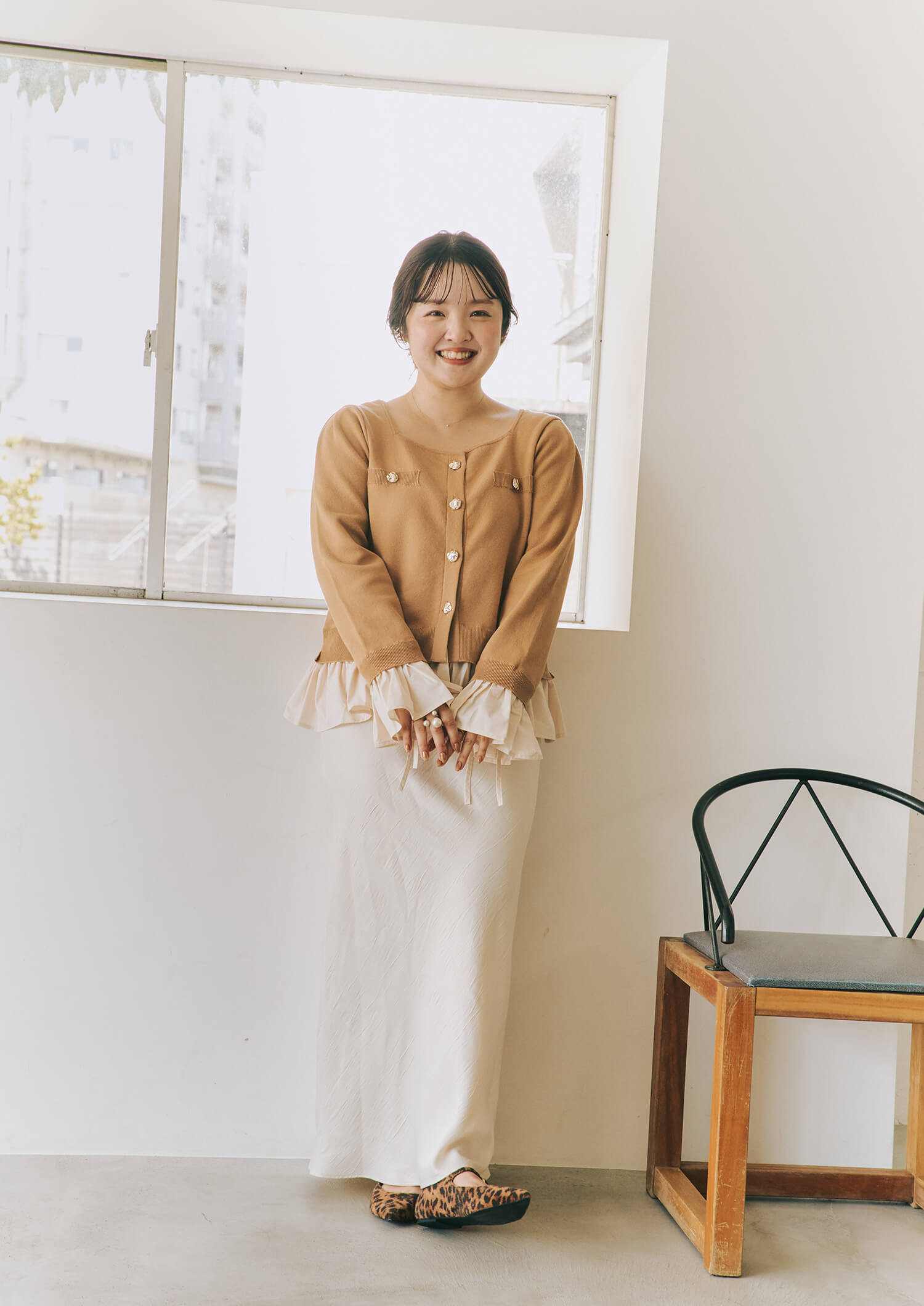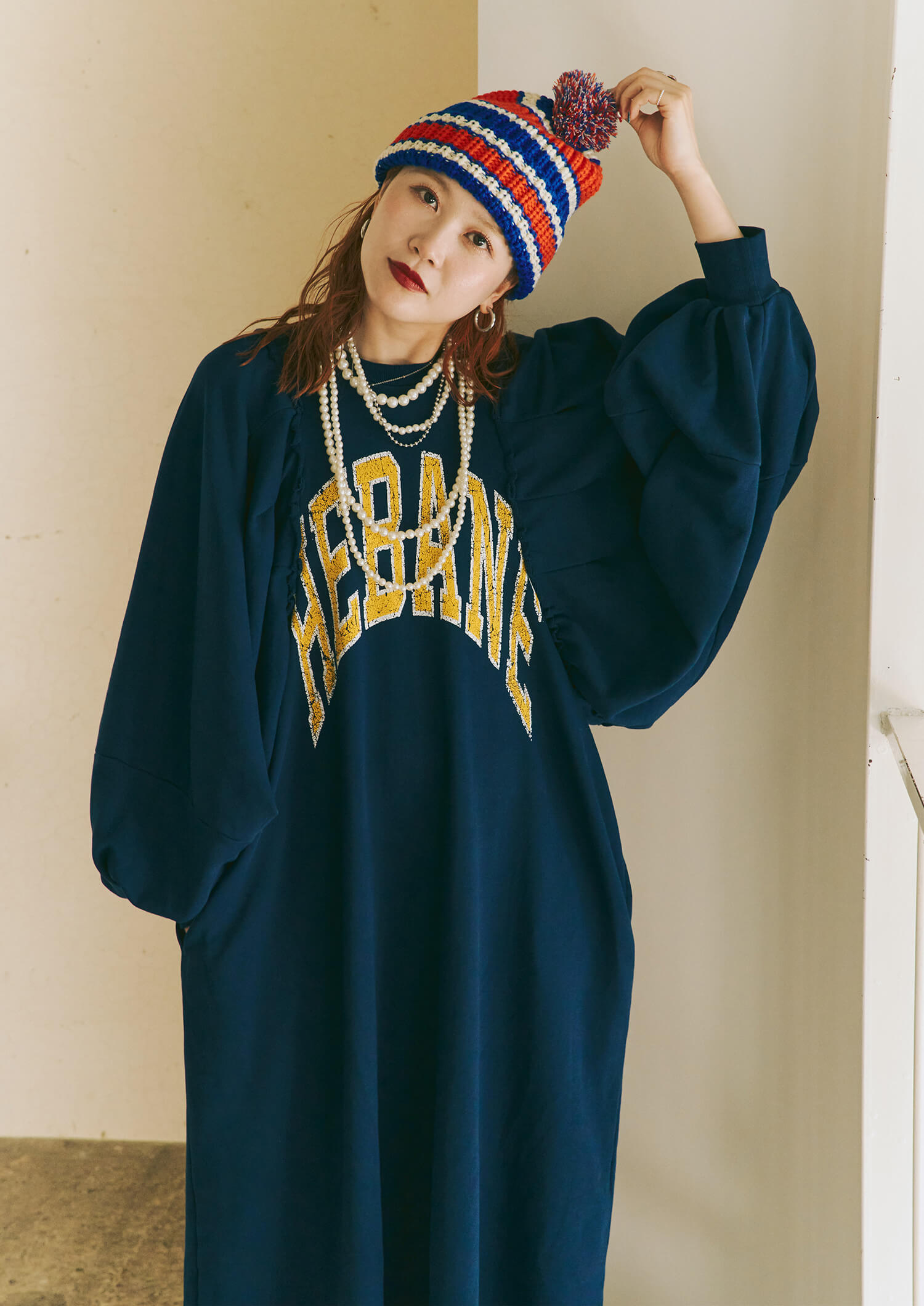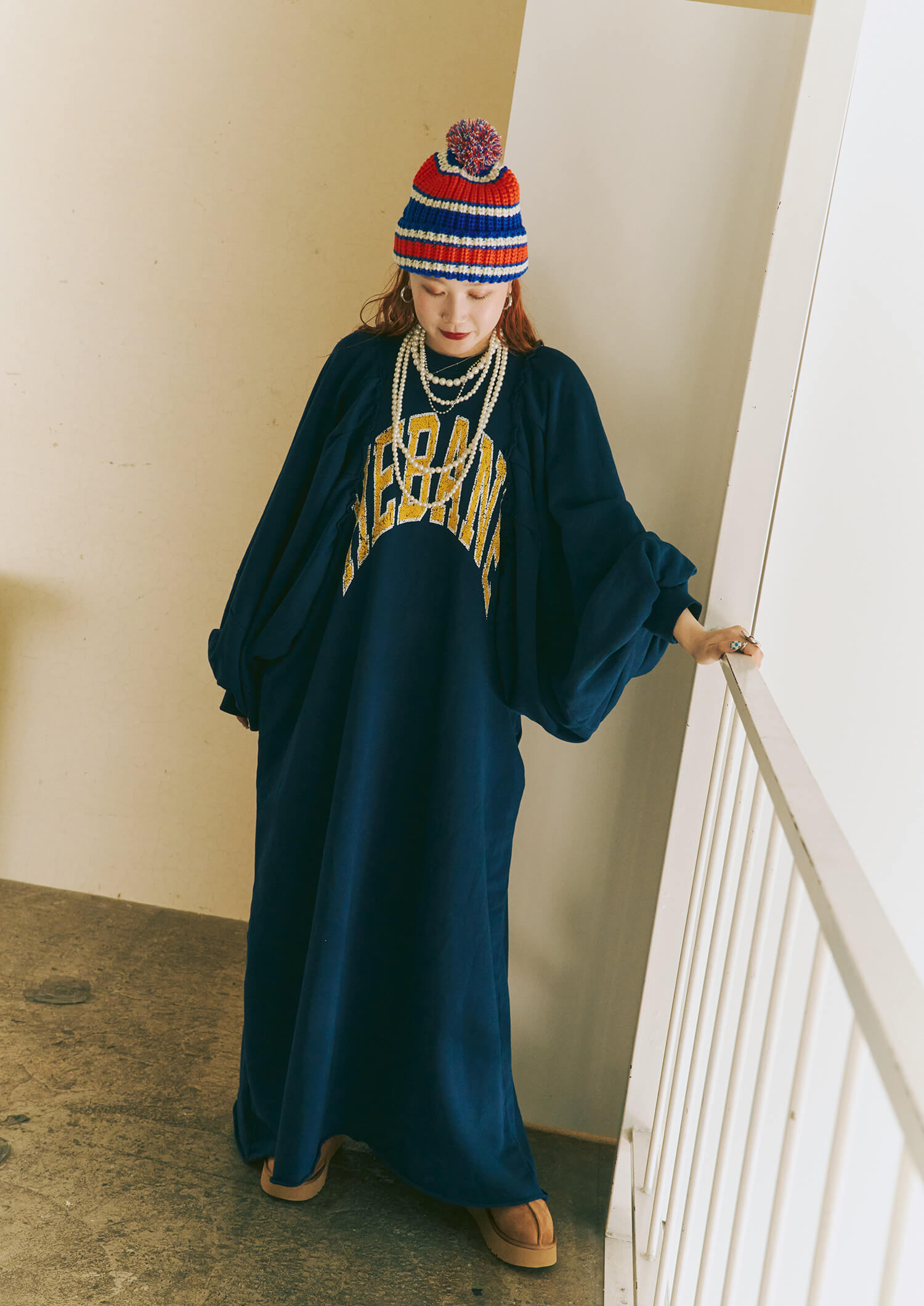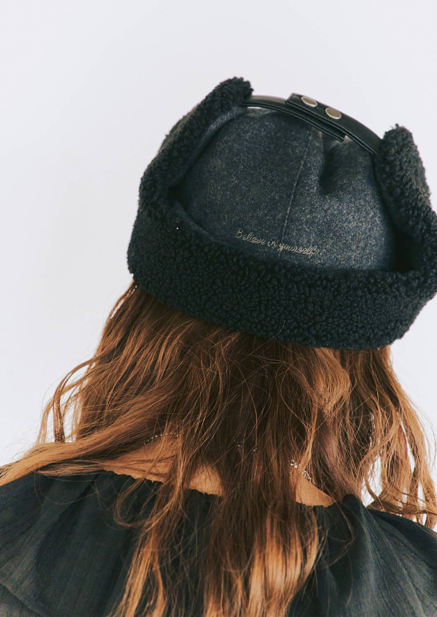 ヴィンテージ感漂うミリタリーデザインのジャンパースカートと、ボリュームのあるmamiらしいボアキャップの2アイテム。タグや刺繍でさりげなくポジティブメッセージを忍ばせているのがこだわりです!大人女子の日常コーデを、遊び心たっぷりに彩ってくれます。