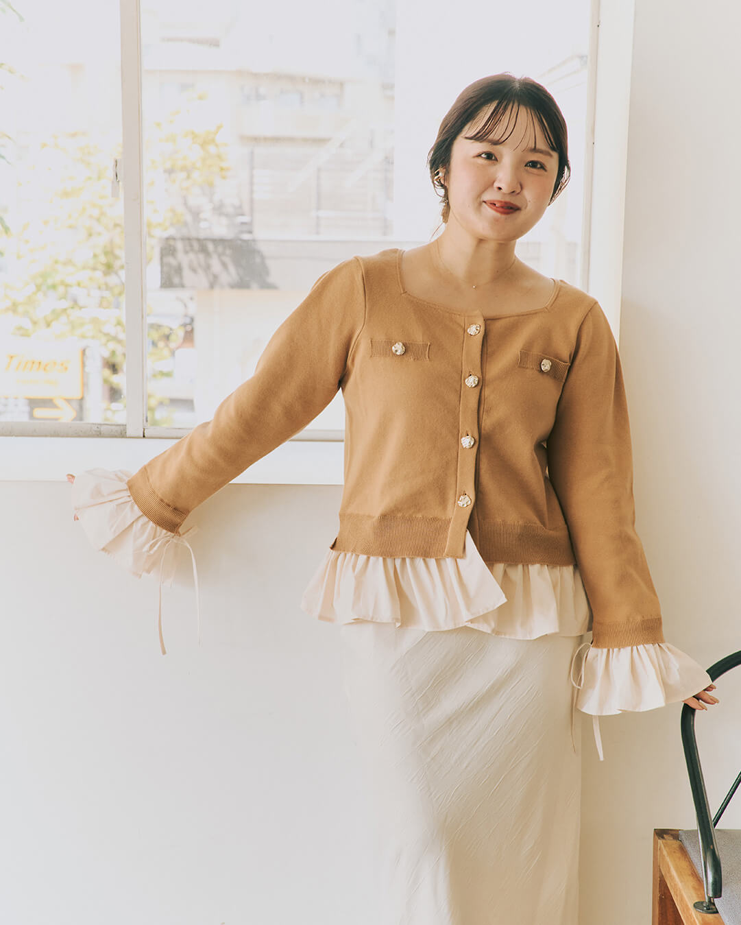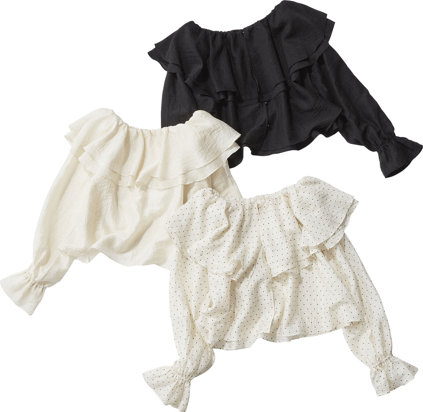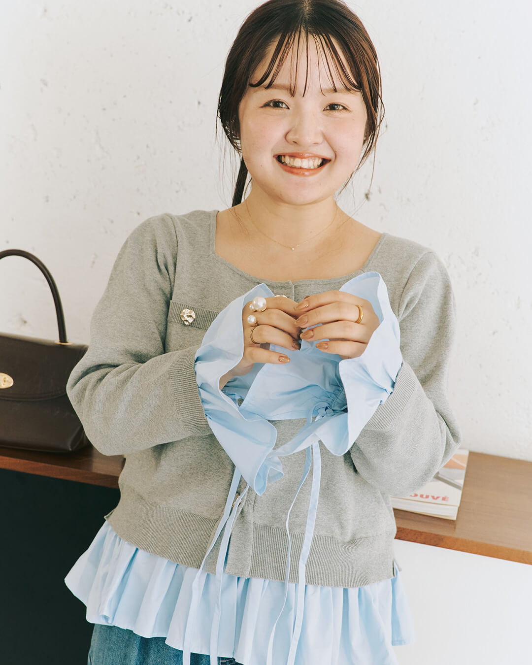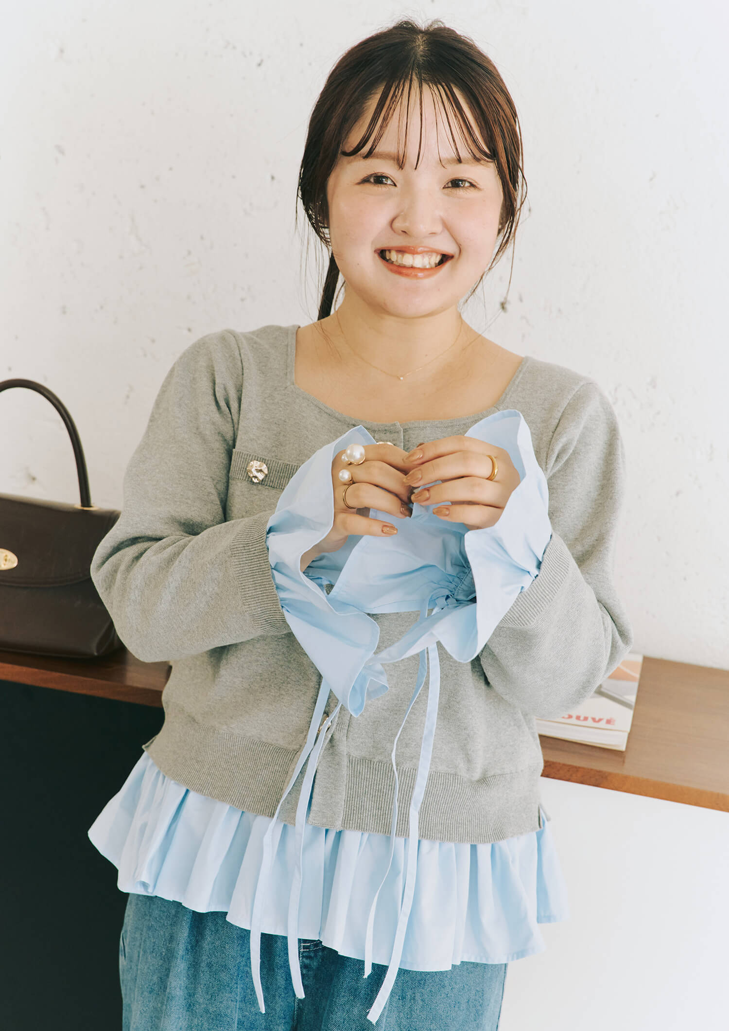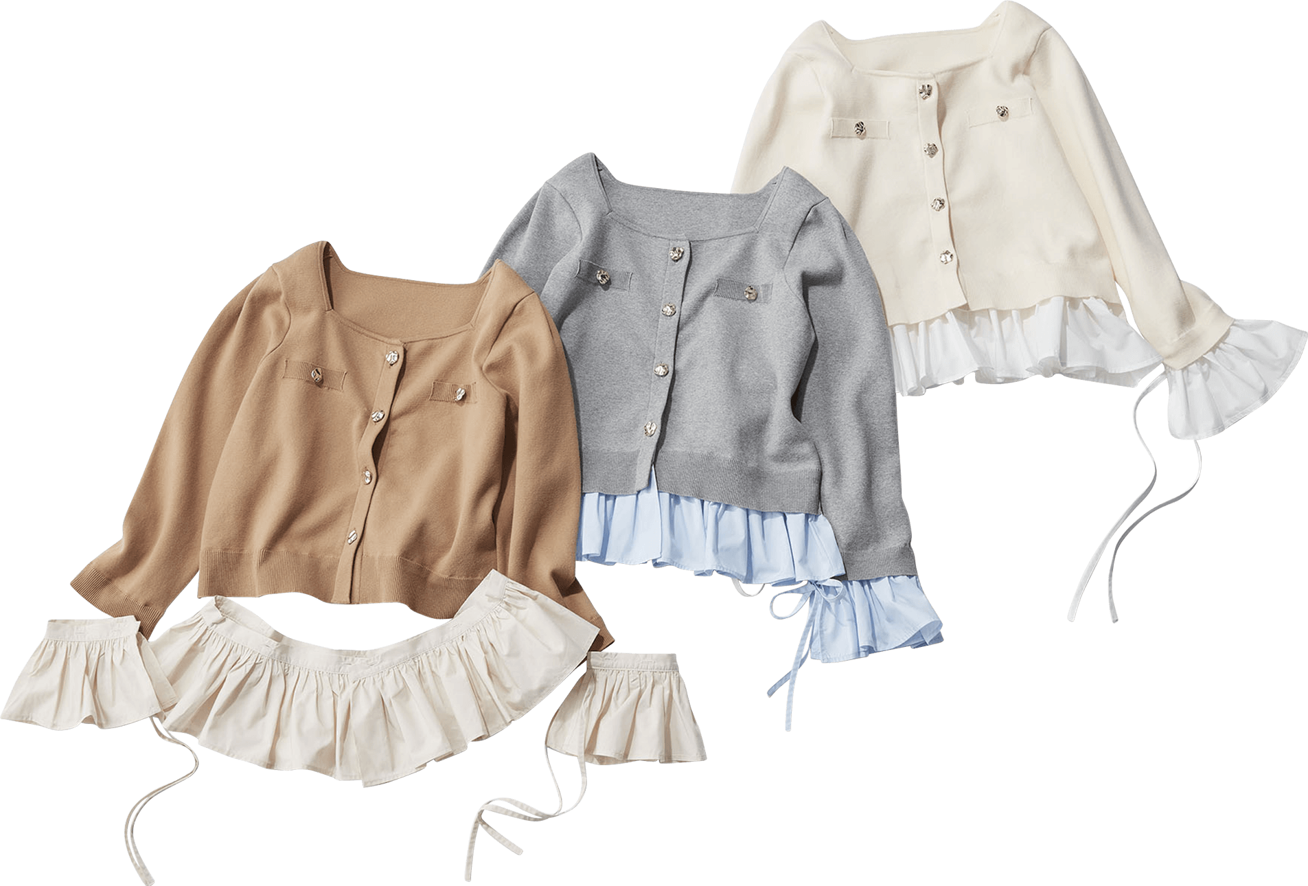 フリルたっぷりの3WAYブラウスは、一枚ではもちろんレイヤードでも着られる万能アイテム。カーディガンは、裾や袖のフリルが取り外し可能なのがこだわりです。透け感のあるヘアバンスはミニポーチ付きで、ヘアも持ち物もかわいく彩ってくれること間違いなしです!