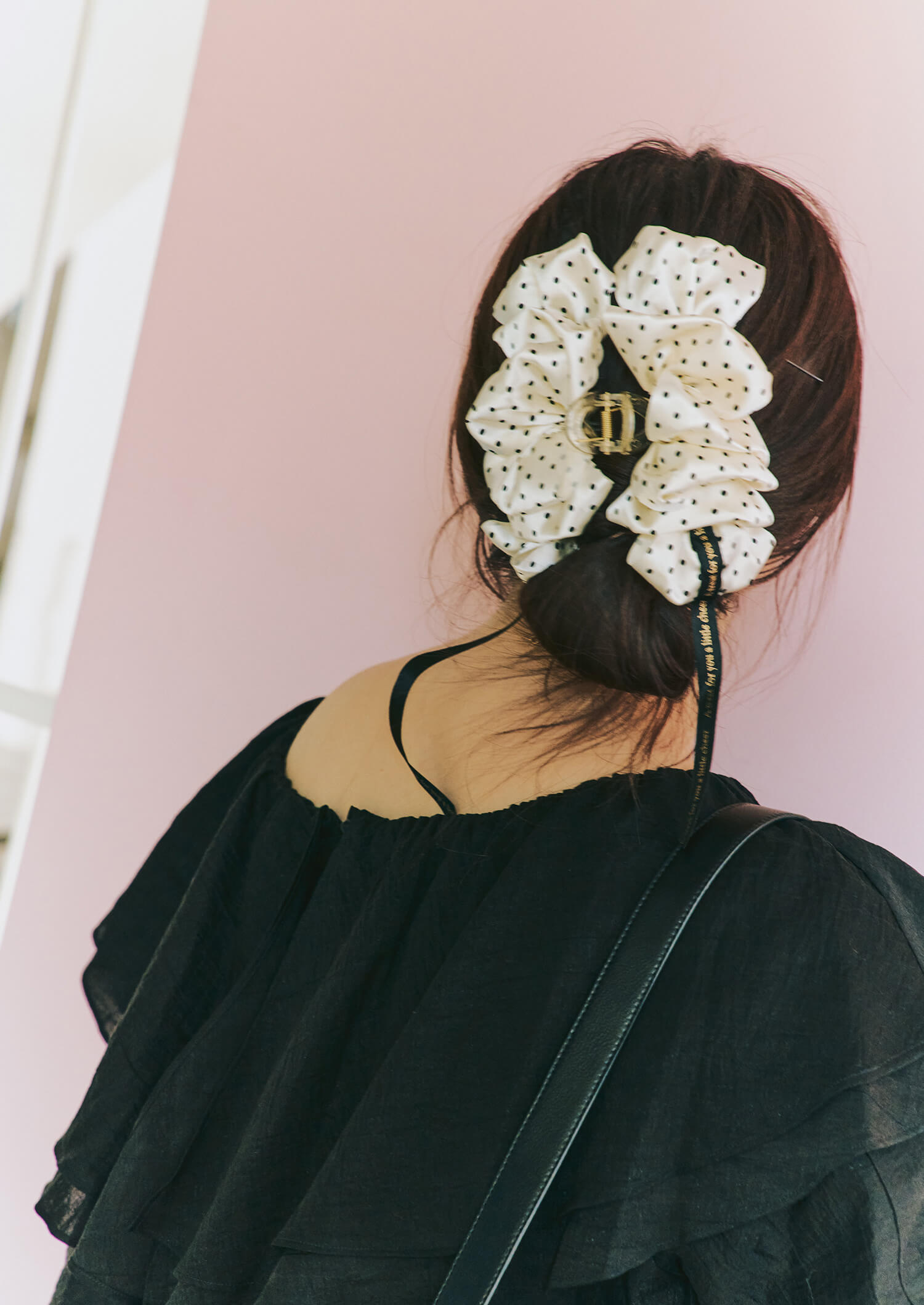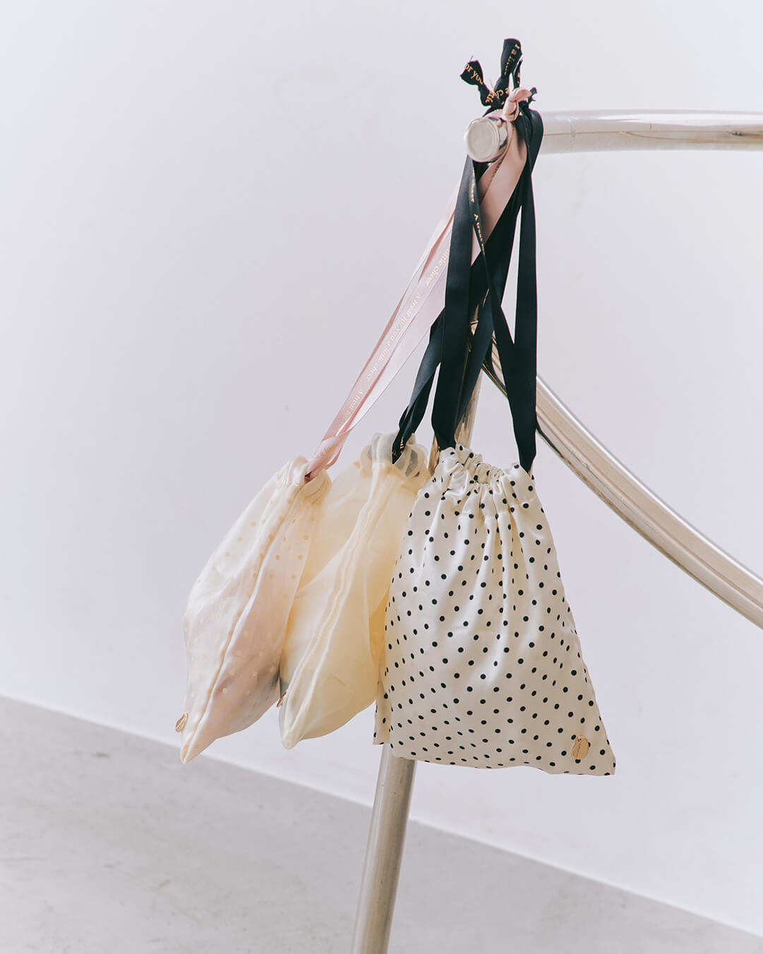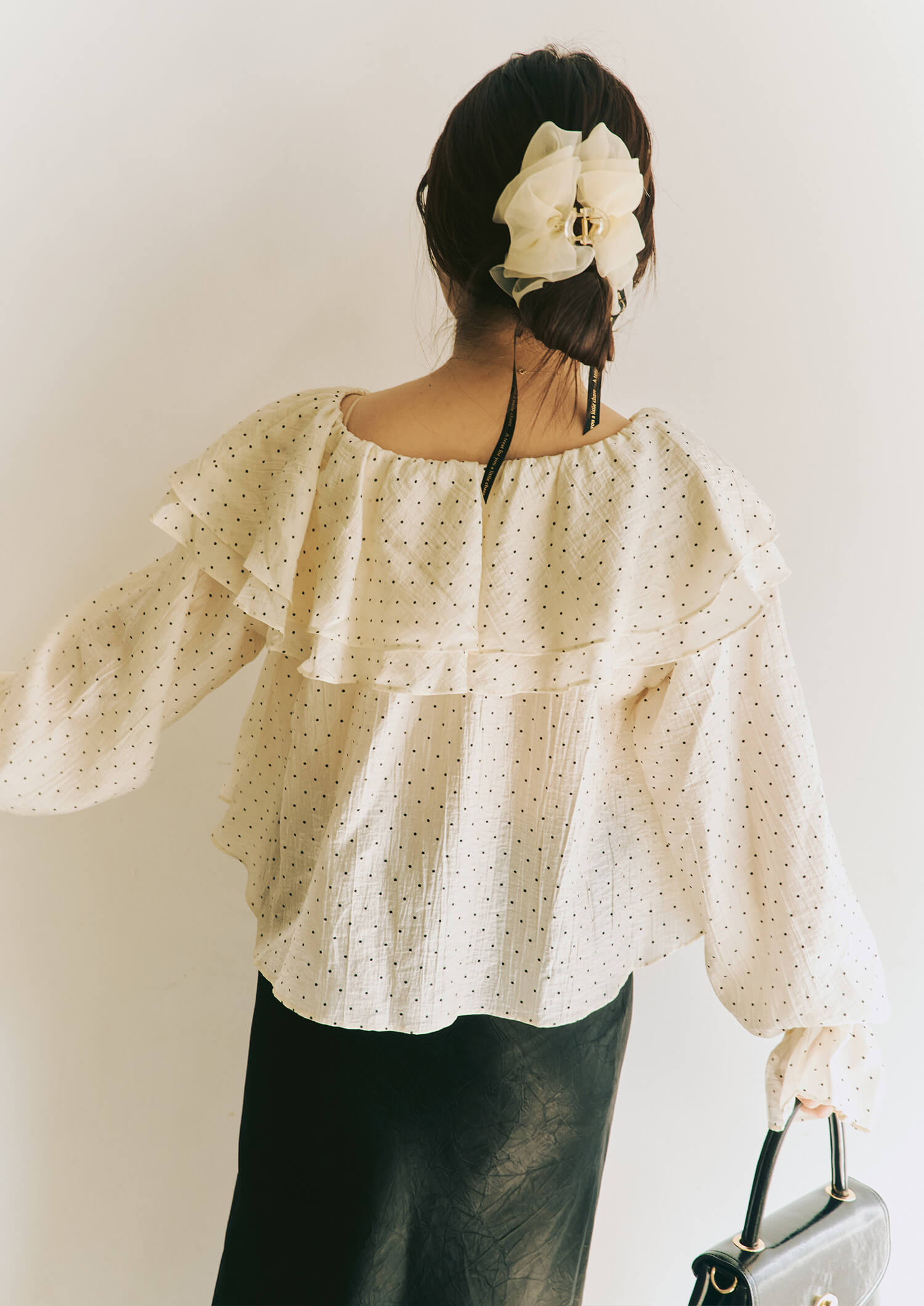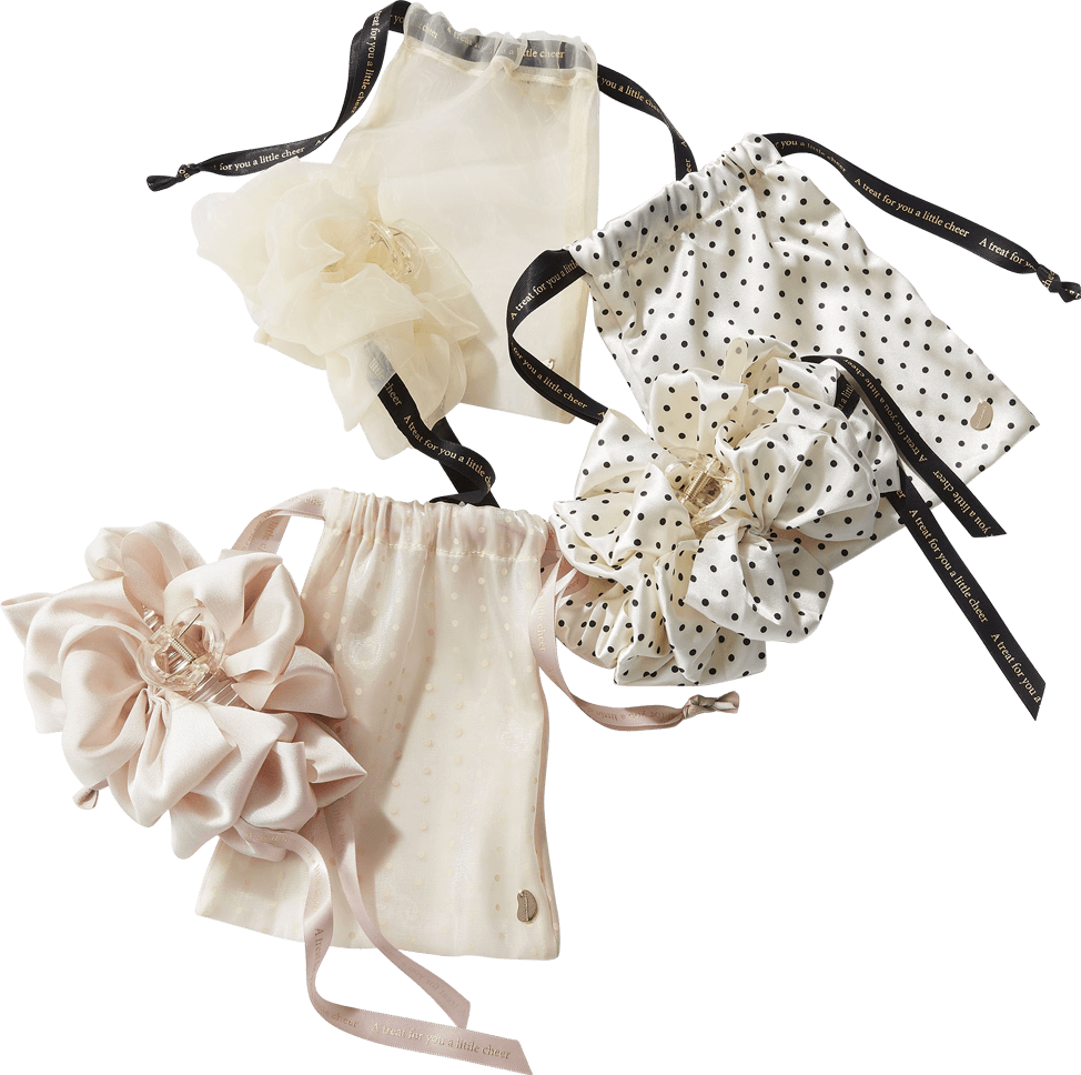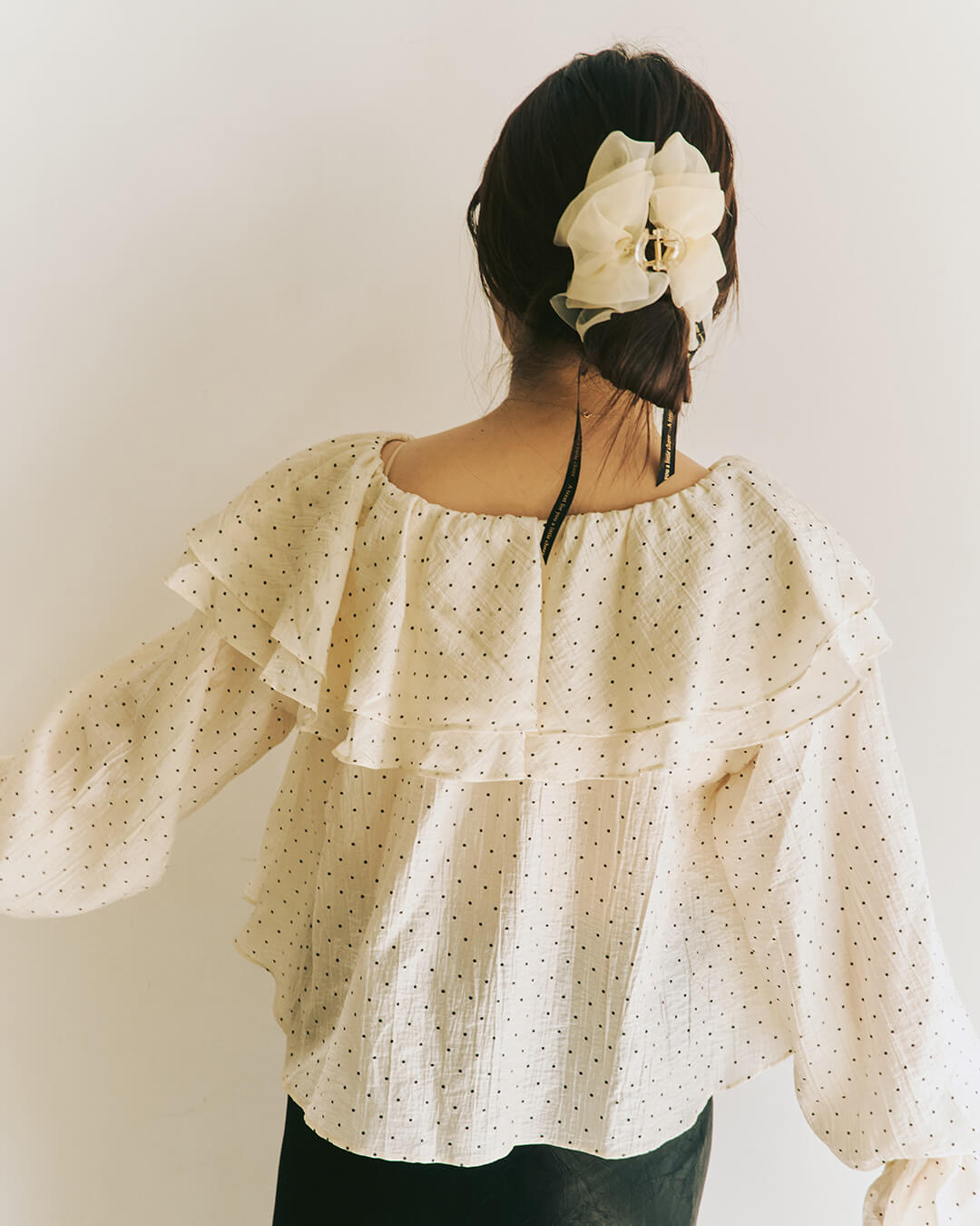 フリルたっぷりの3WAYブラウスは、一枚ではもちろんレイヤードでも着られる万能アイテム。カーディガンは、裾や袖のフリルが取り外し可能なのがこだわりです。透け感のあるヘアバンスはミニポーチ付きで、ヘアも持ち物もかわいく彩ってくれること間違いなしです!