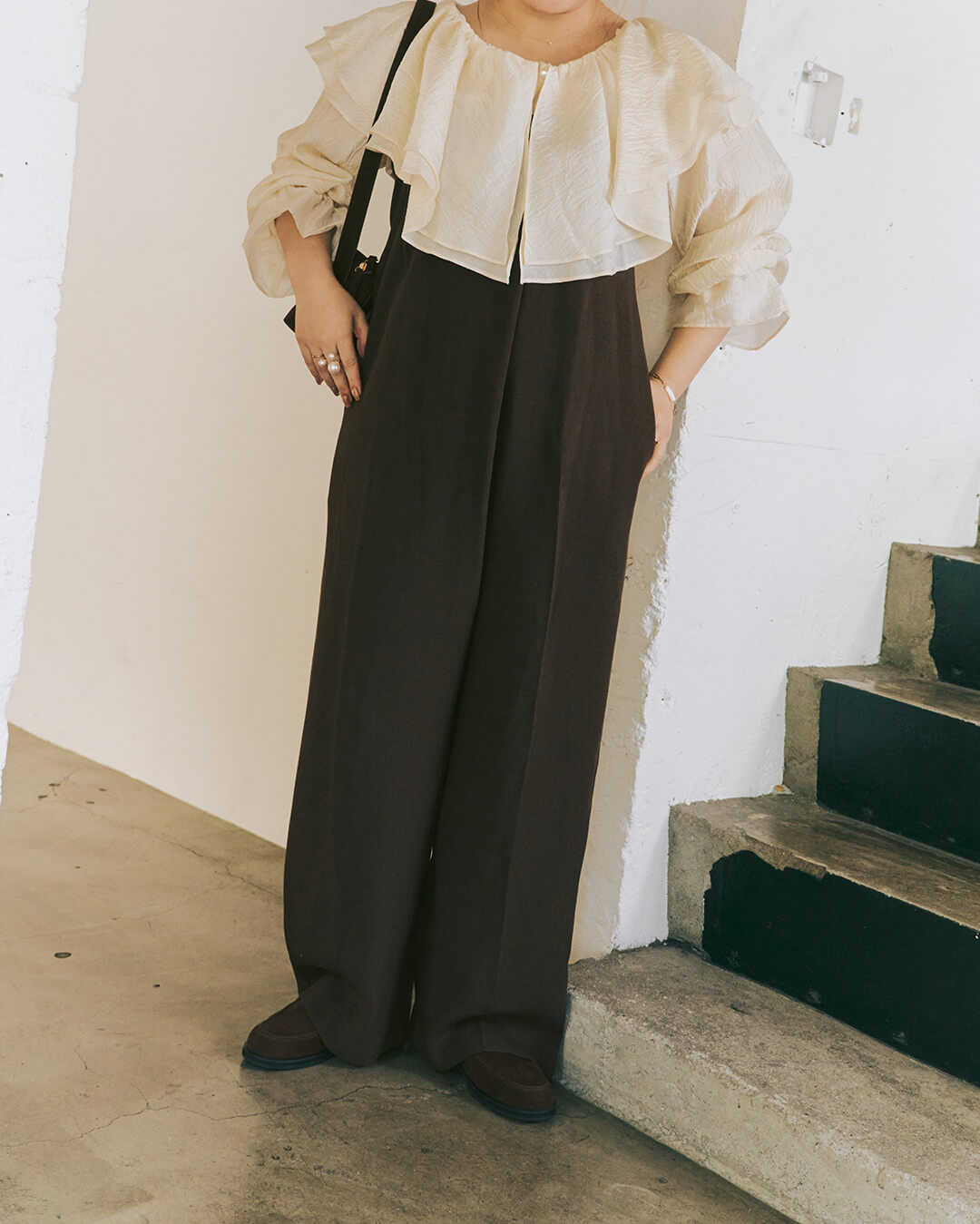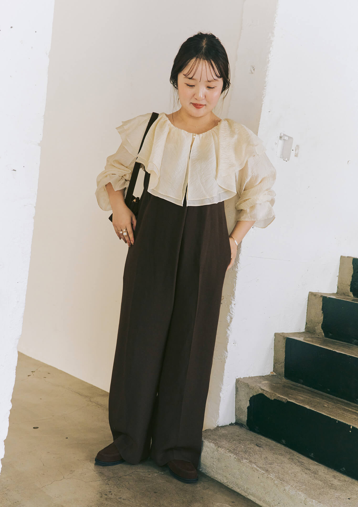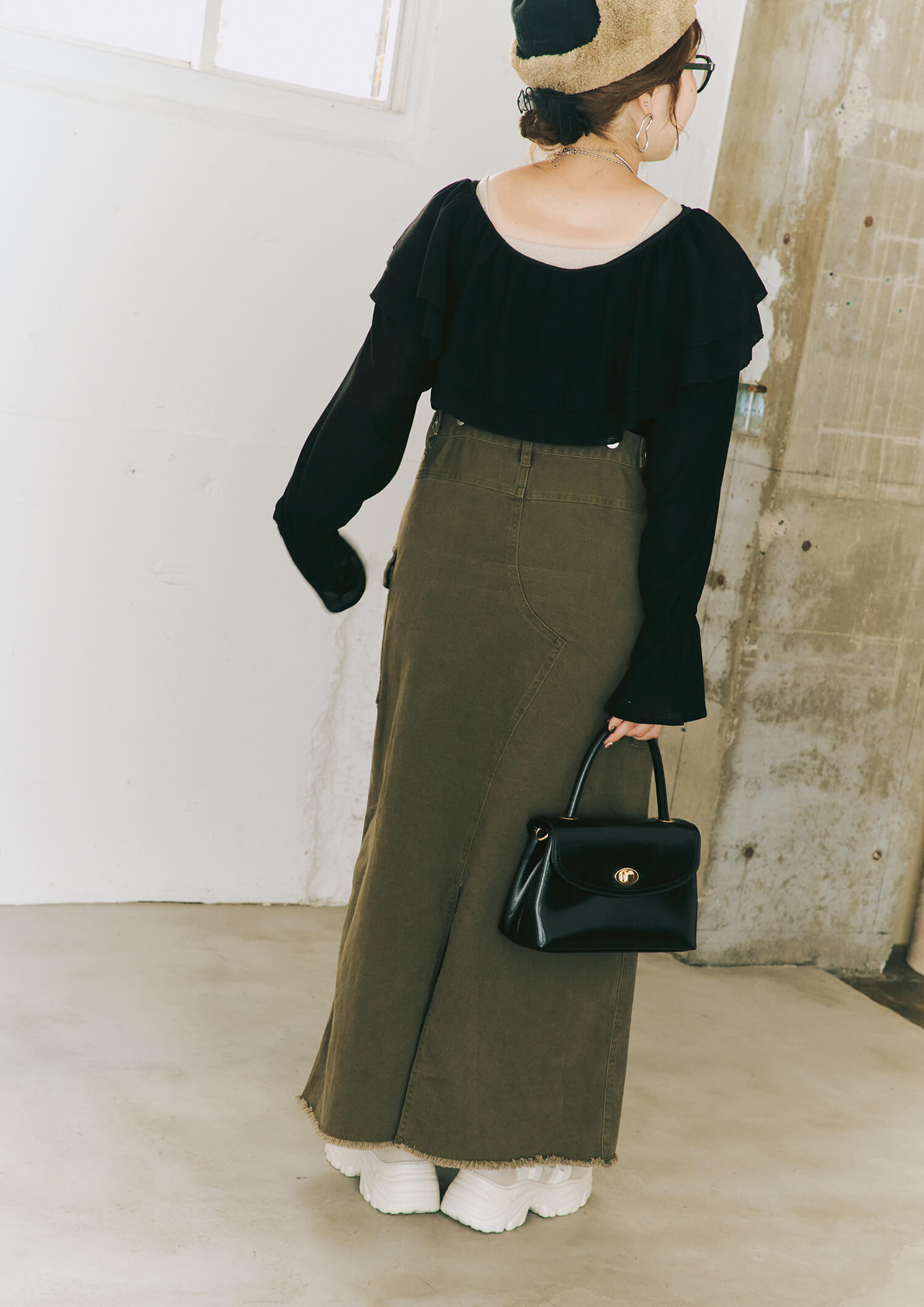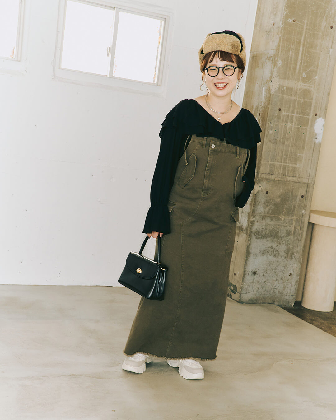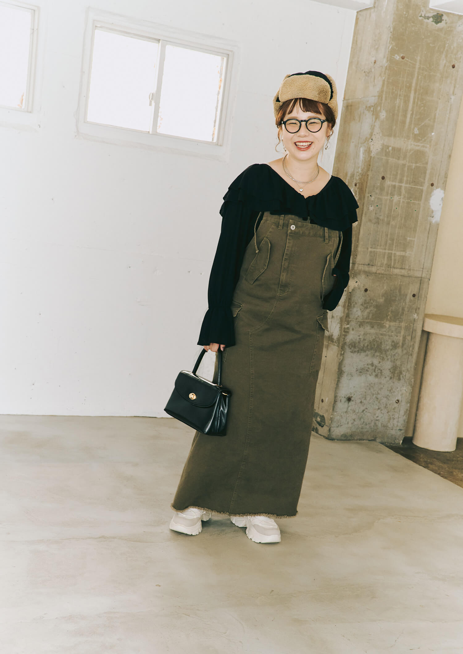 フリルの襟がかわいいブラウスに、カーキのジャンパースカートを合わせて甘辛ミックスコーデに。小物も黒でまとめることで、甘くなりすぎず大人カジュアルが楽しめます。子どもとお出かけできるように、足元はスニーカーで。