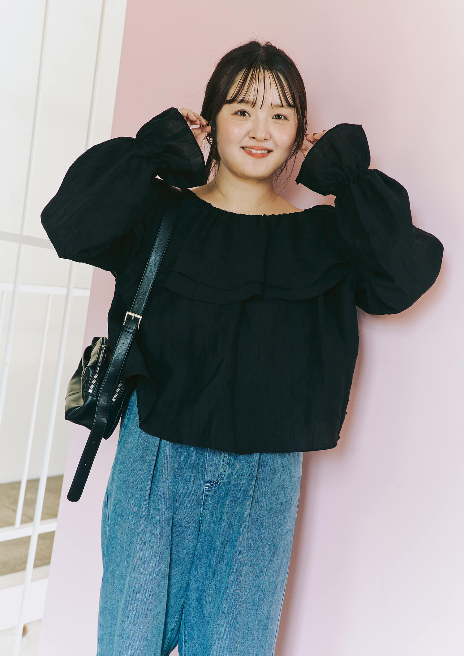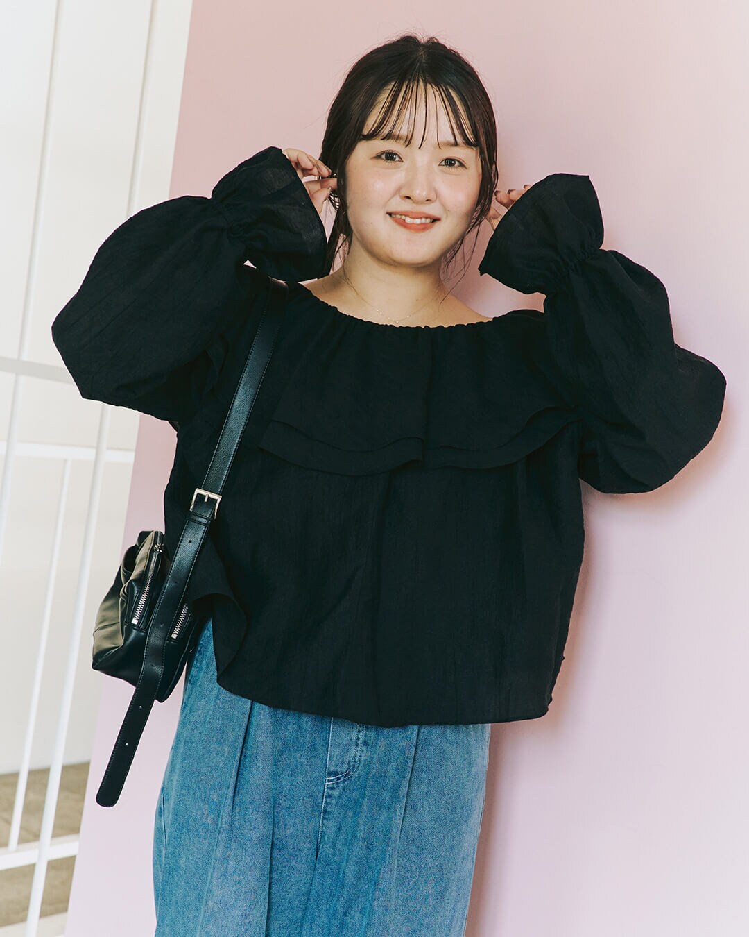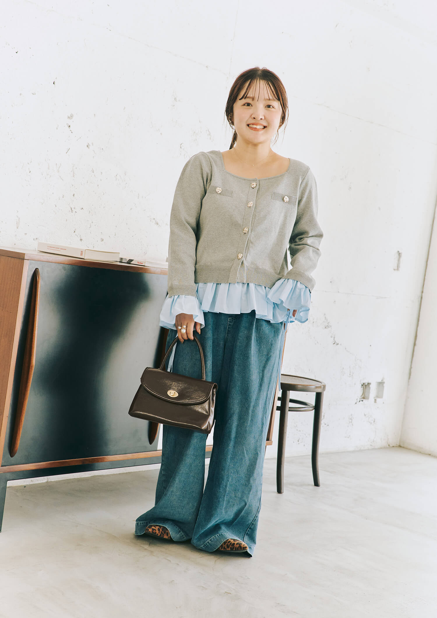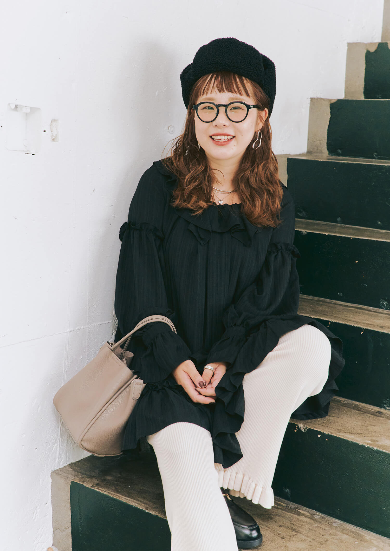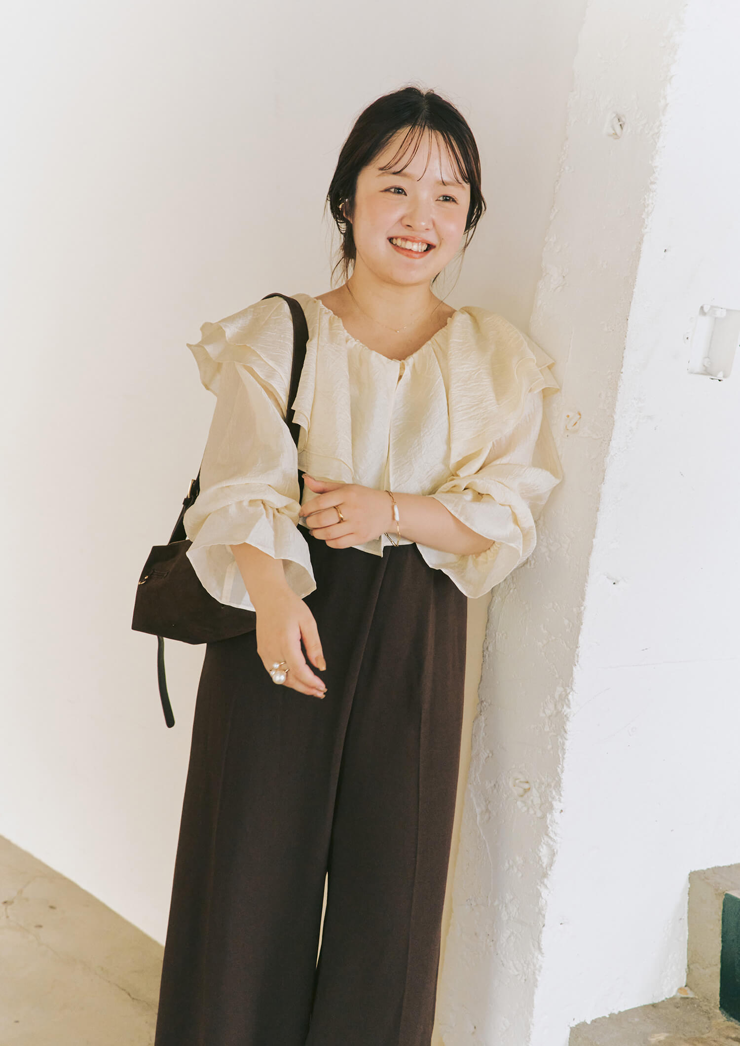 フリルの襟がかわいいブラウスに、カーキのジャンパースカートを合わせて甘辛ミックスコーデに。小物も黒でまとめることで、甘くなりすぎず大人カジュアルが楽しめます。子どもとお出かけできるように、足元はスニーカーで。