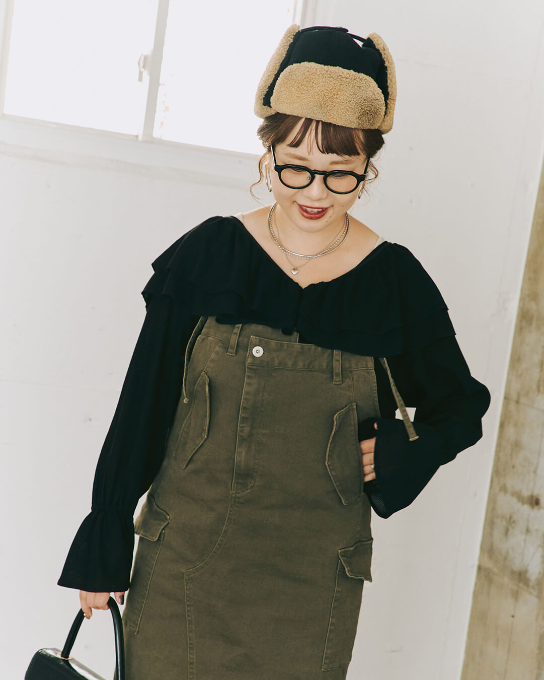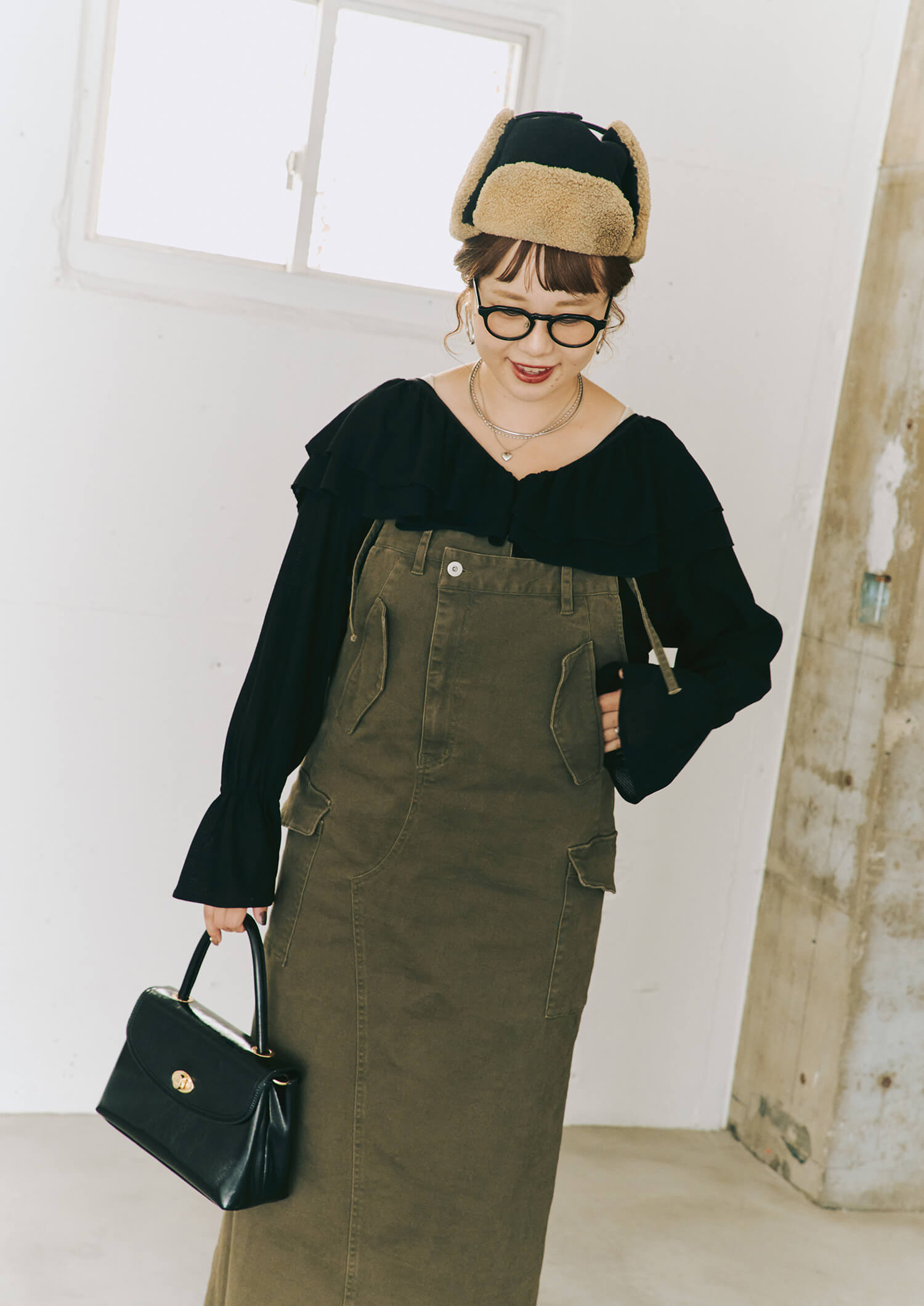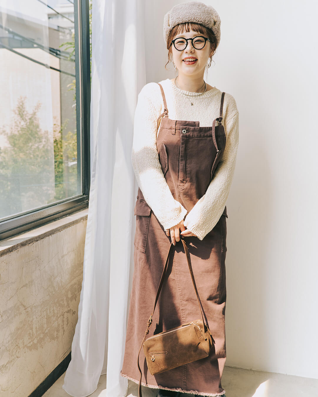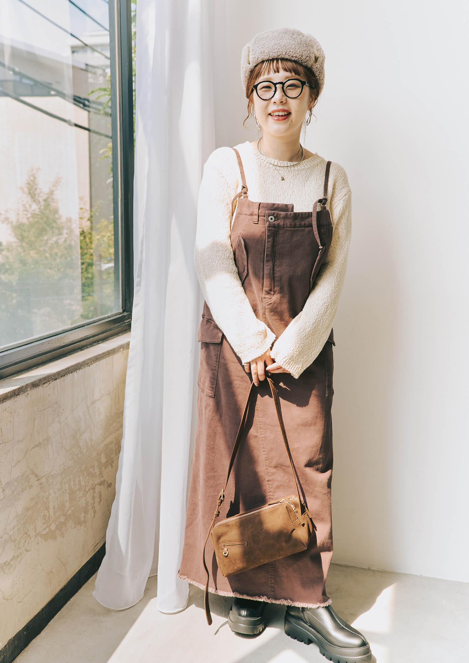 ミリタリー風のデザインで洒落感のあるジャンパースカート。ニットやスウェード調のバッグを合わせることで、秋らしくやわらかい雰囲気に仕上げました。ボリューム感のあるボアキャップとの相性も抜群です。