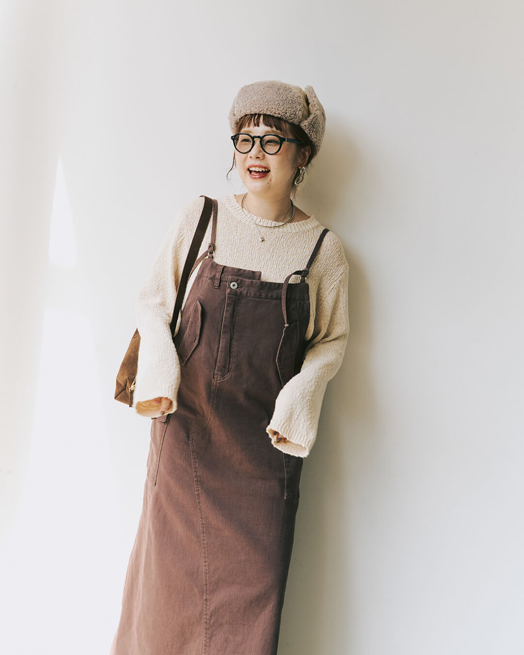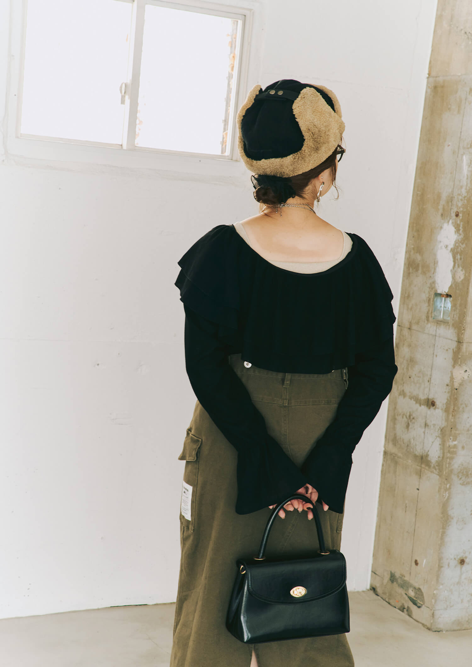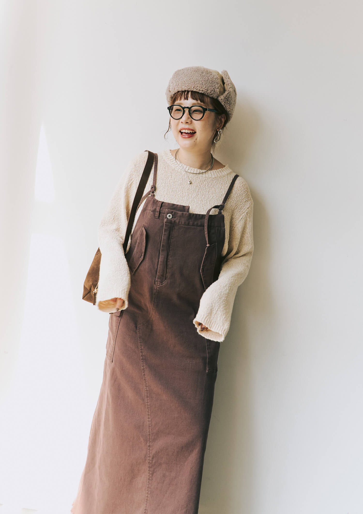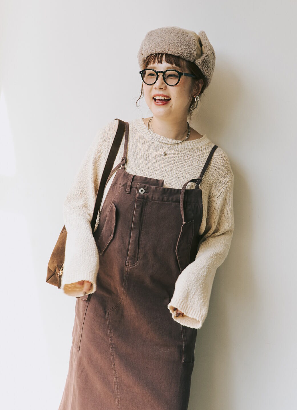 ミリタリー風のデザインで洒落感のあるジャンパースカート。ニットやスウェード調のバッグを合わせることで、秋らしくやわらかい雰囲気に仕上げました。ボリューム感のあるボアキャップとの相性も抜群です。