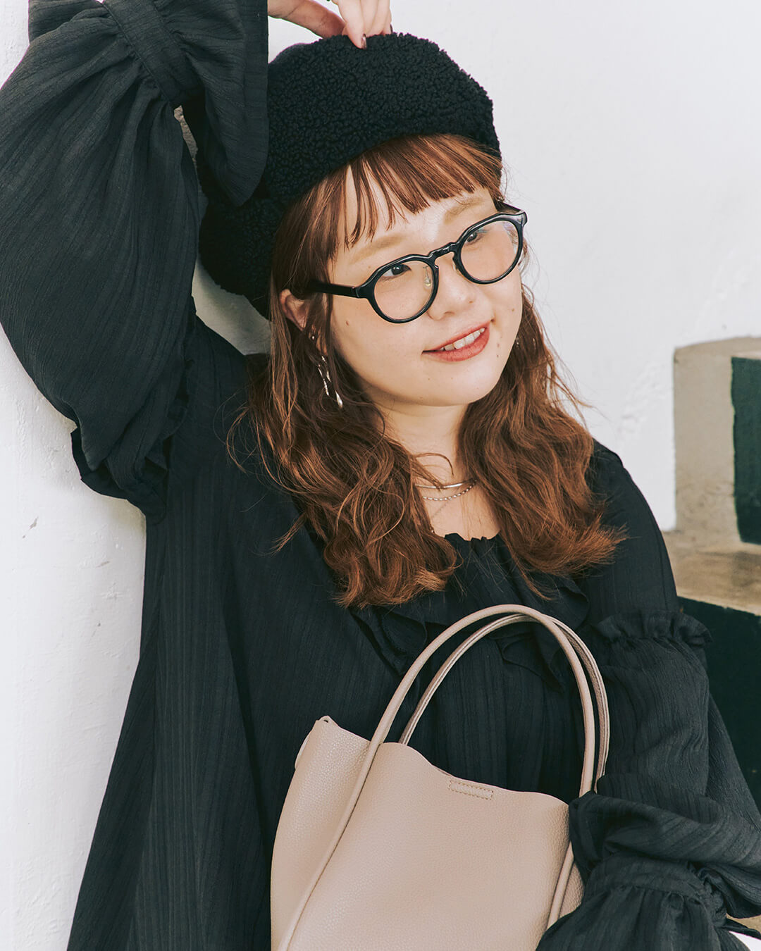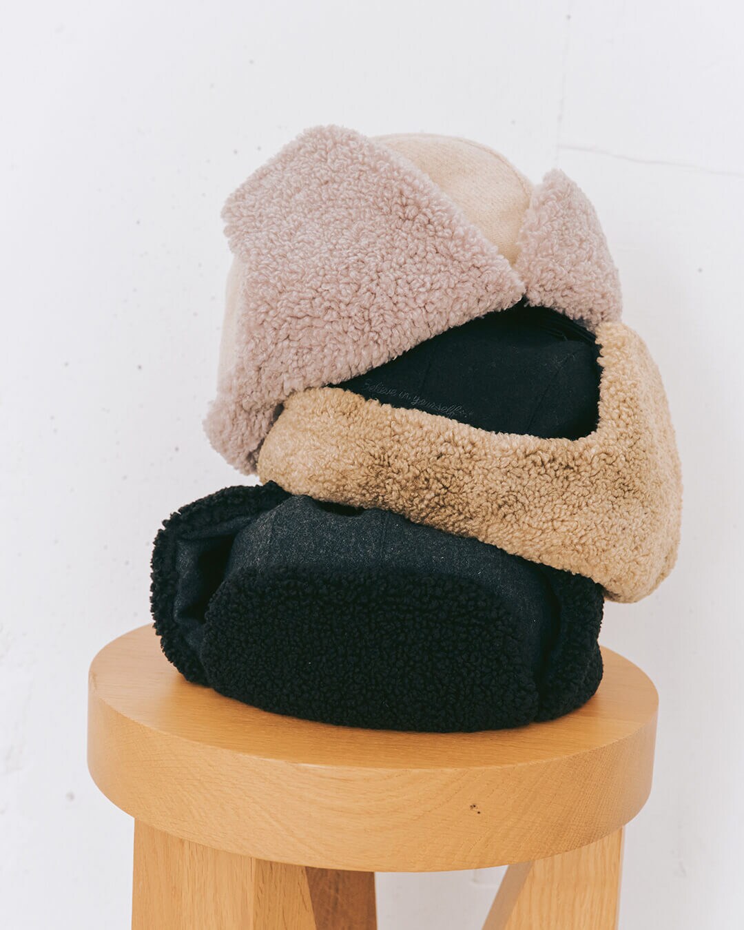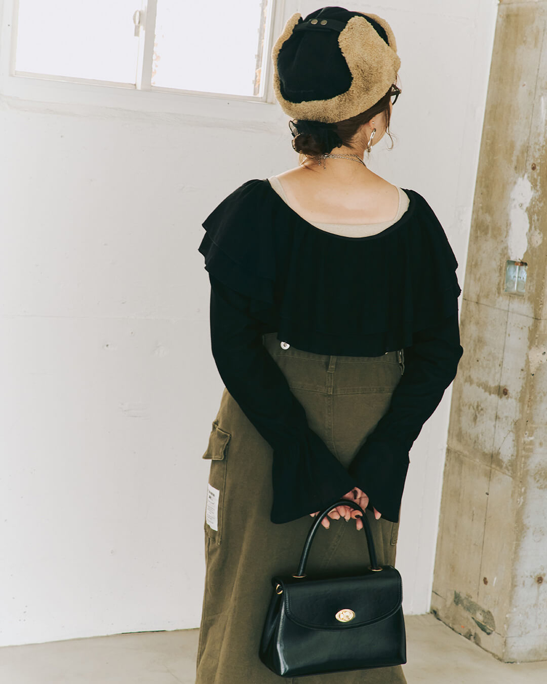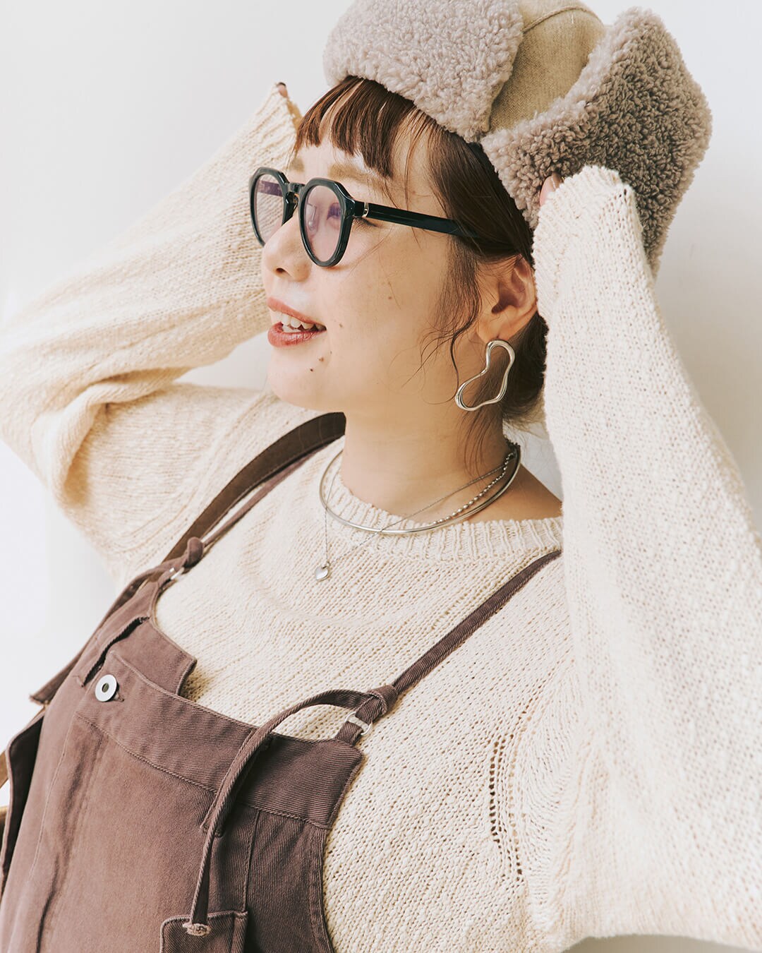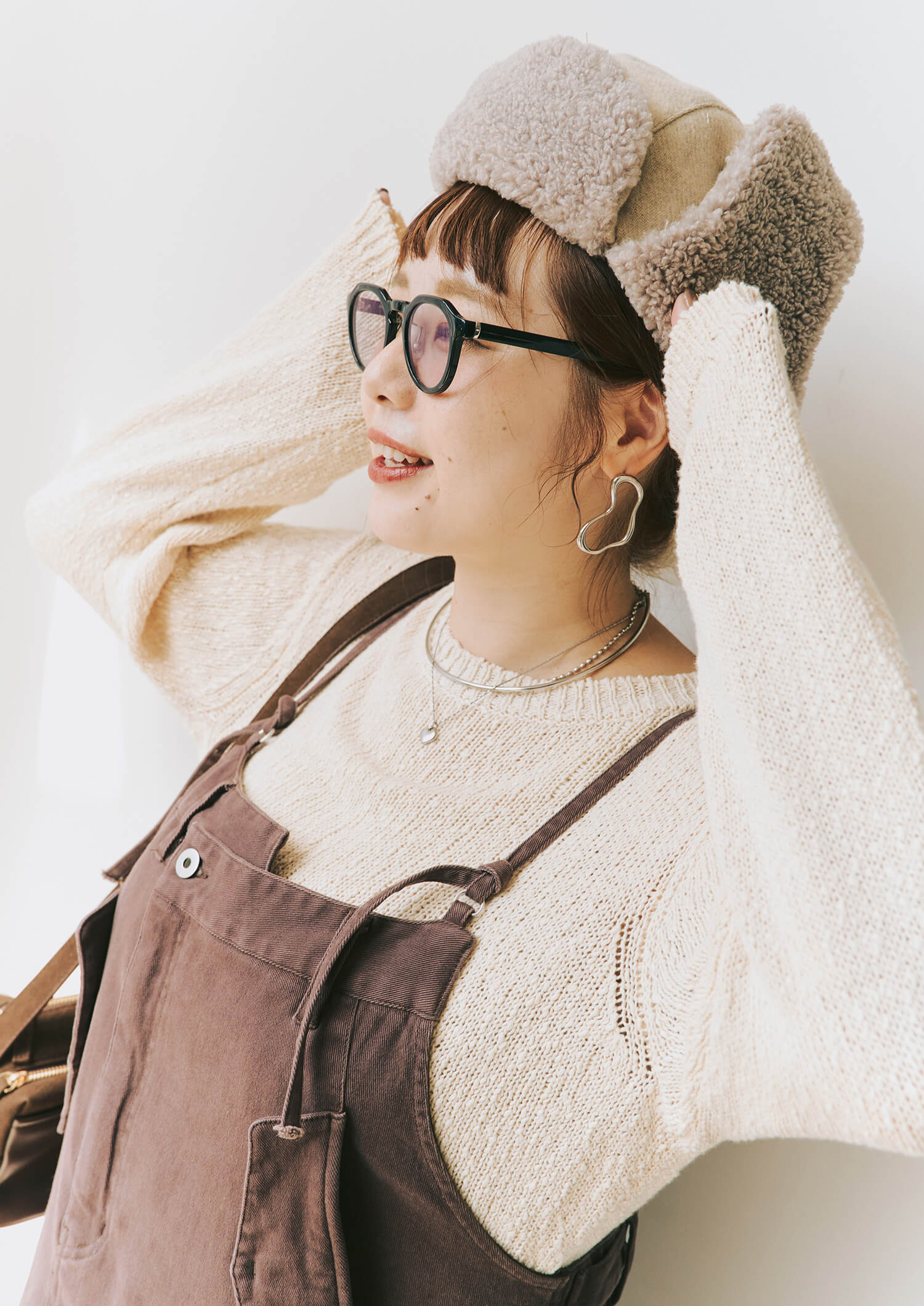 ミリタリー風のデザインで洒落感のあるジャンパースカート。ニットやスウェード調のバッグを合わせることで、秋らしくやわらかい雰囲気に仕上げました。ボリューム感のあるボアキャップとの相性も抜群です。