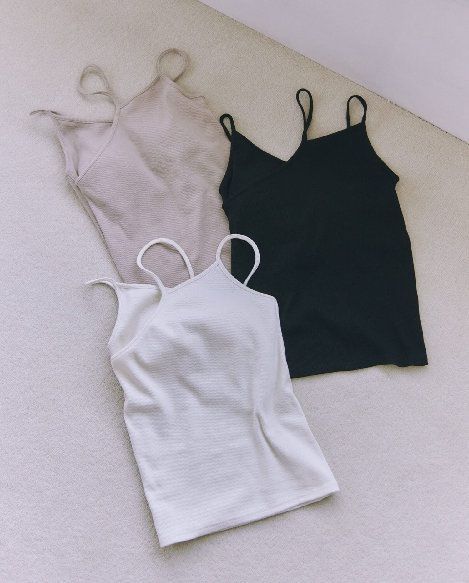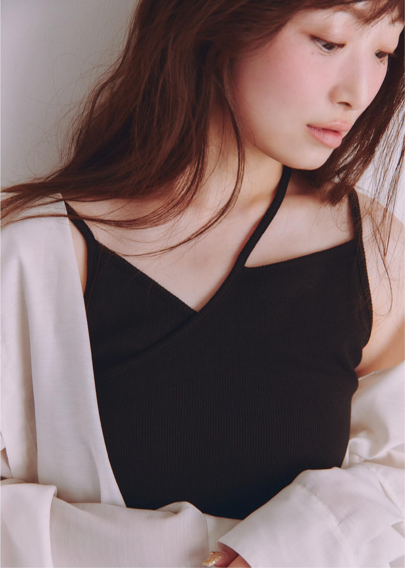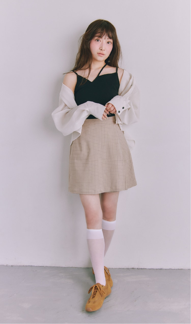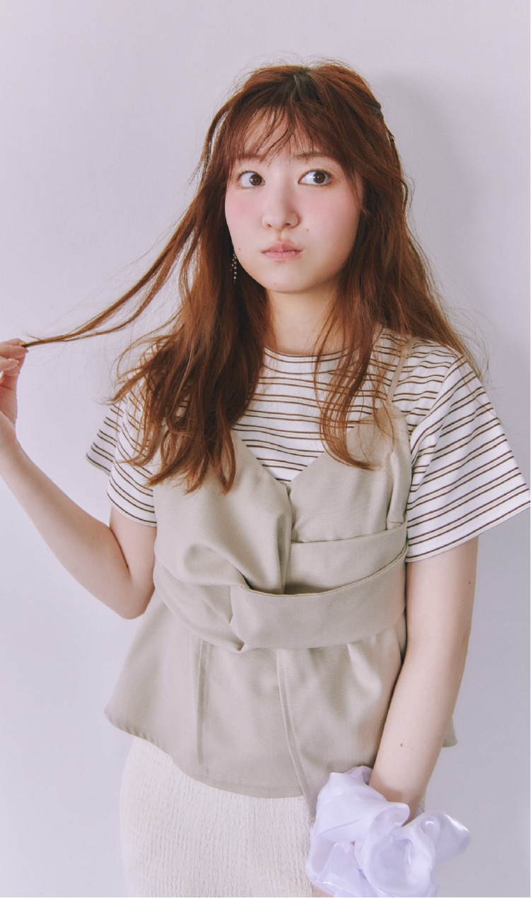 ブランド定番カップ付きインナーの形をベースに、カップの取り外しやアレンジが楽しめる紐のディテールをプラスして今っぽく。伸縮性があって着心地のいい素材なのもうれしいですよね。着用するとおへそ下ぐらいのちょうどいい丈感で、合わせるボトムスを選ばないのも◎。