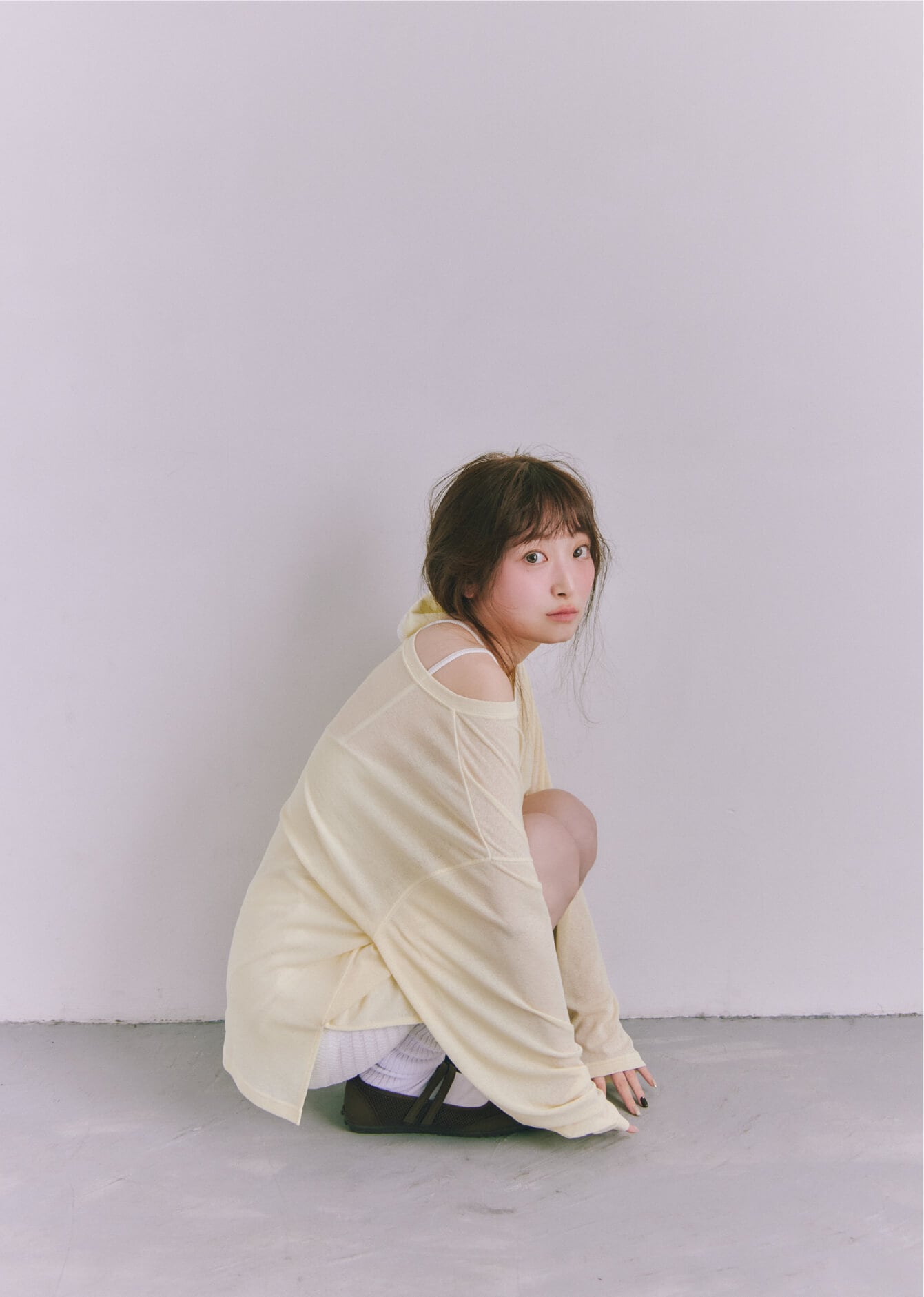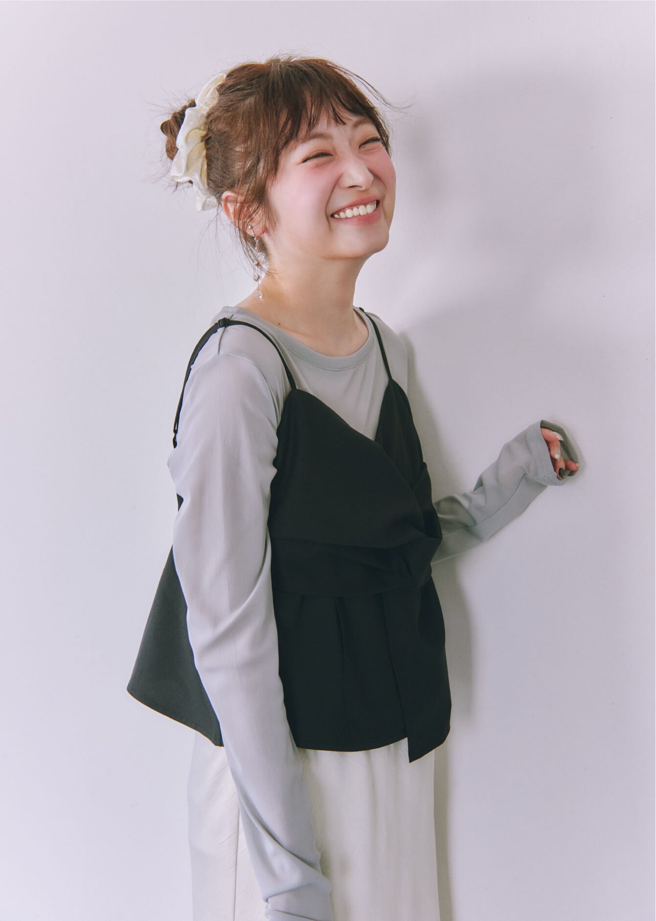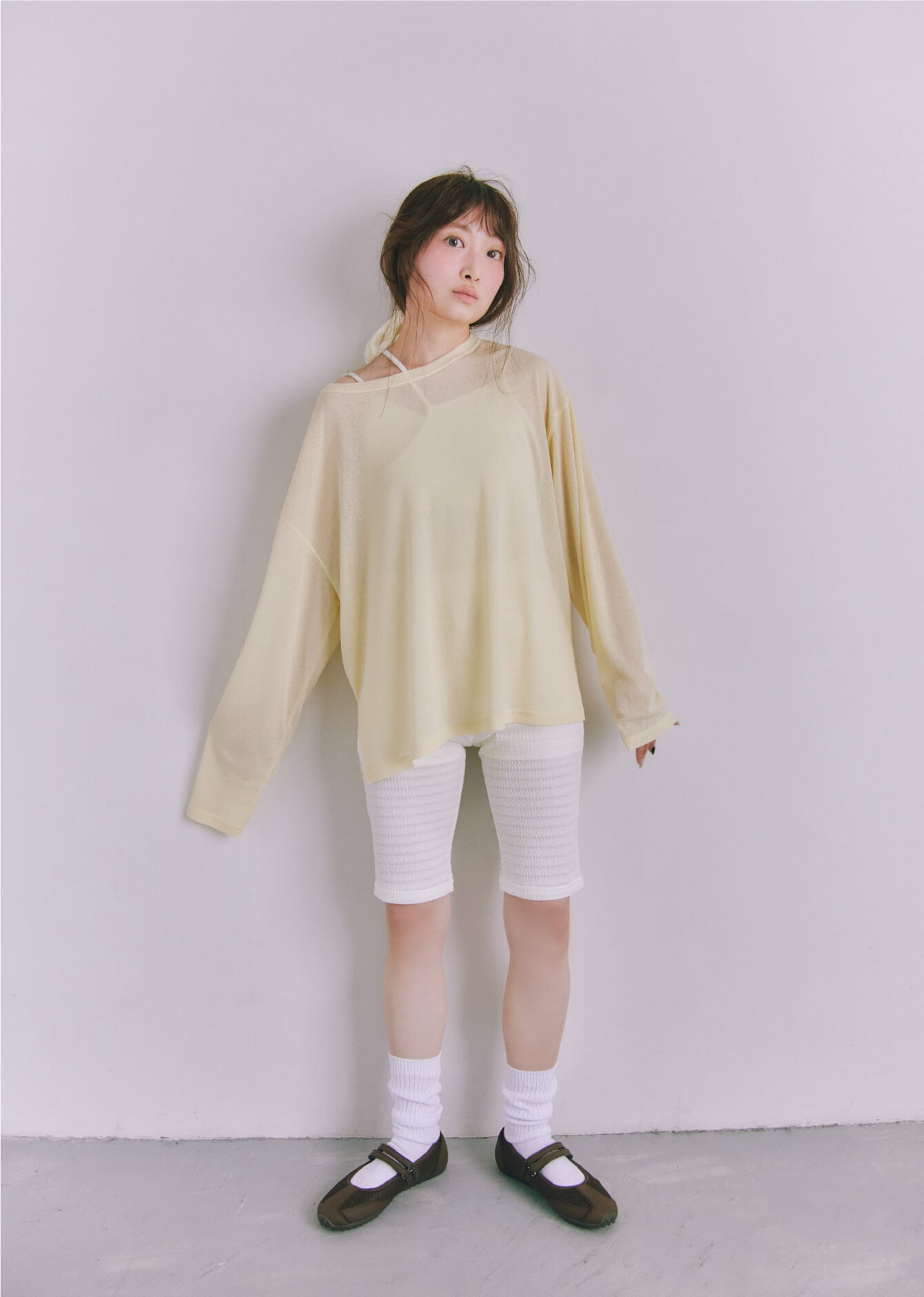 ブランド定番カップ付きインナーの形をベースに、カップの取り外しやアレンジが楽しめる紐のディテールをプラスして今っぽく。伸縮性があって着心地のいい素材なのもうれしいですよね。着用するとおへそ下ぐらいのちょうどいい丈感で、合わせるボトムスを選ばないのも◎。