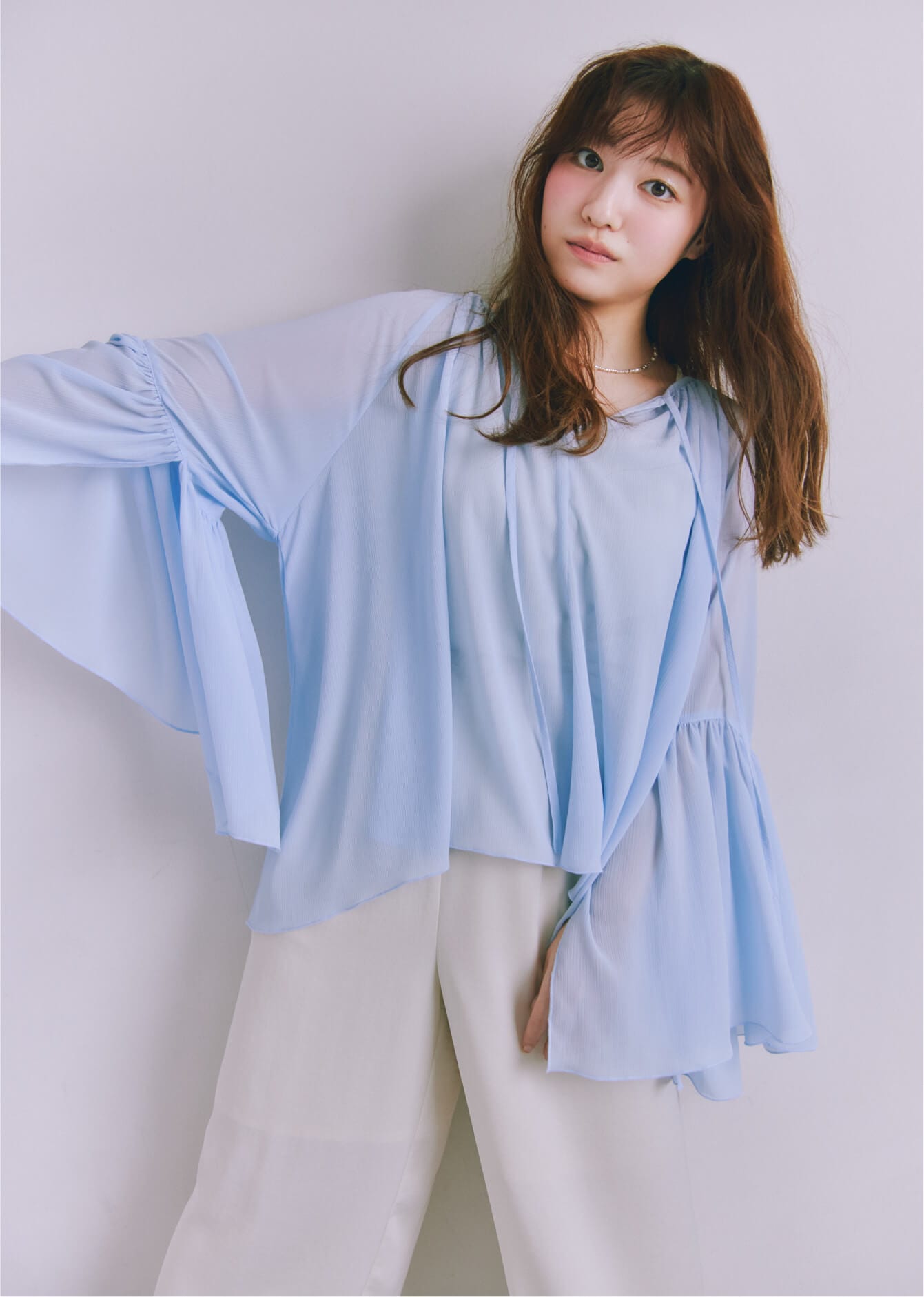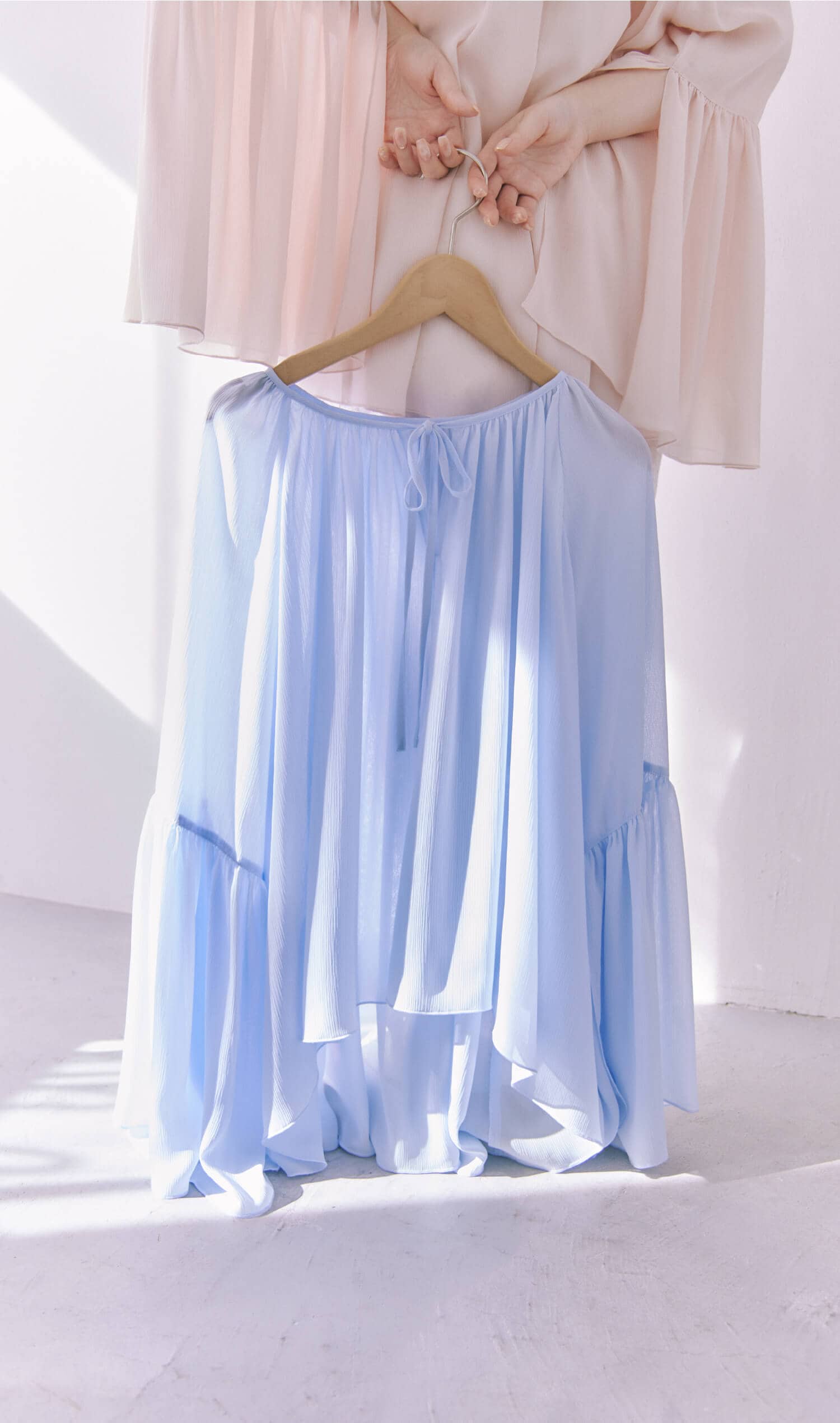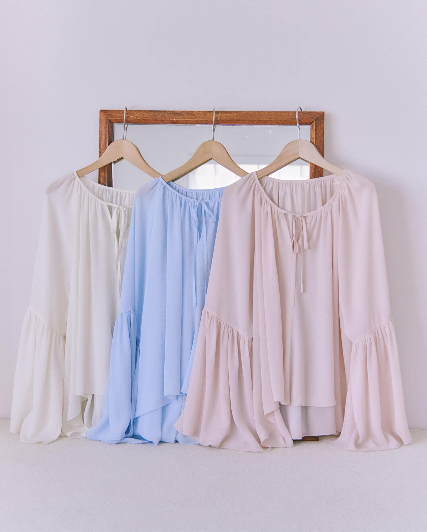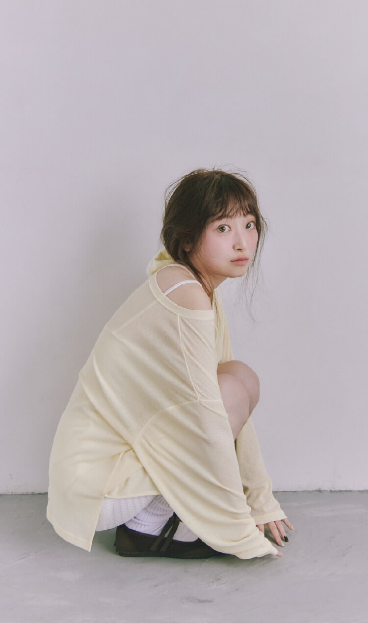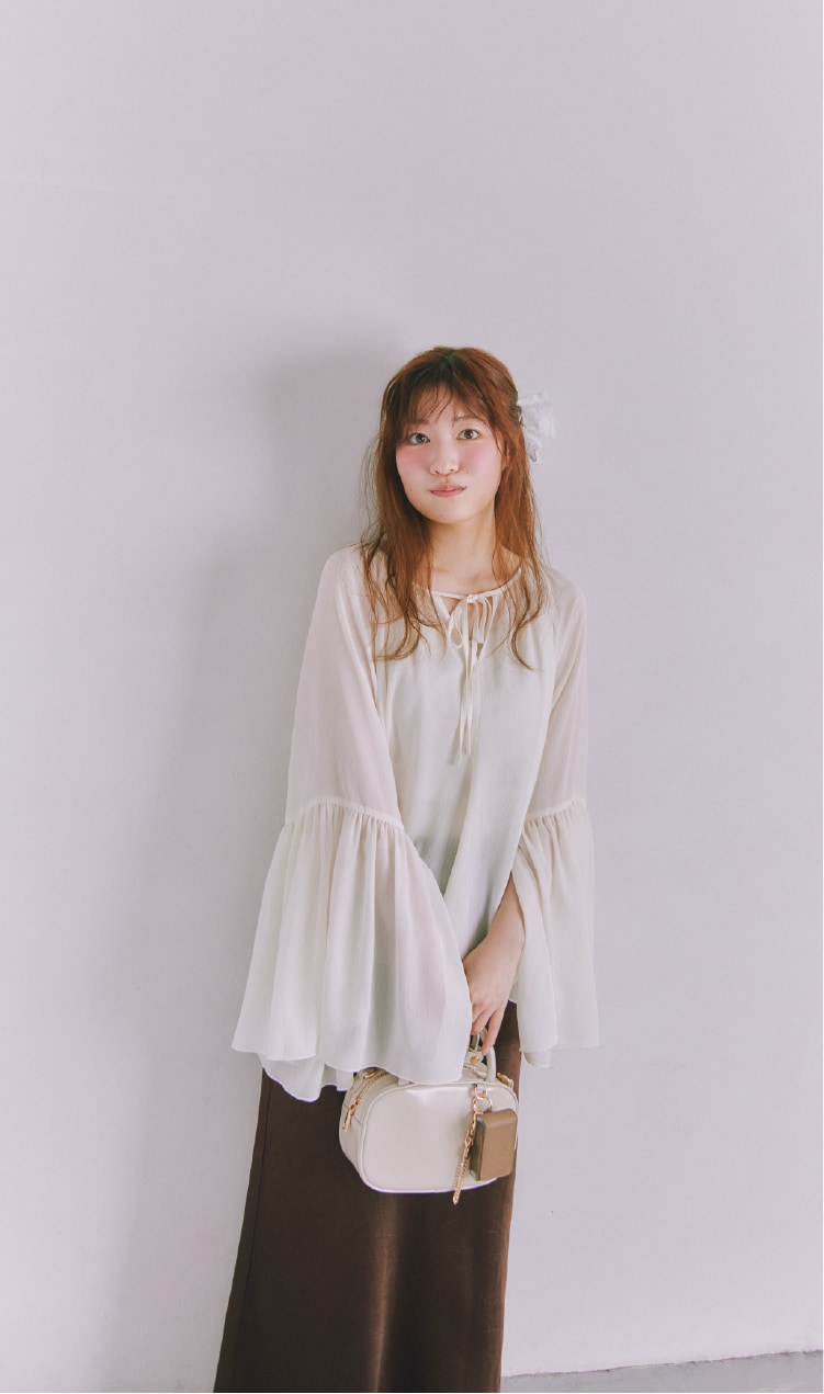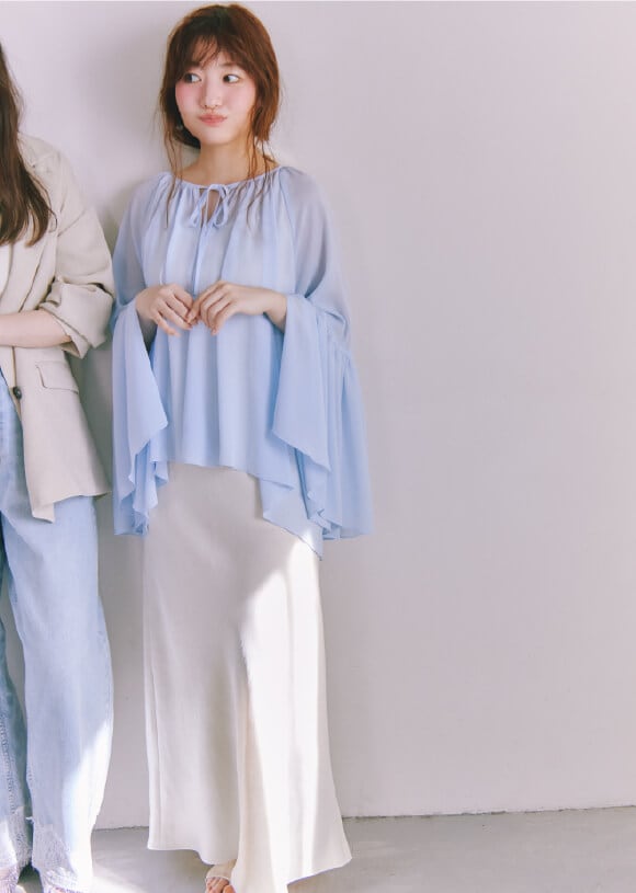 透け感がきれいなシアー素材のブラウス。肩を落としてオフショルにもできる2WAY仕様で、その日の気分に合わせて印象チェンジができます♡ ペールトーン系のワードローブにマッチするような淡いカラーリングにもこだわりました!
