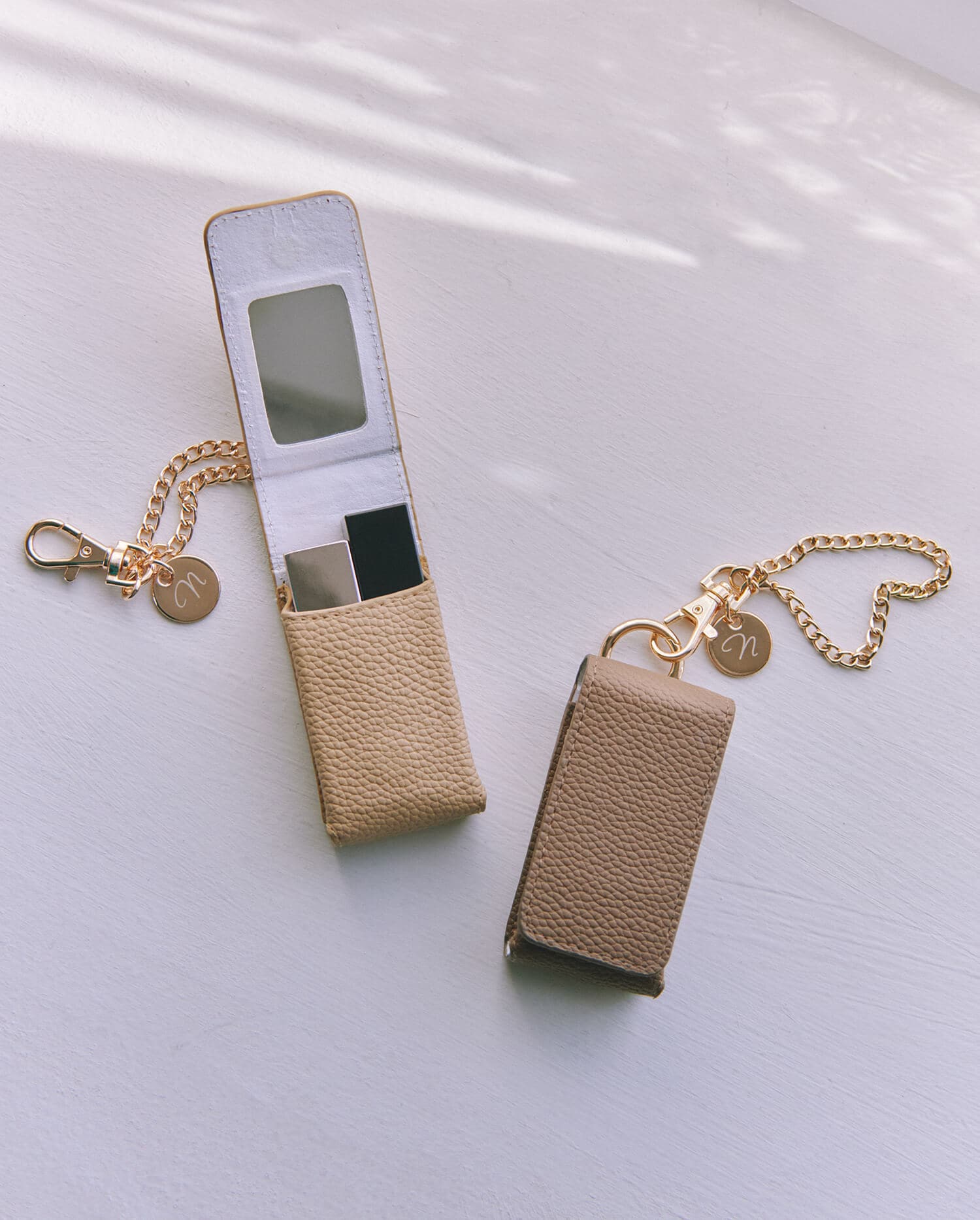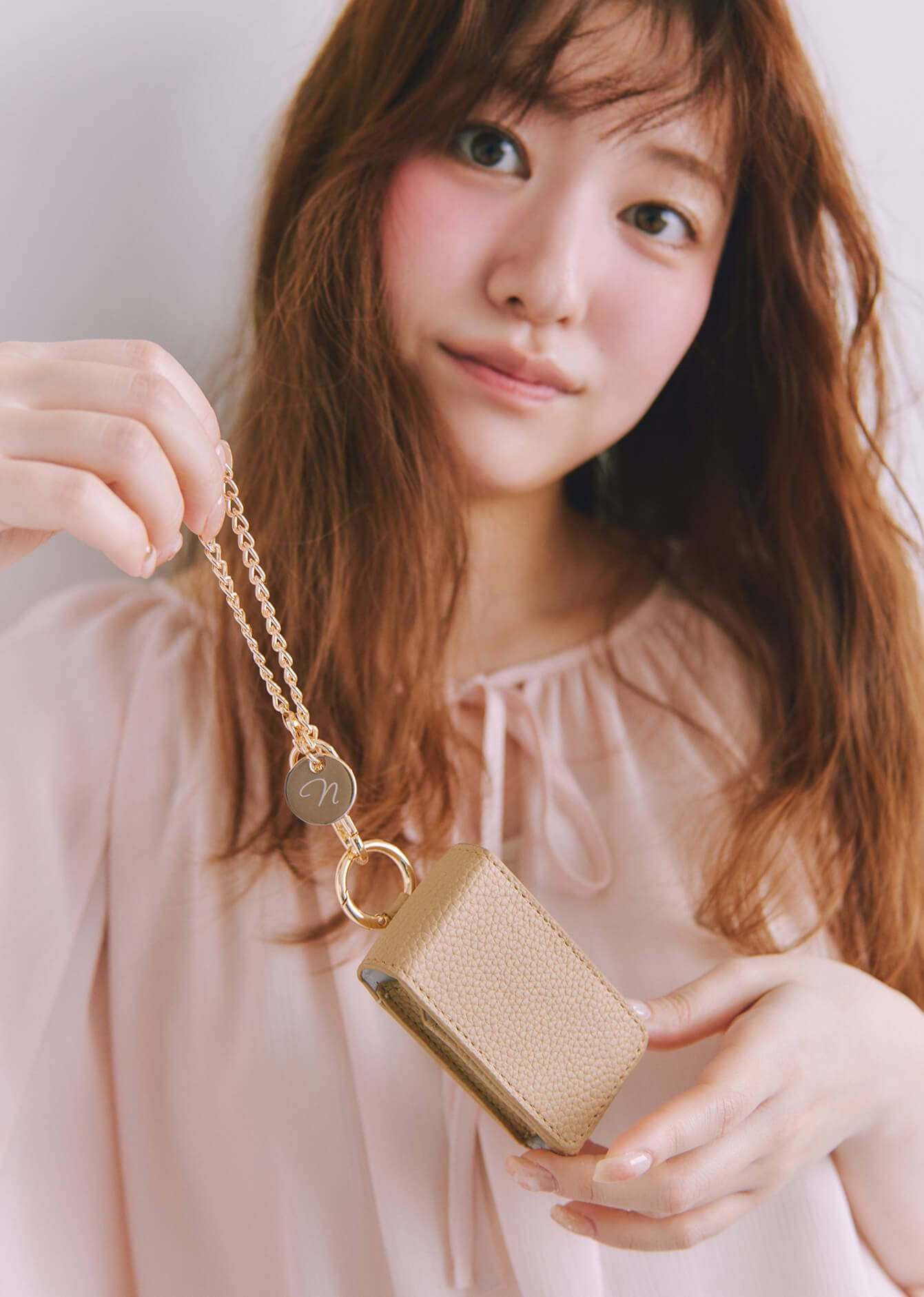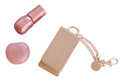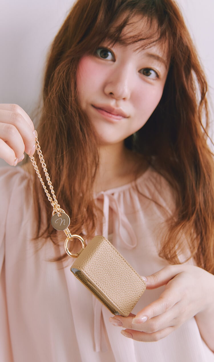 誰でも手にとりやすい小物を作りたくてリップケースをプロデュース! バッグに付けてチャームみたいに使ってもカワイイ。鏡付きだから、サッとお直しもできちゃいます。ゴールドのキーチェーンとさりげない“n”マークもお気に入り。