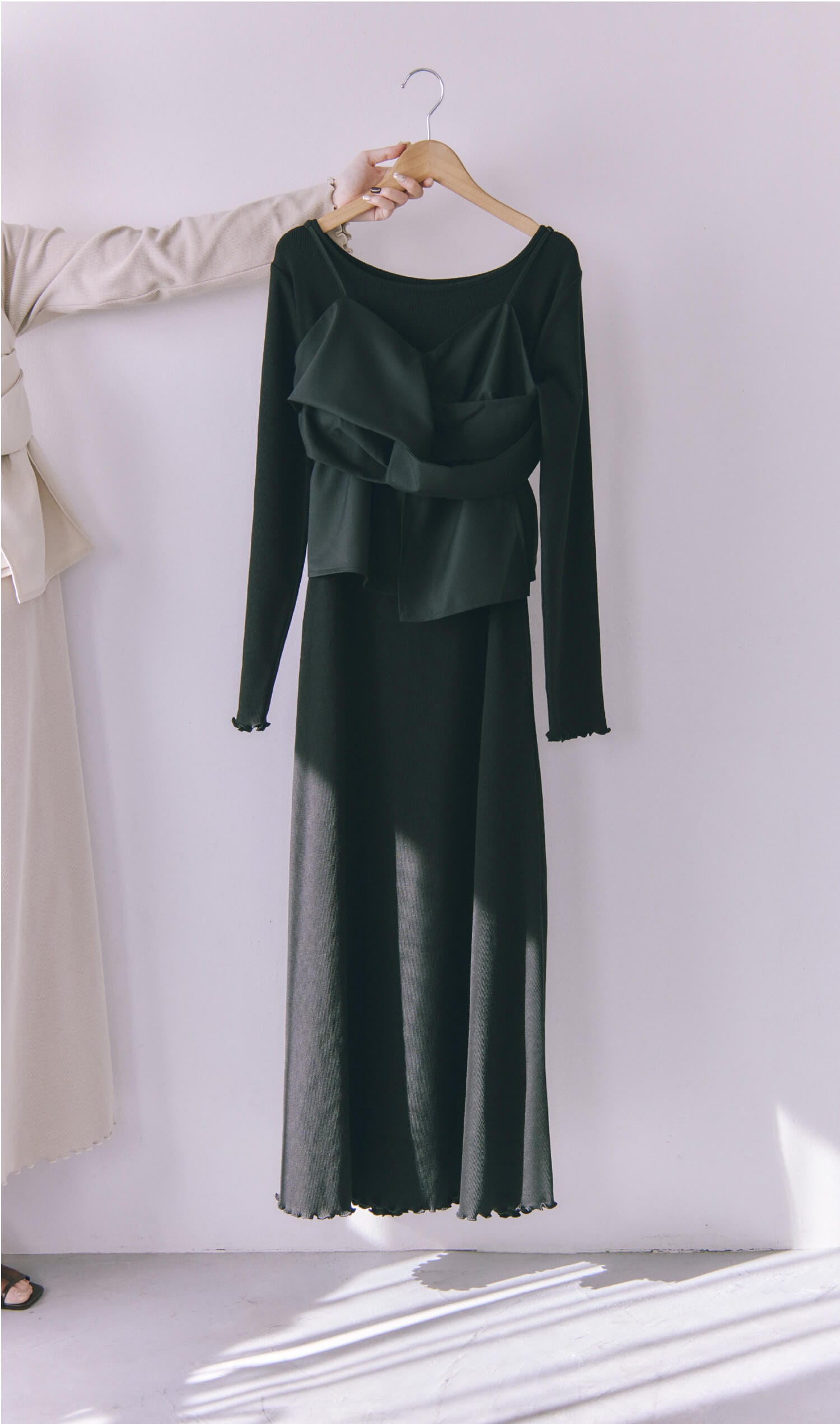 細見えが叶うシルエットを追求した美シルエットワンピース。デコルテの見え感や裾のバランスも細かく調整、ポケット付きなのもこだわりのひとつ。同色のビスチェは腰まわりをカバーできるペプラム丈に。セット使いがおすすめです♡
