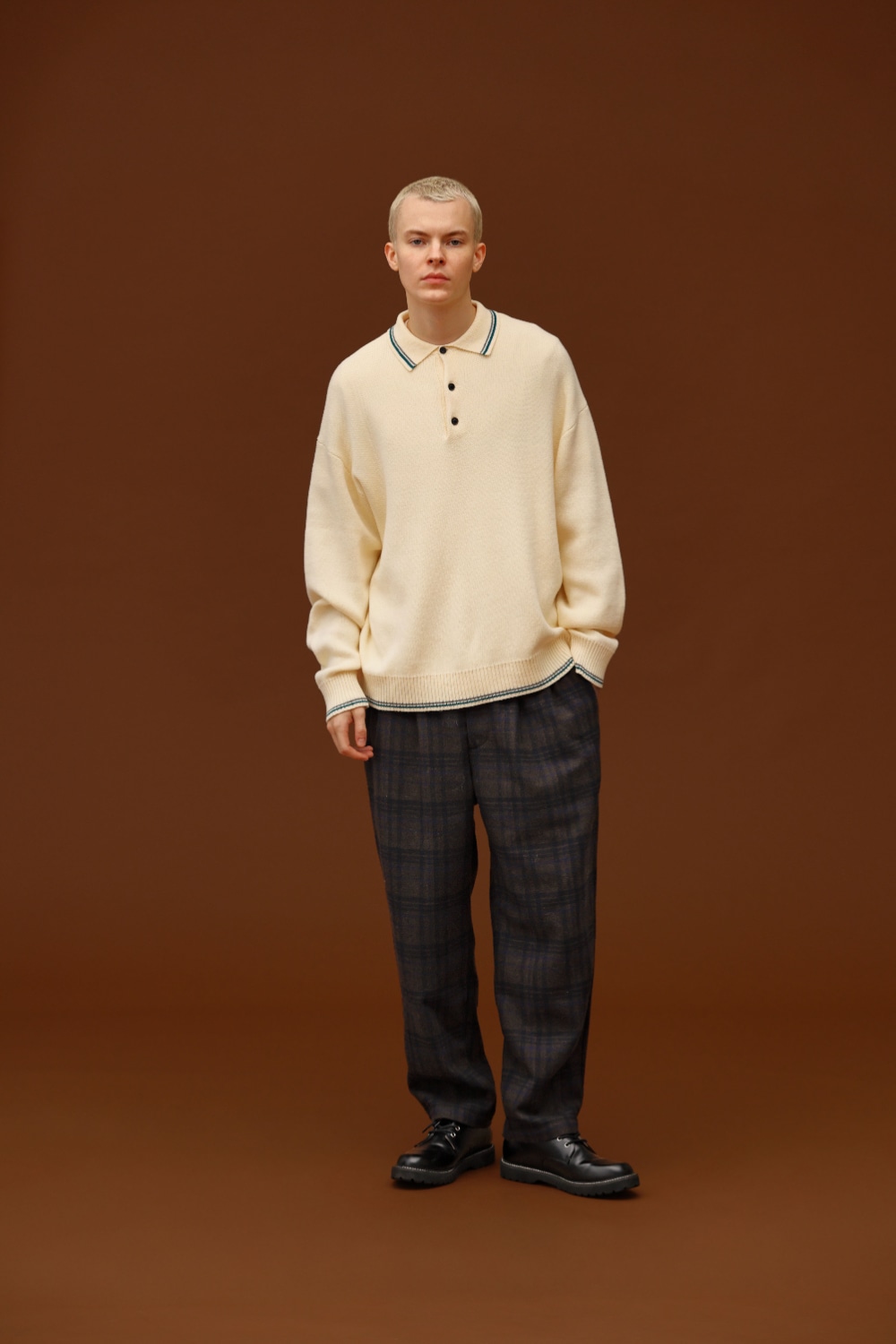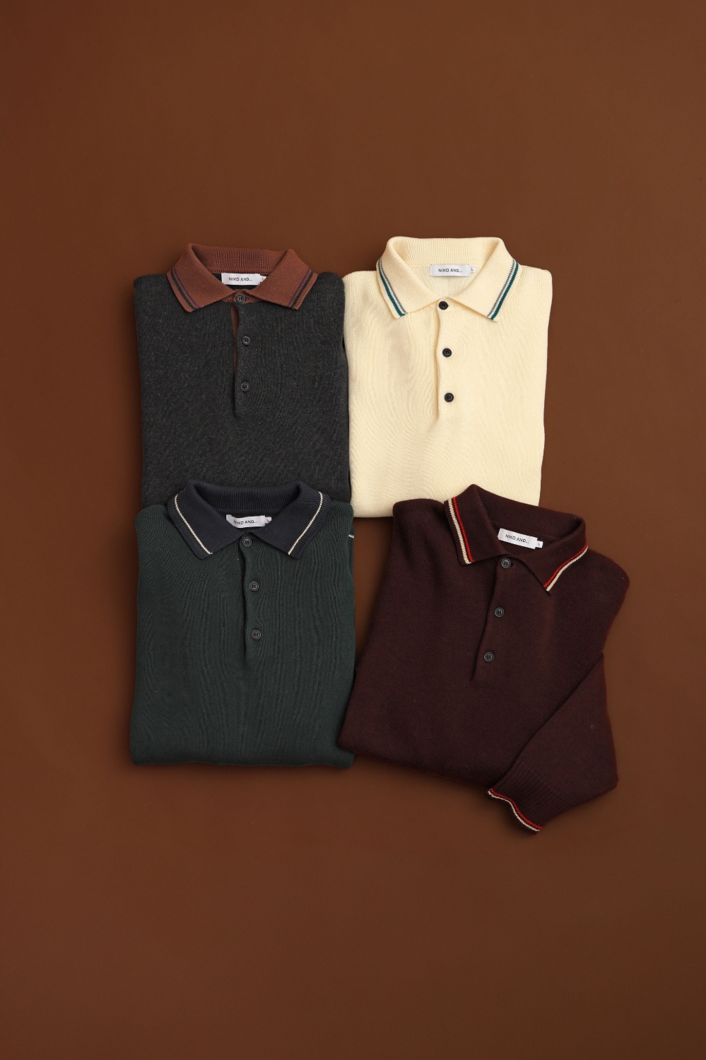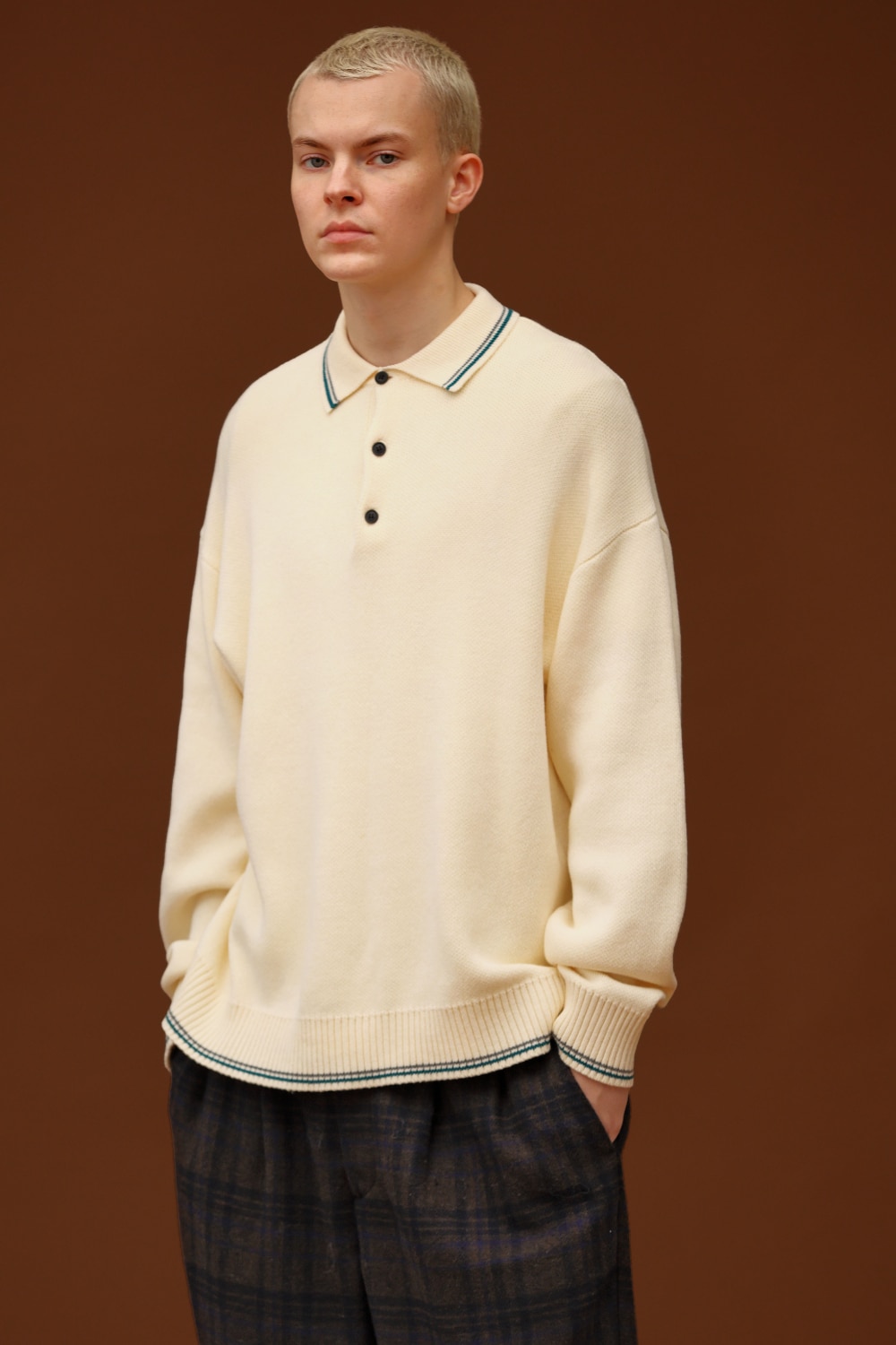 襟や袖口にライン柄を入れたワンポイントニットポロ。