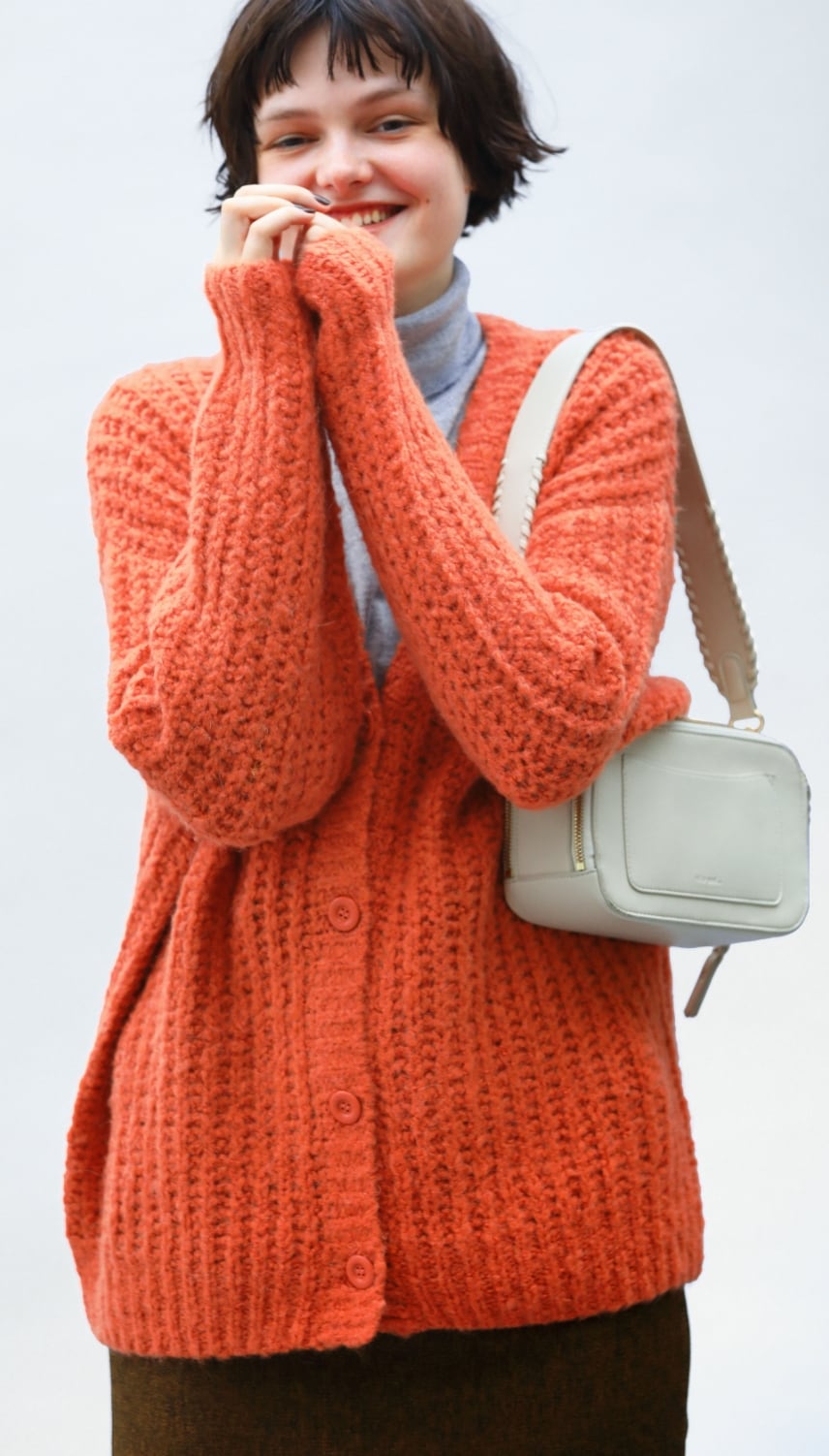 クラシックな雰囲気ながらも、軽い着心地が魅力のリバーチェスターコートが主役。ダークトーンの中にニットやマフラー、ミトンなどビビッドなオレンジカラーを効かせてメリハリのある着こなしに。