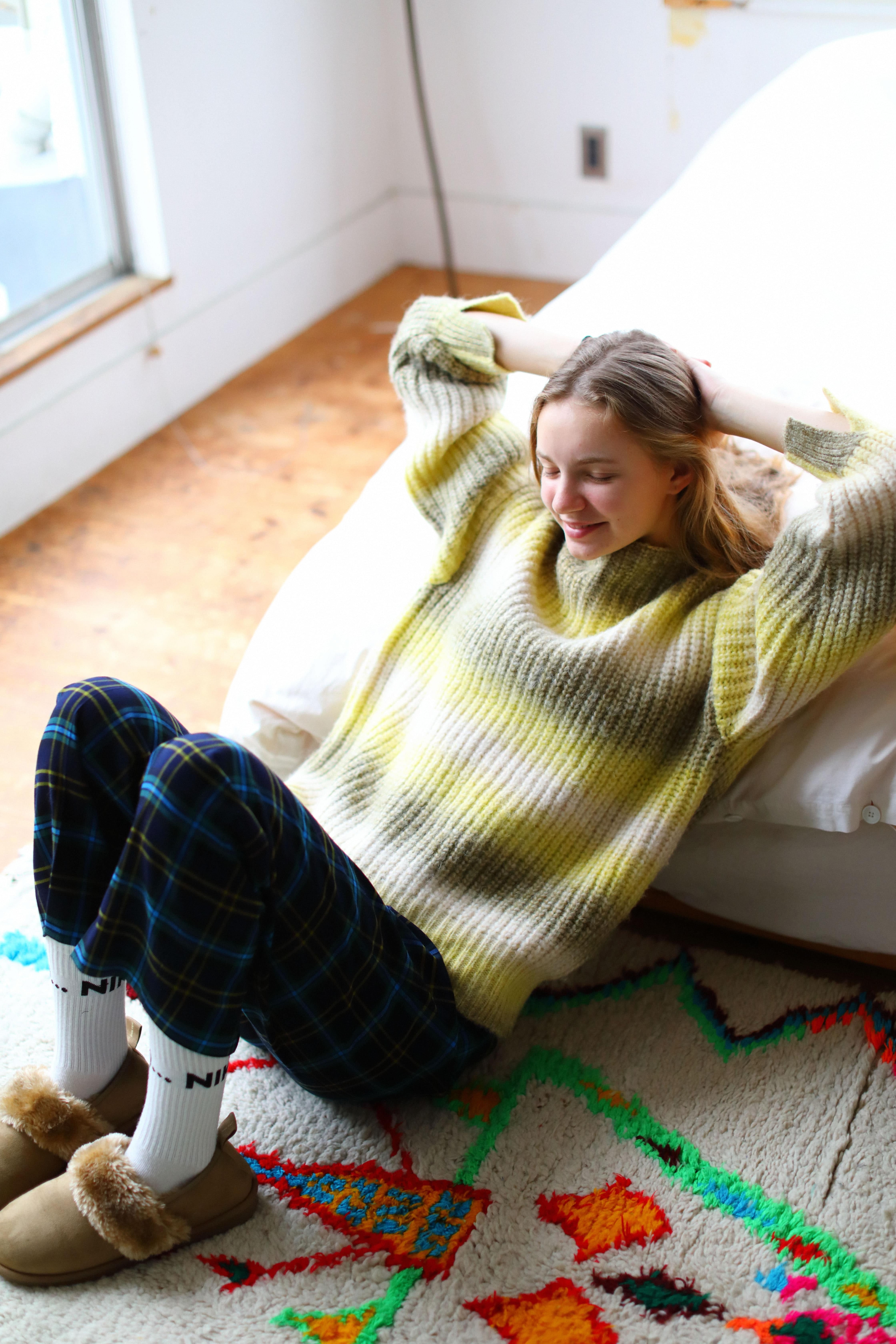 中綿ジャケットとボアベストがセットになったマルチアウター。ジャケットはリバーシブル仕様で、それぞれ一枚で着てもサマになる。色合いの鮮やかなマフラーを巻いて、華やかに。