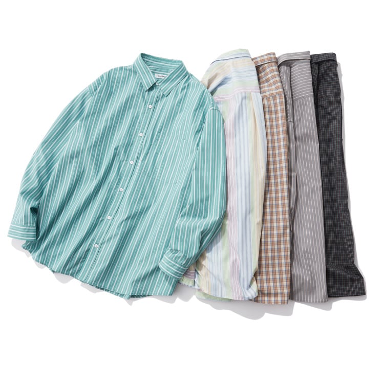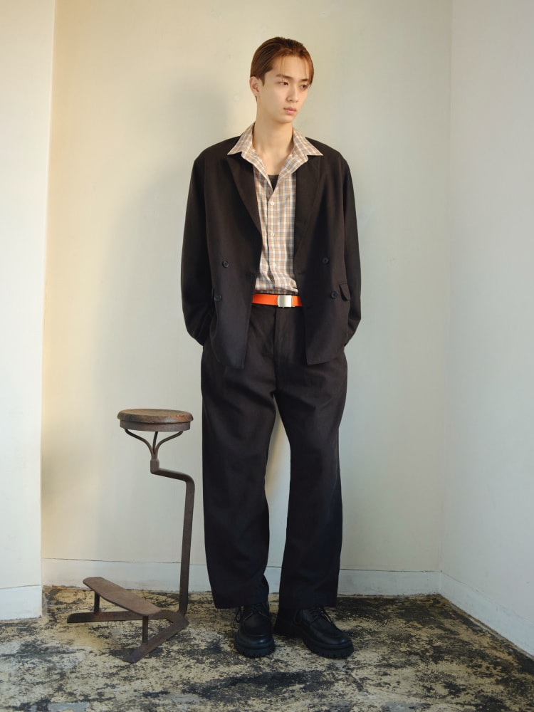 "かっちり”も”ゆるく”も着られる万能なチャコールのセットアップが登場。柔らかく仕上げたフェード感のあるダック地を利用し、武骨さを演出しながらも着心地は快適。ベージュのチェックシャツを重ねてクラシカルなルックに。