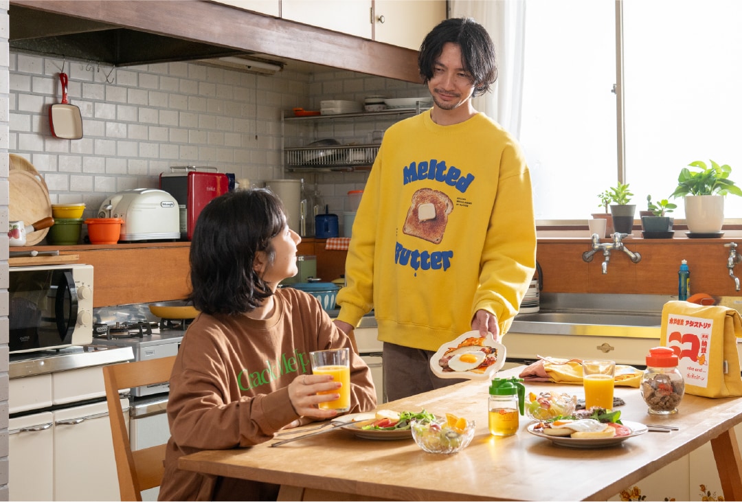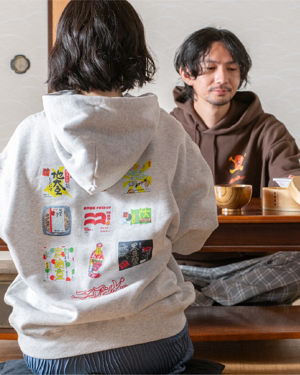 納豆をこよなく愛し、納豆にフォーカスした雑誌『納豆マガジン』までをも作ってしまう村上竜一さんが、2020年に立ち上げたアパレルブランド。デザインのモチーフとなるのは、もちろん納豆。そんな関西発の特異なブランドとコラボレーションして作ったのは、日本の朝ごはんを豊かにするプロダクトたちです。
