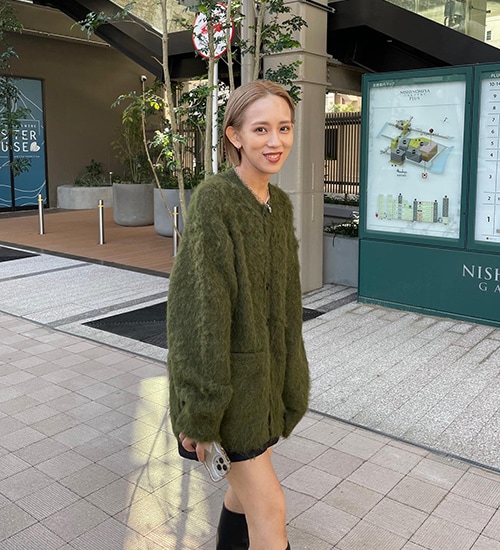 ホリデー気分を高めてくれるエコファーコートを主役にしたコーディネート。 playの華やかな香りを合わせれば、年末のイベントにぴったりの特別感ある着こなしに。