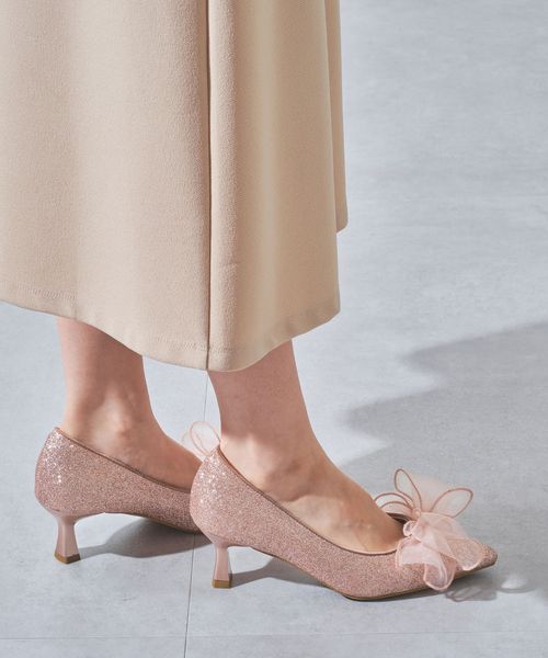 【予約】チュールリボン×グリッター ヒールパンプス /MOR113