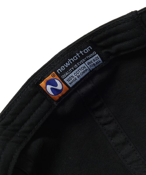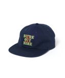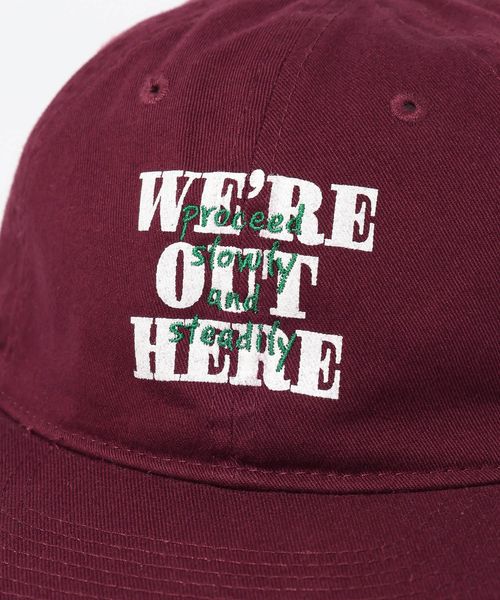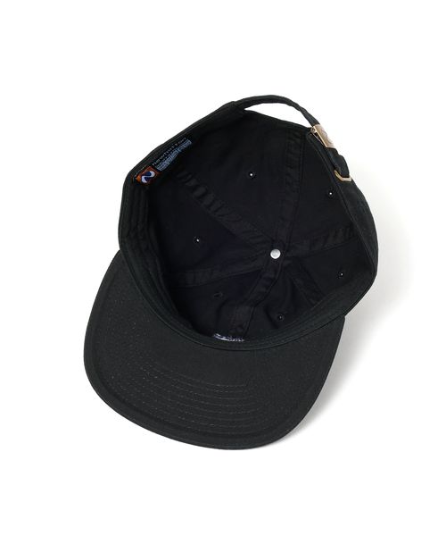 フロントにプリントに刺繍を重ねたロゴを施したキャップ。