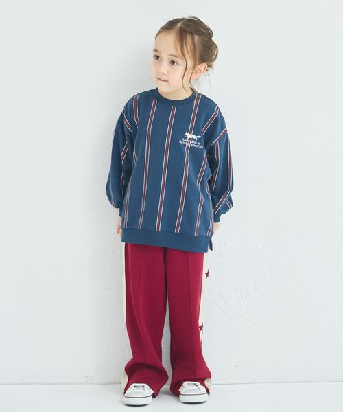 【サラッとスウェット】ユニセックス きつね刺繍 ストライプ裏毛トレーナー