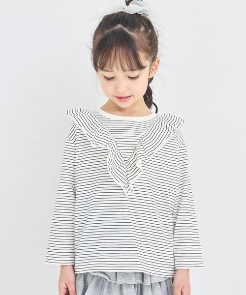 【綿100%】ガールズ Vフリル カラーボーダーロンT